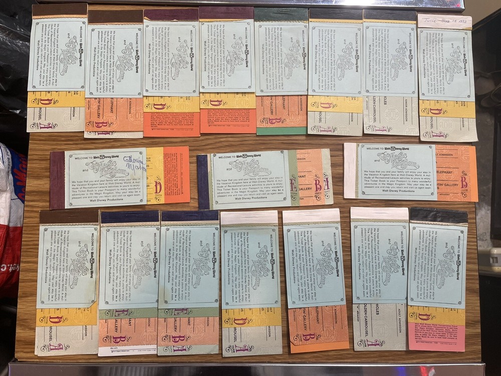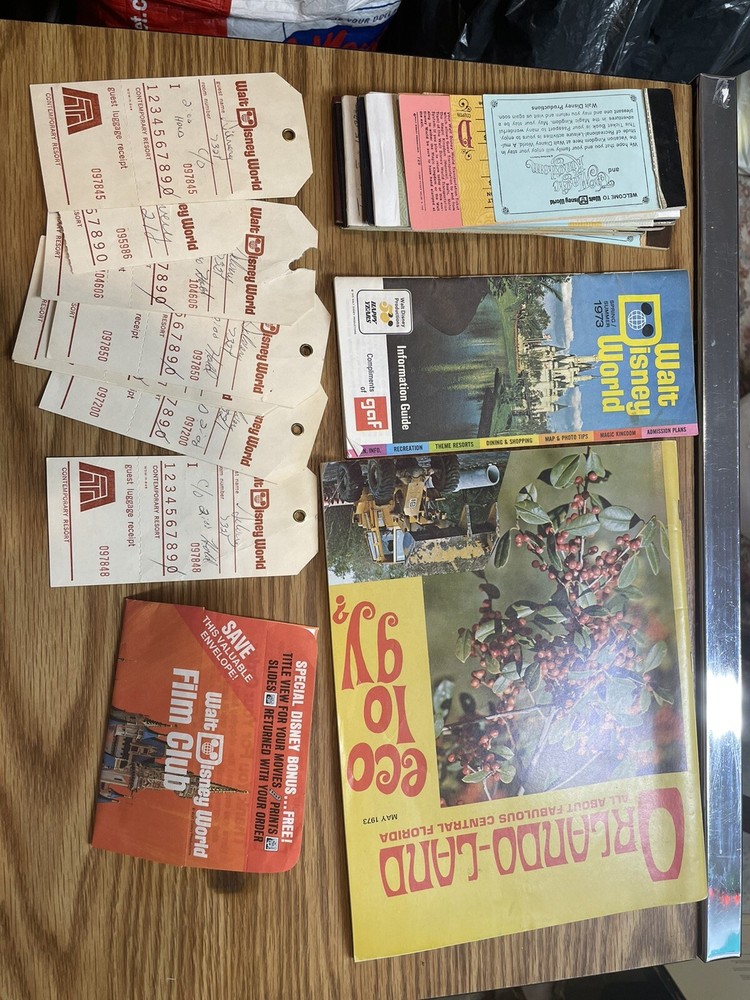 Lot of 18 vintage partially used Disney World Magic Kingdom Adventure Coupon booklets, Child, Junior, and Adults. Also a Walt Disney World information guide from Spring/Summer 1973, some Disney World luggage tags and a few extras.