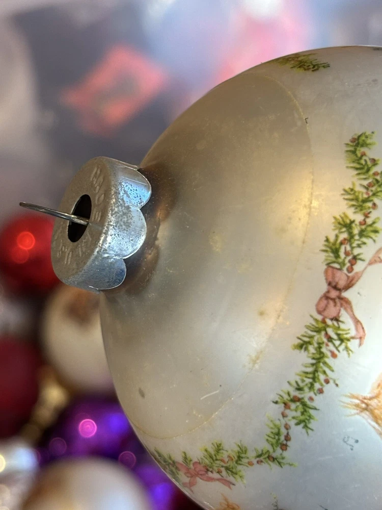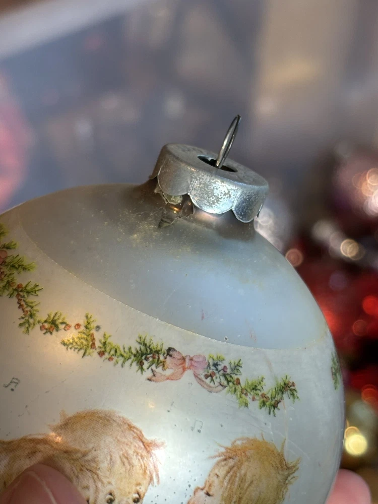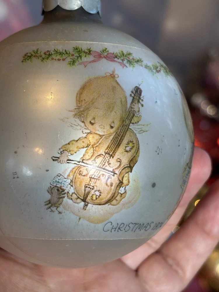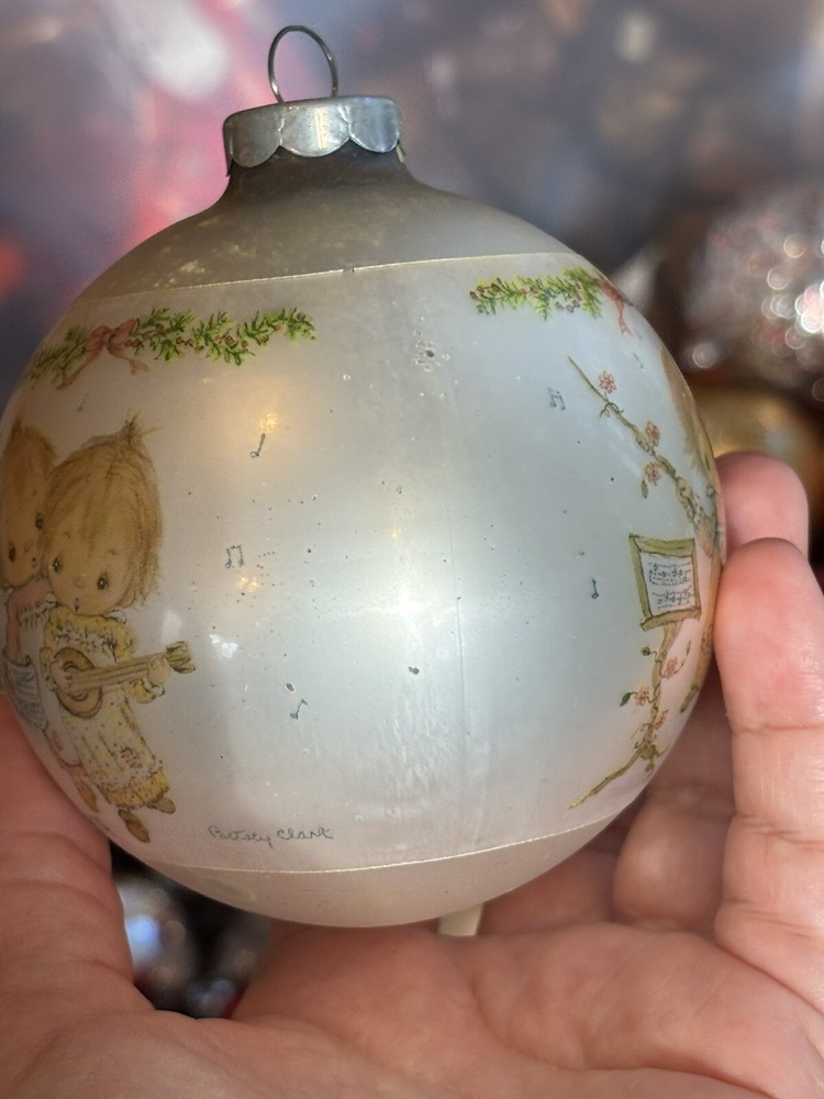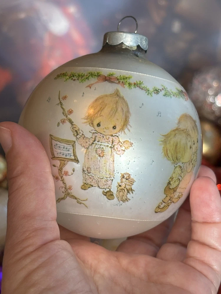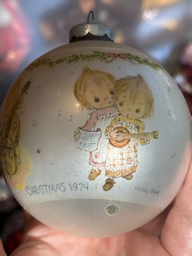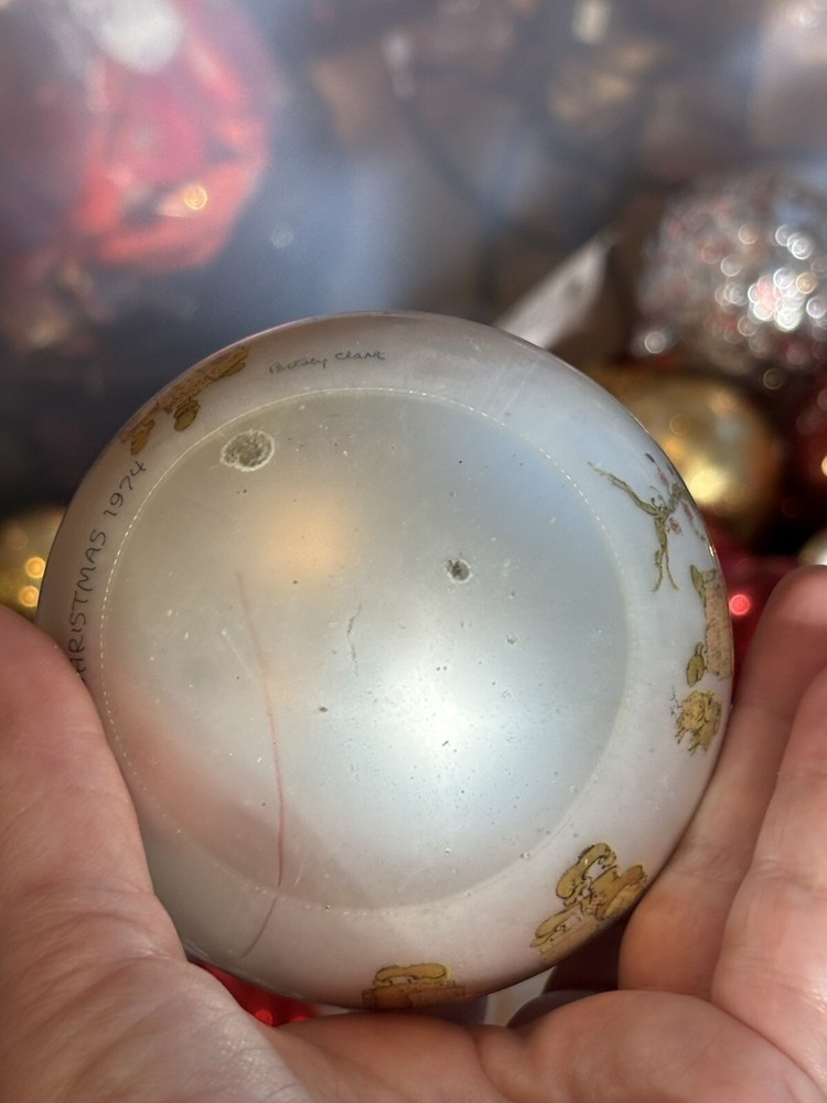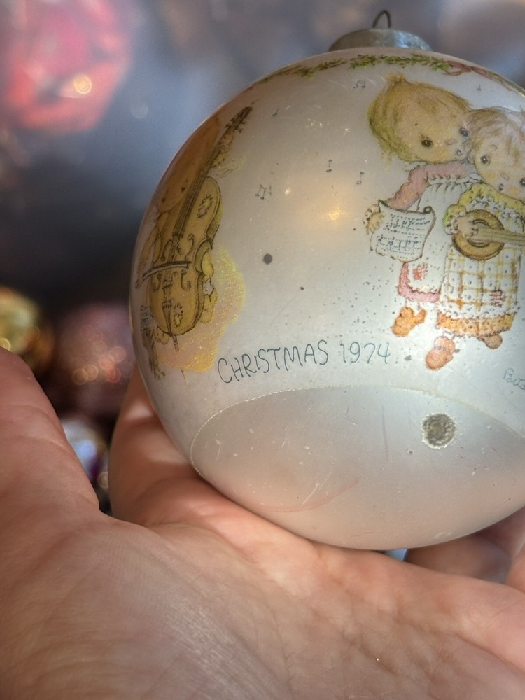 This is a vintage Hallmark Christmas Ball ornament from 1974 featuring a Mary Hamilton design. The ornament is round in shape, large in size, and made of glass. It is multicolored and depicts a character named Marie. This collectible item is part of the Hallmark Keepsake collection and has a Christmas theme. It is an original piece from the United States, perfect for a multipurpose recipient during the holiday season. Vintage pieces, over 50 years old. Normal scuffs, age discoloration