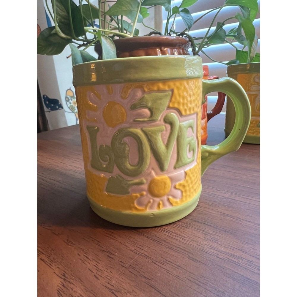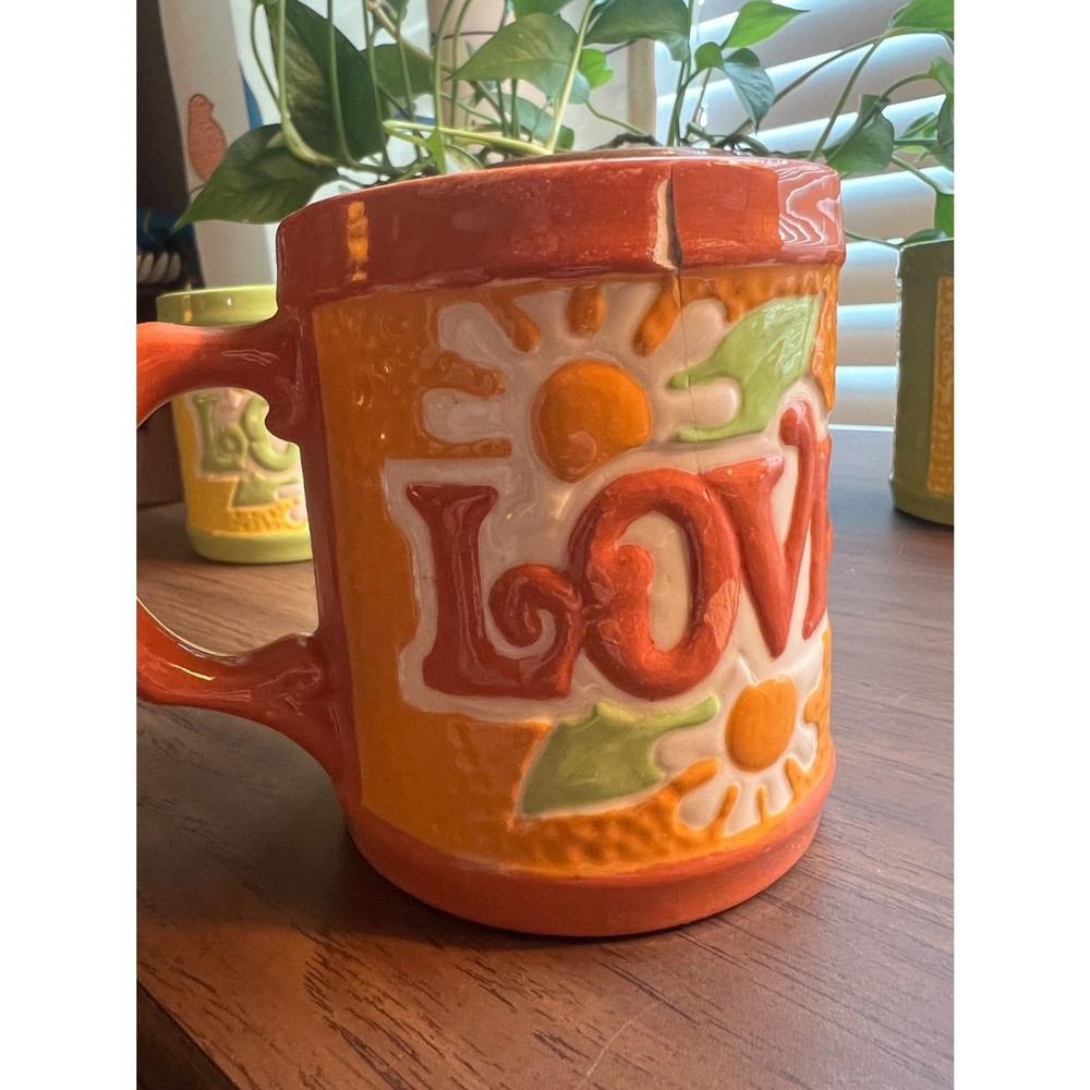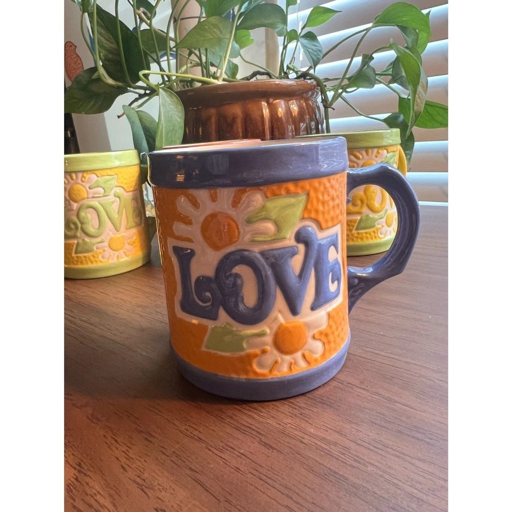 Get your groove on with this fantastic set of four vintage "LOVE" mugs, dated 1976! These iconic mugs are a perfect blast from the past and the ultimate symbol of the 1970s Flower Power era. They are perfect for your morning coffee or for adding a pop of retro cheer to your kitchen shelf. IMPORTANT CONDITION NOTE: This is a listing for a lot of four mugs. Three of the mugs (lime green, yellow, and blue) are in excellent condition. The fourth (orange) mug has a significant crack and is included for display purposes only to complete the look of the set. Please see all photos and read the full condition description below. Each heavy ceramic mug features the word "LOVE" in a bubbly, raised font, surrounded by cheerful daisies and suns against a textured background. These appear to be handmade studio pottery pieces, with at least one being signed and dated "1976" on the bottom. This set includes four mugs in vibrant color combinations: Lime Green & Yellow Orange & Red (Cracked) Yellow & Green Blue & Orange Details: Style: 1970s Retro, Hippie, Flower Power, BOHO Material: Heavy Ceramic / Studio Pottery Dated: 1976 Approx. Dimensions: 4 inches tall with a 3.25-inch opening. Condition: Lime Green, Yellow, & Blue Mugs: All three are in excellent vintage condition with no chips, cracks, or crazing. Orange Mug: This mug has a visible crack running from the rim down through the front, as clearly shown in the photos. It is not recommended for holding hot liquids but makes a perfect decorative piece to complete the set's look. A must-have for any collector of 70s retro decor or anyone who wants to add a little peace and love to their daily routine!
