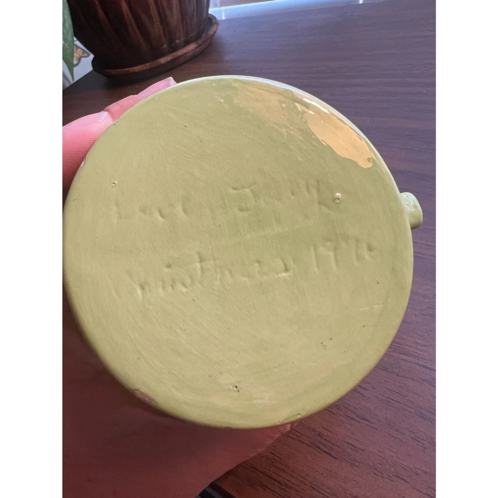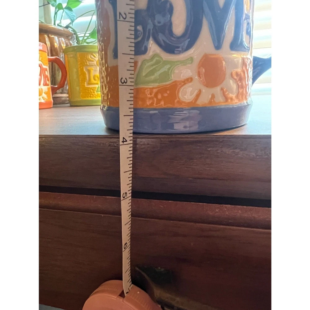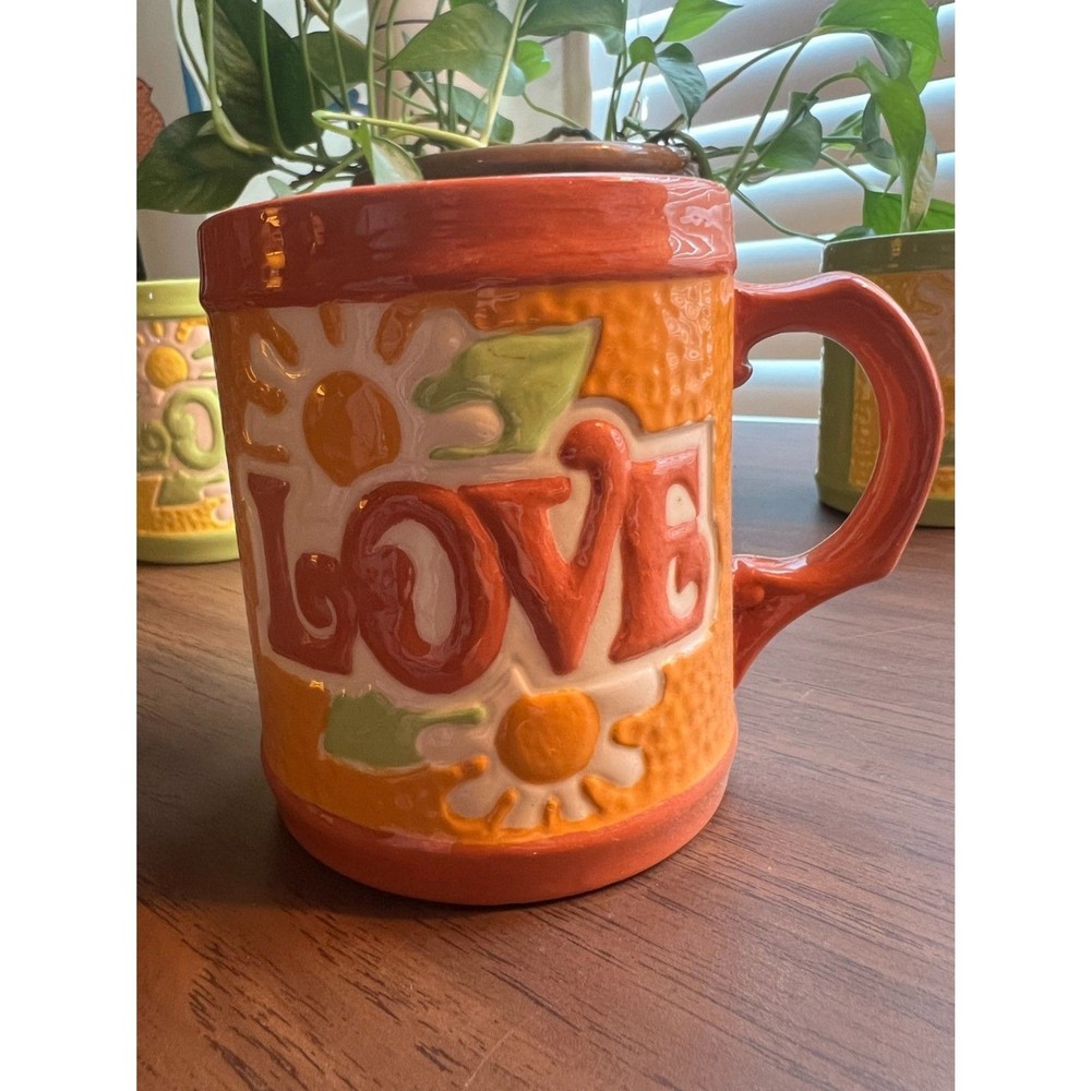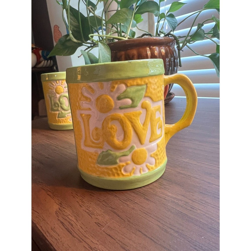 Get your groove on with this fantastic set of four vintage "LOVE" mugs, dated 1976! These iconic mugs are a perfect blast from the past and the ultimate symbol of the 1970s Flower Power era. They are perfect for your morning coffee or for adding a pop of retro cheer to your kitchen shelf. IMPORTANT CONDITION NOTE: This is a listing for a lot of four mugs. Three of the mugs (lime green, yellow, and blue) are in excellent condition. The fourth (orange) mug has a significant crack and is included for display purposes only to complete the look of the set. Please see all photos and read the full condition description below. Each heavy ceramic mug features the word "LOVE" in a bubbly, raised font, surrounded by cheerful daisies and suns against a textured background. These appear to be handmade studio pottery pieces, with at least one being signed and dated "1976" on the bottom. This set includes four mugs in vibrant color combinations: Lime Green & Yellow Orange & Red (Cracked) Yellow & Green Blue & Orange Details: Style: 1970s Retro, Hippie, Flower Power, BOHO Material: Heavy Ceramic / Studio Pottery Dated: 1976 Approx. Dimensions: 4 inches tall with a 3.25-inch opening. Condition: Lime Green, Yellow, & Blue Mugs: All three are in excellent vintage condition with no chips, cracks, or crazing. Orange Mug: This mug has a visible crack running from the rim down through the front, as clearly shown in the photos. It is not recommended for holding hot liquids but makes a perfect decorative piece to complete the set's look. A must-have for any collector of 70s retro decor or anyone who wants to add a little peace and love to their daily routine!
