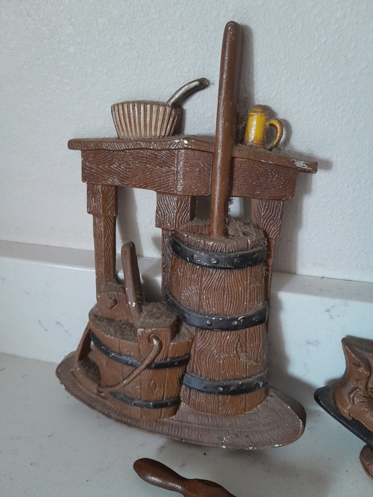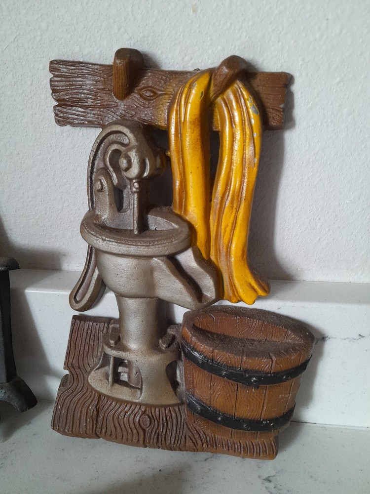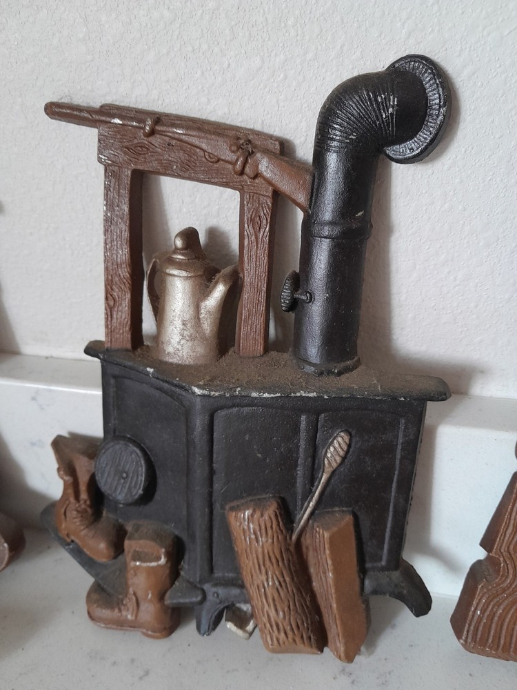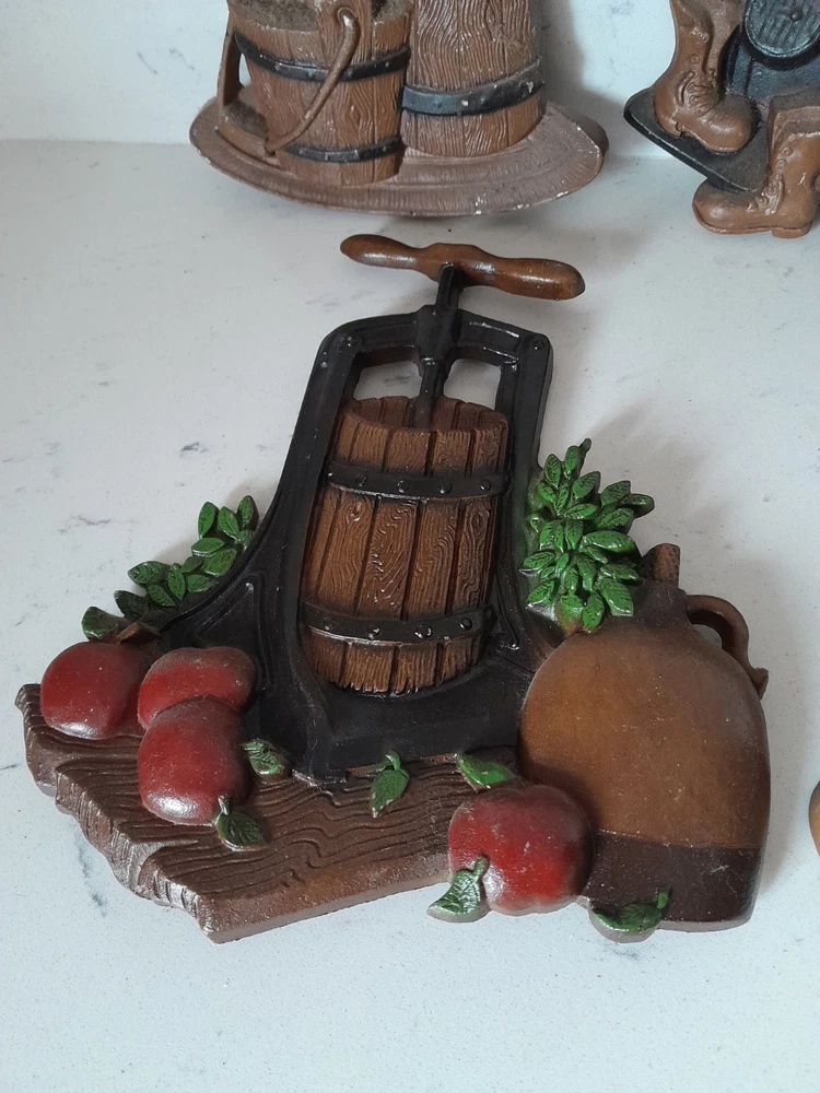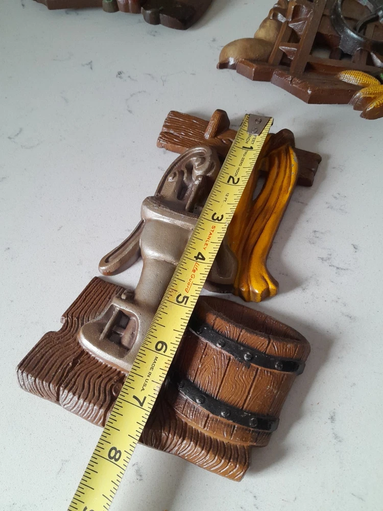 The product is a set of five vintage metal aluminum wall art pieces from 1976 by Sexton & Homco. These decorative plaques feature a cast aluminum design in multicolor, depicting a vintage country theme with elements of a farmhouse, cabin, and barn. The wall-mounted plaques are 7 inches tall and 6 inches wide, perfect for adding a touch of rustic charm to any room in your home, such as the kitchen or dining room. Made in the USA, these pieces showcase a metallic finish and are ideal for those looking to enhance their space with a touch of country and western decor. All very good condition