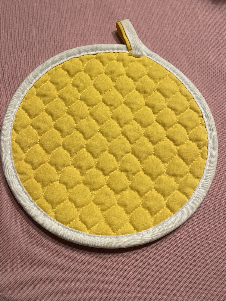 Never used. Excellent condition. 9” round. Yellow back. Quilted.