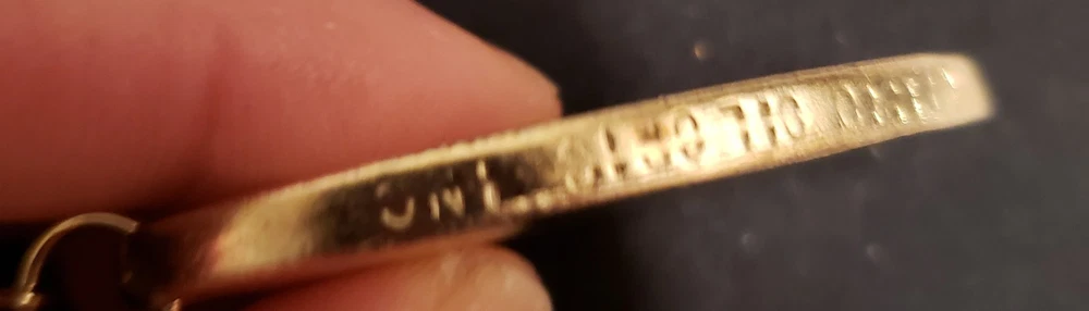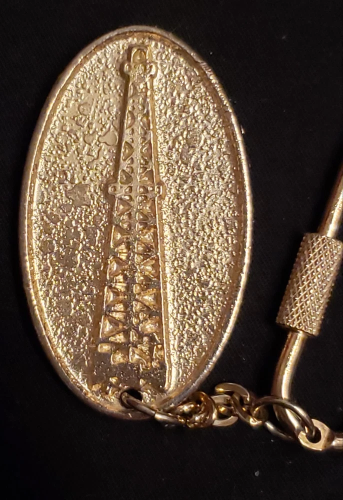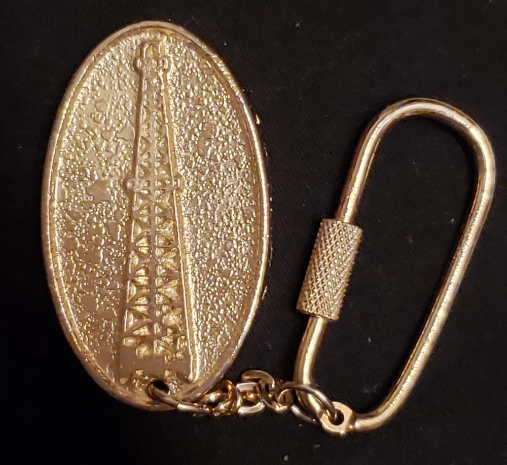 This vintage 1980 key chain features a gold color oil rig design with a detachable keyring and engraving. It is made of stainless steel and is part of the oil industry character family.