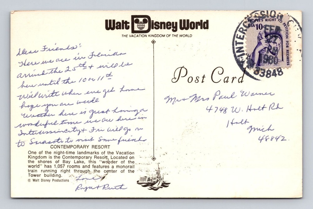 Absolutely love this vintage Disney postcard! The retro design takes me right back to the magic of the '80s Contemporary Resort. Seller ships fast and packages items with care—perfect for collectors. Great deal, especially when buying multiple postcards to save on shipping. Highly recommend!