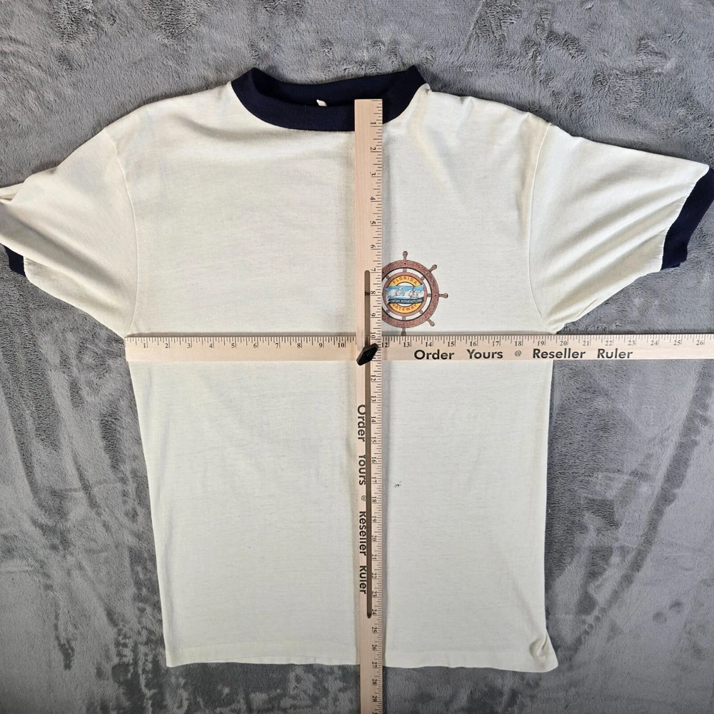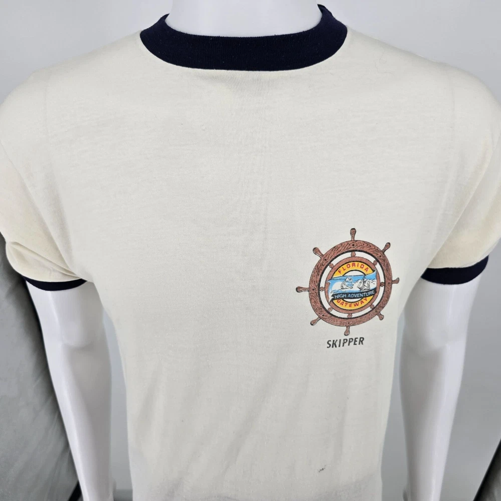 🔹 Item Details: Brand: Unknown (tag illegible) Material: Unknown (feels like cotton/poly blend) Color: White/Off-White/Cream with Navy Trim Decade of Manufacture: 1980s (1980 or 1981- see research notes) Country of Manufacture: Unkown (almost certainly USA) Notable Features: Single Stitch Hem, Ringer Cuffs and Collar Research Notes: The Florida Gateway Highway Adventure Base was opened by the Boy Scouts of America in 1980. It was only called the Gateway High Adventure Base for two years before the name was changed to Florida High Adventure Sea Base. It's now known as just "Sea Base." 🔹 Condition Notes: Good used vintage condition. Tag illegible. Visible dark marks/staining on front of shirt beneath logo. Marking/staining on back of shirt at left side of bottom hem. Light to moderate fabric wear throughout. See photos. 🔹 Size Notes: Vintage Tag Size: Unknown Modern Measured Size: Medium (39) 🔹 Measurements (Approximate): Chest (pit to pit): 39 inches Collar to Hem: 27 inches 🔹 Shipping & Returns: Ships worldwide from Lexington, KY. Ships within 3 business days of purchase. Returns accepted within 60 days for domestic orders and 30 days for international orders.