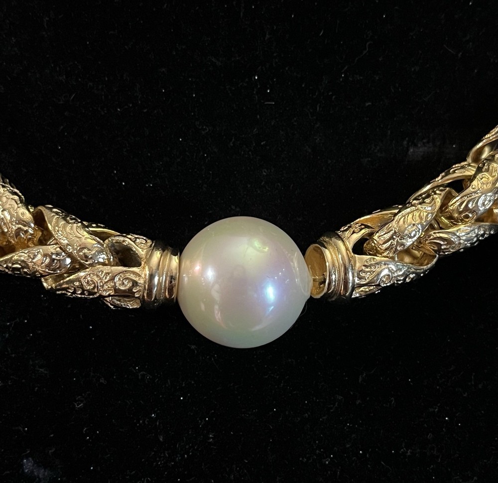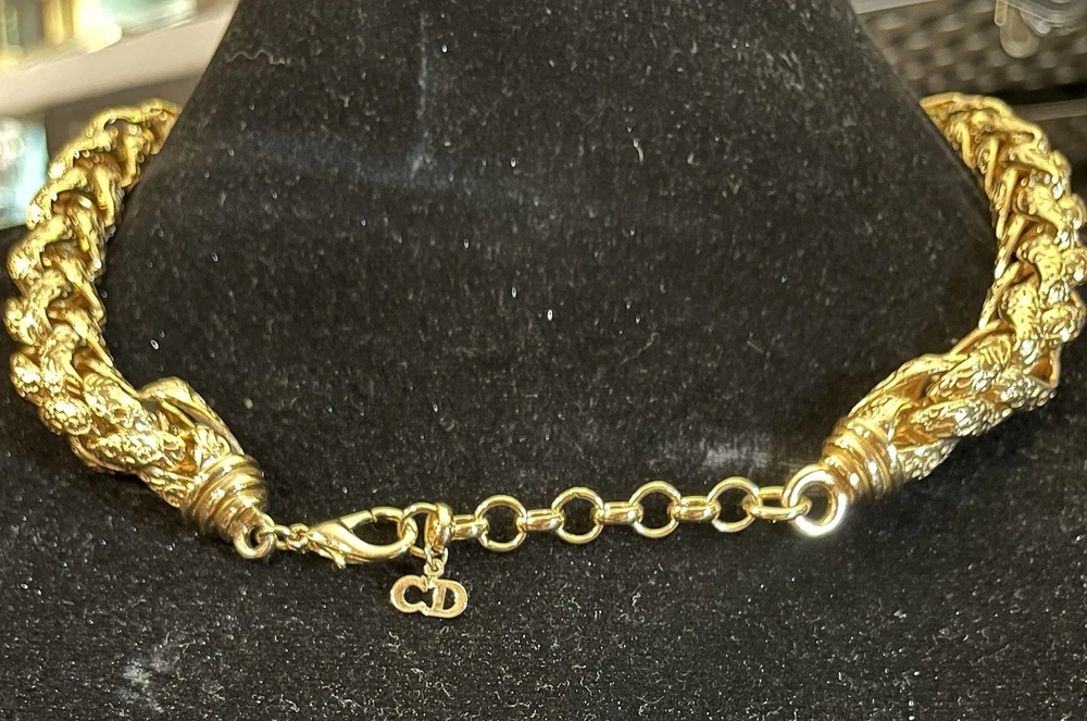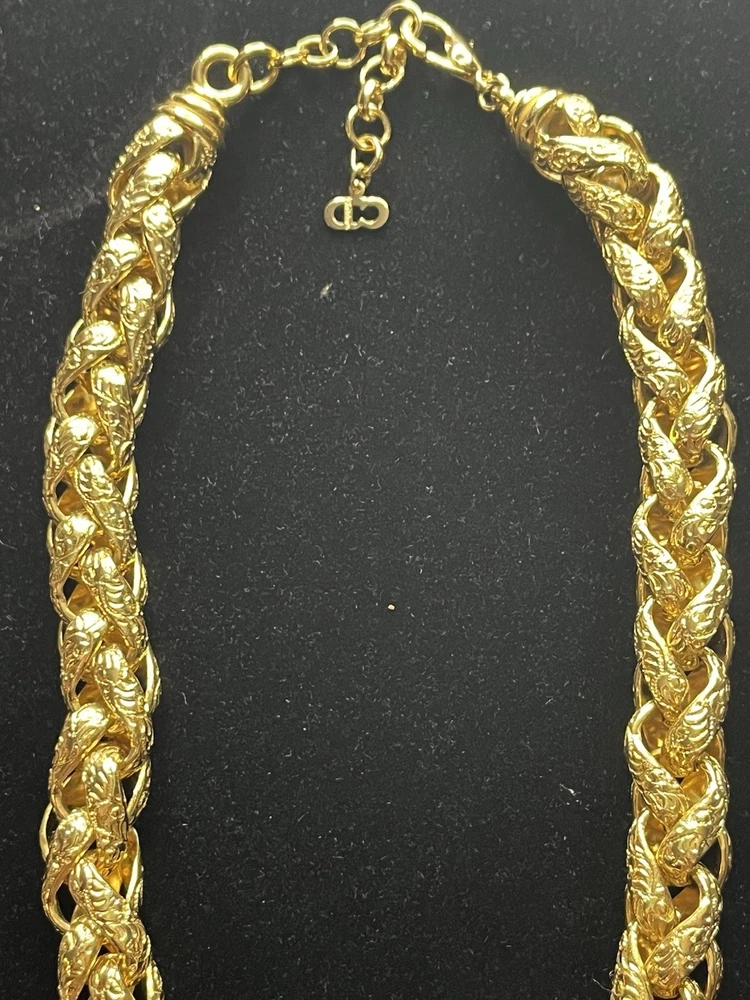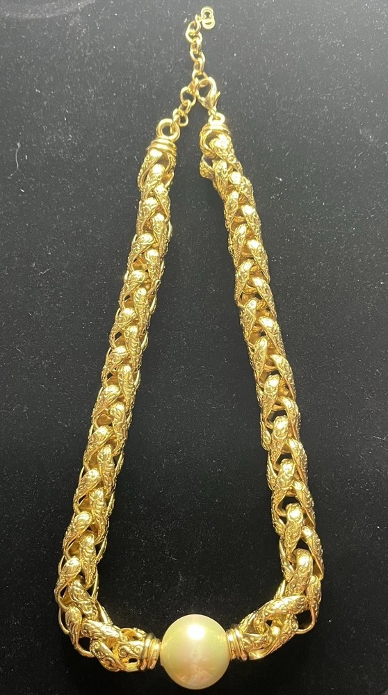 -up for sale is a Christian Dior , heavy braided chain with intricate design on chain, so pearl, large statement necklace -necklace measures 16 to 18 inch for wearing and a total of 20 1/2 inches in length -necklace has a lobster claw closure and has logo for Christian Dior hanging on the necklace -picture show size of pearl in millimeters and thickness of necklace can be worn for many different occasions from elegant to wearing jeans and a nice T-shirt -please look at all pictures for clarity, condition, which is good, design, etc.