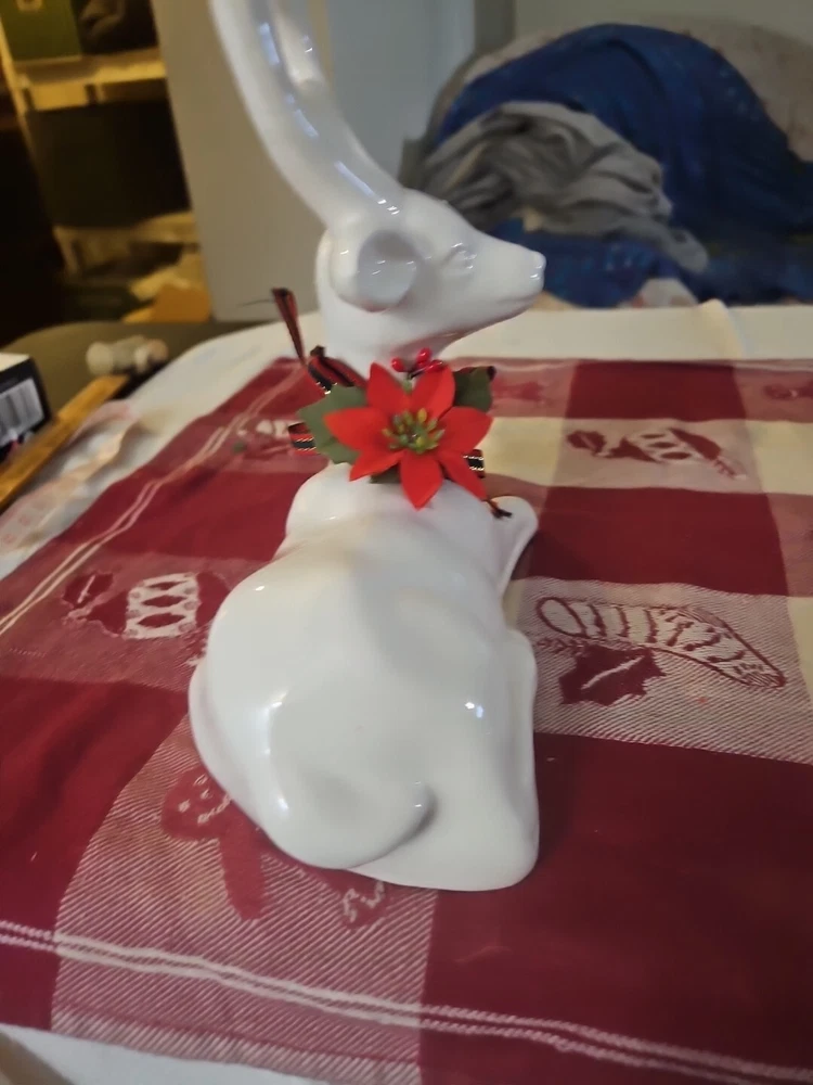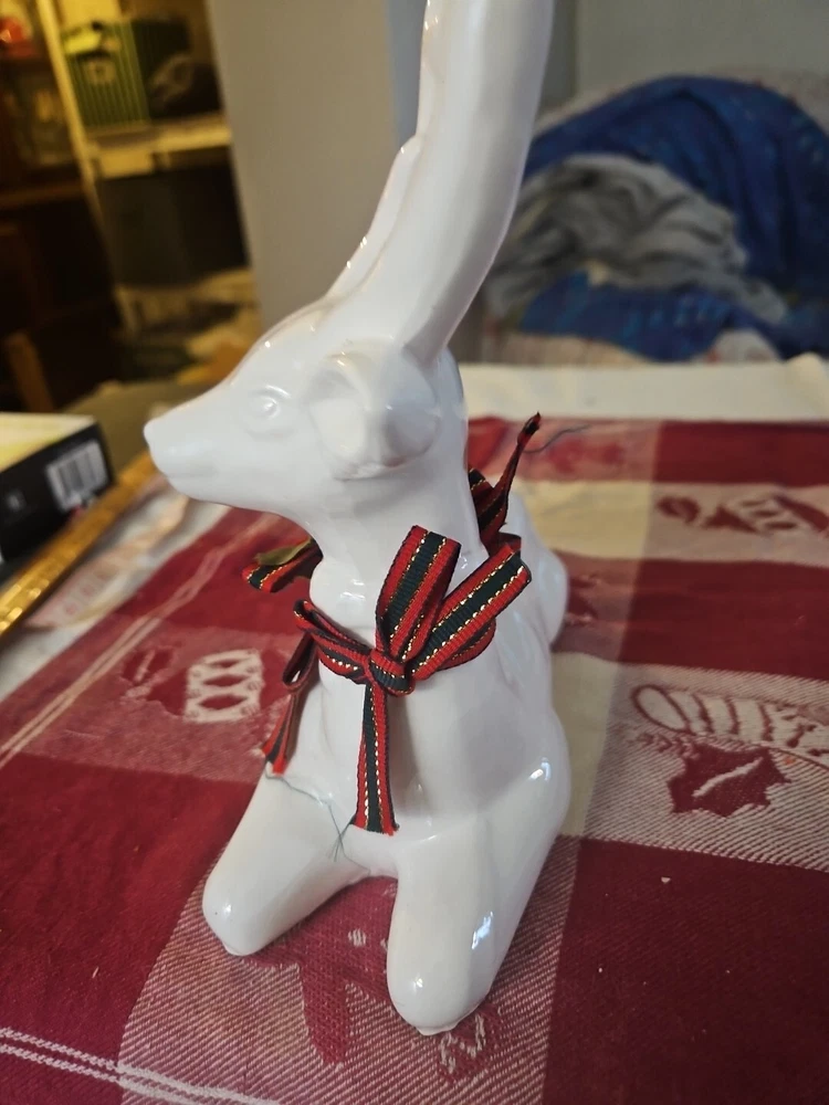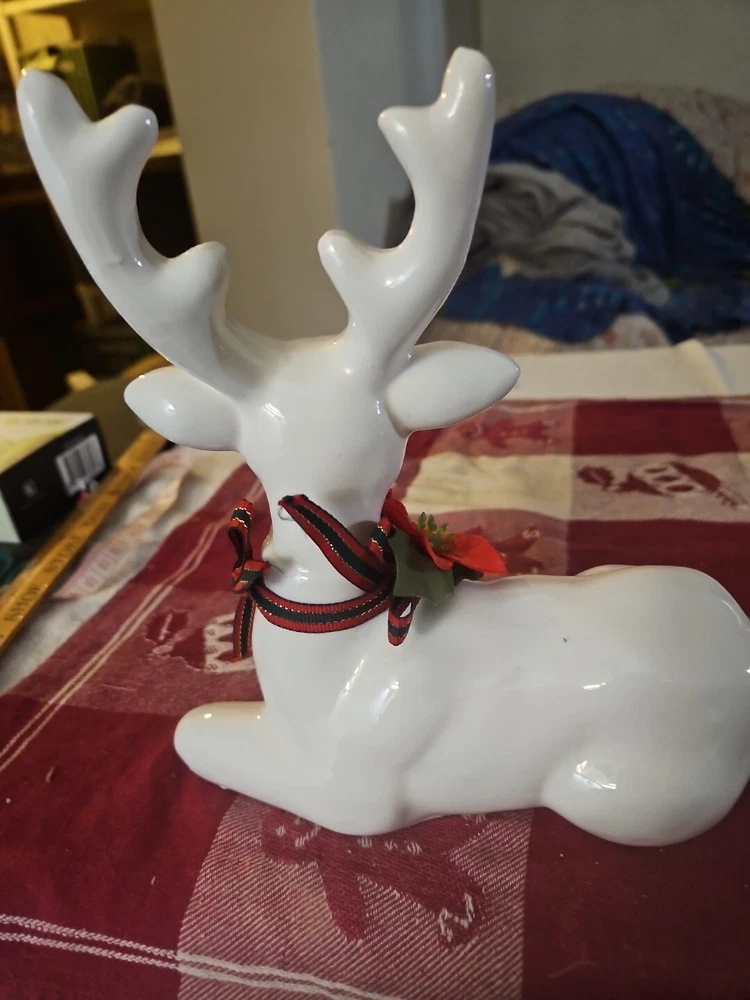 This charming ceramic deer figurine exudes holiday spirit with its festive plaid bow and tiny bells. Crafted by HomeCo, it captures the essence of a peaceful winter scene. Adorned with intricate details, this figurine makes for a delightful addition to any holiday display, evoking memories of past celebrations and cozy winter nights. Fun vintage Christmas reindeer for your holiday decor. Measures 8" tall x 7" wide. Has Made in Taiwan sticker on bottom.i • Ceramic material • Festive plaid bow with bells • Vintage holiday decor • Detailed design