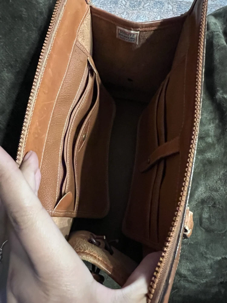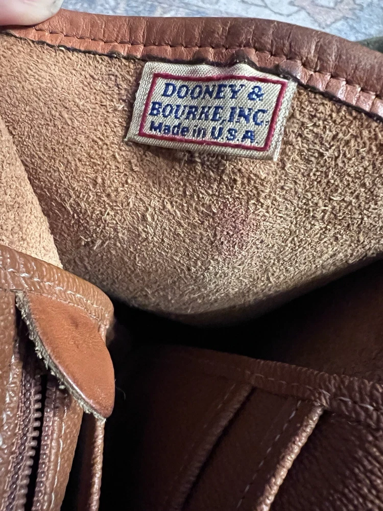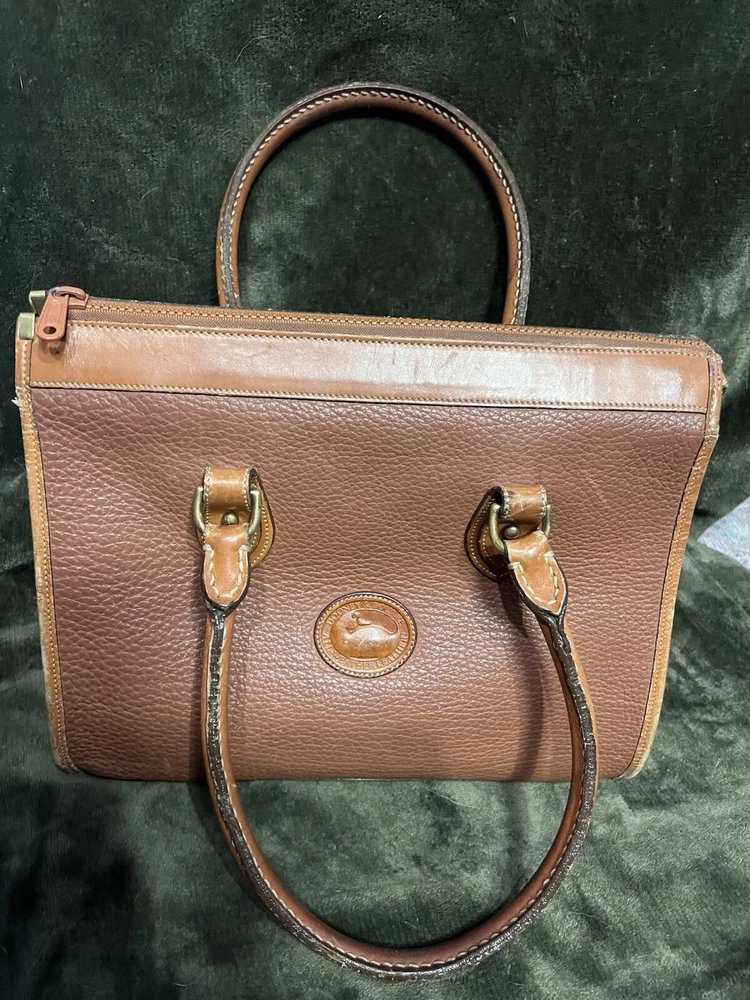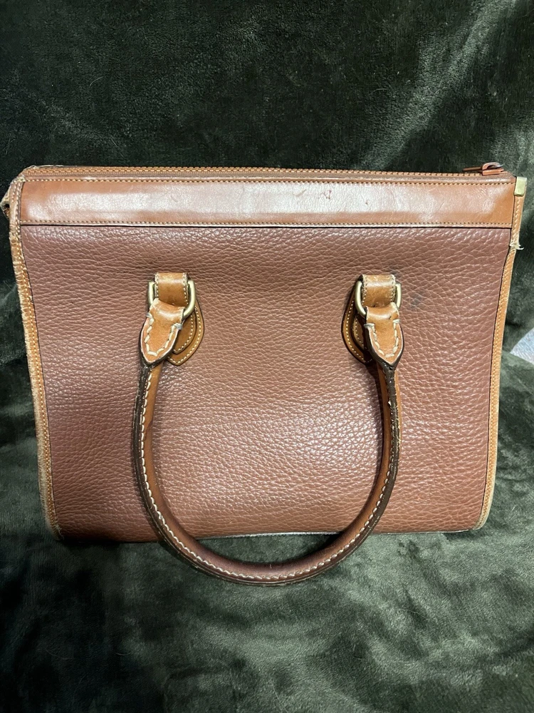 This vintage 1980's Dooney & Bourke satchel is crafted from all-weather leather in a pebbled tan finish, featuring brown leather double handles.