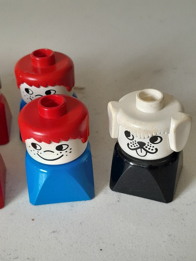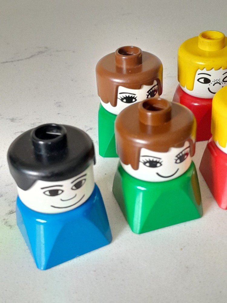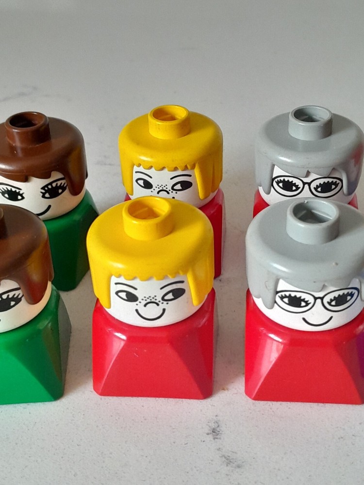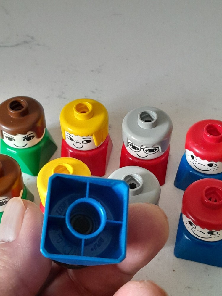 This is a lot of 10 vintage 1980 DUPLO people figures with square bottoms in multicolor. The figures are made of plastic and are part of the DUPLO LEGO theme. They are ideal for building and playing, adding a touch of nostalgia to any LEGO collection.