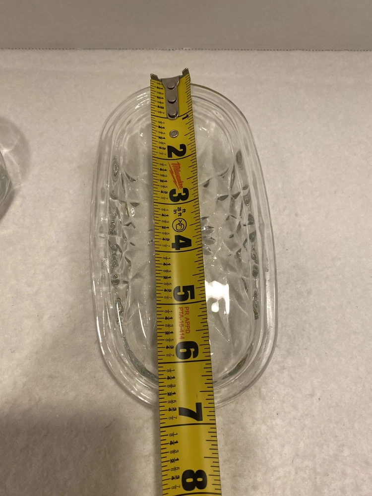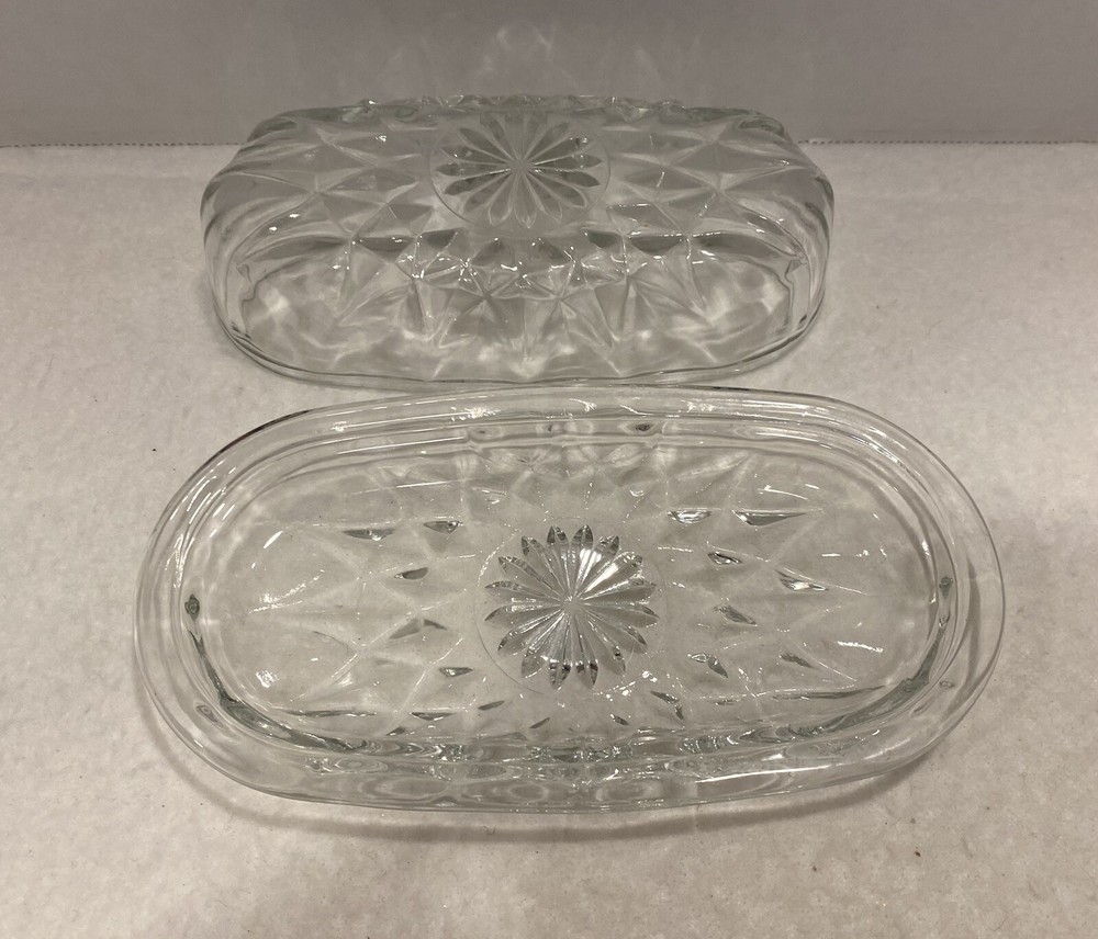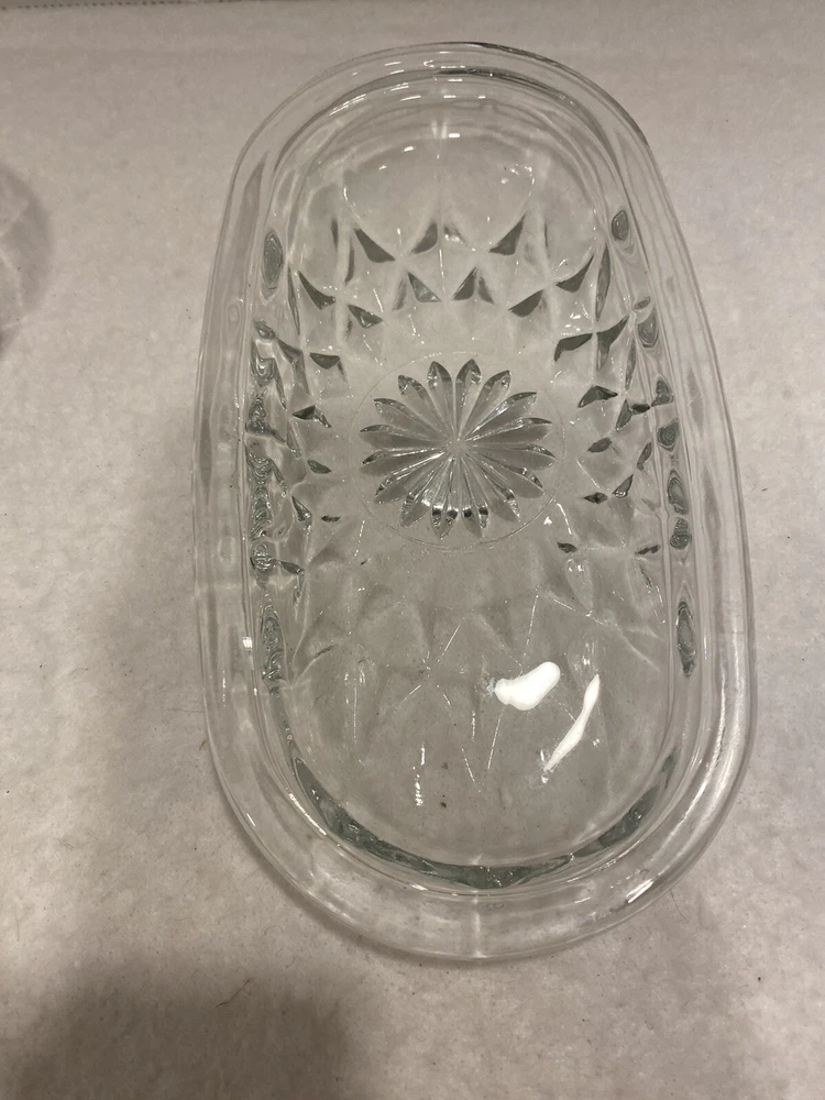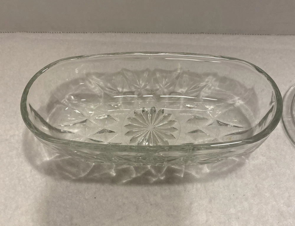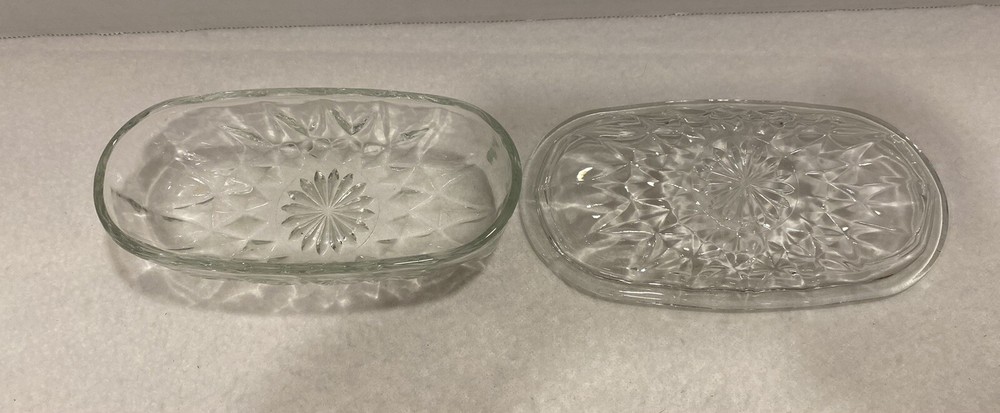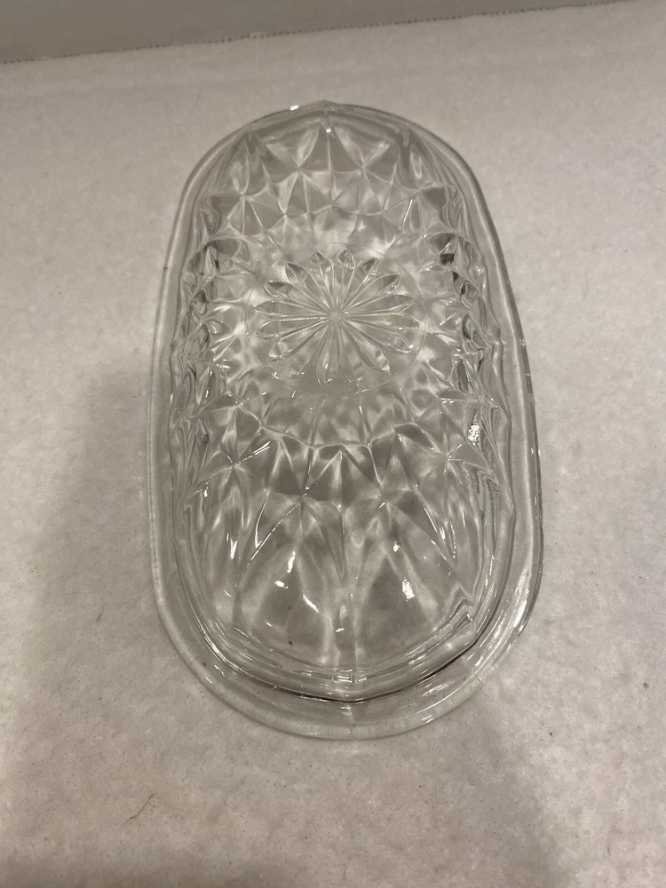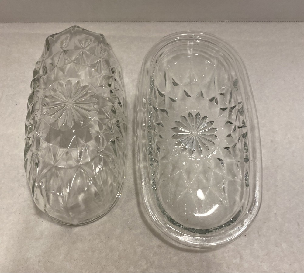 Time Period Manufactured:1980-1989Brand:Anchor HockingProduct Line:Early American Prescut/EAPCType:Butter DishColor:ClearNumber of Compartments:1Year Manufactured:1980Number of Items in Set:2Production Style:Cut GlassVintage:YesFeatures:Lid IncludedMaterial:GlassShape:Rectangle