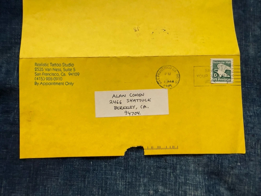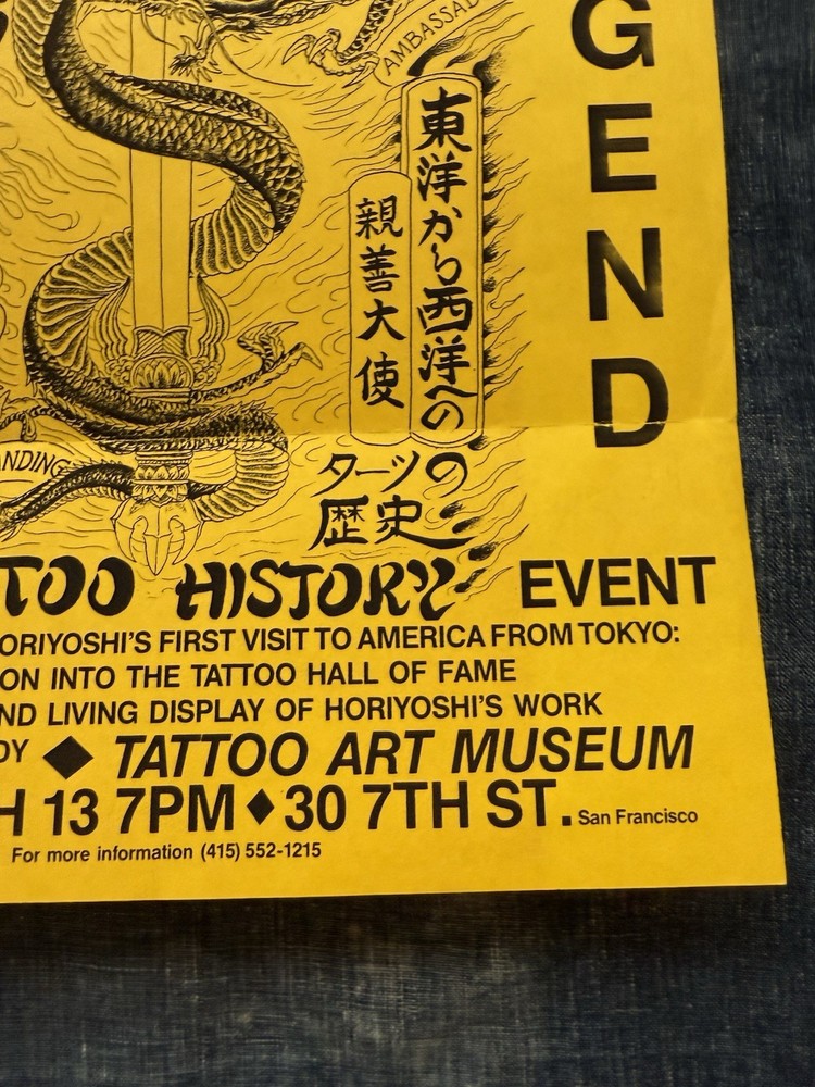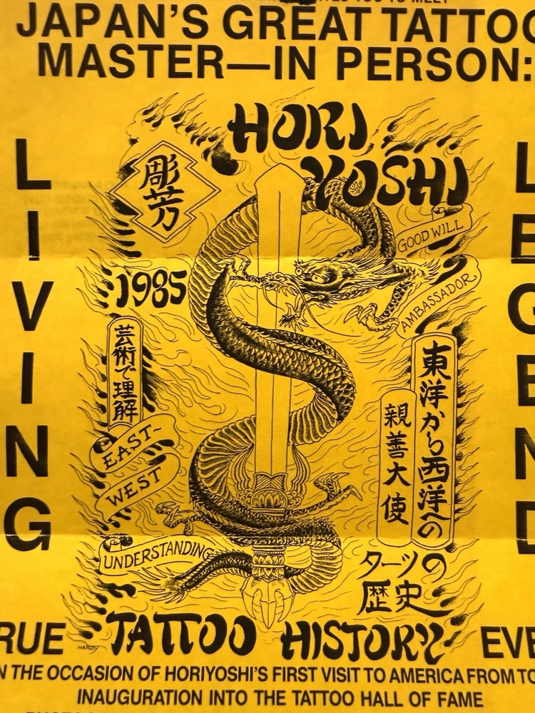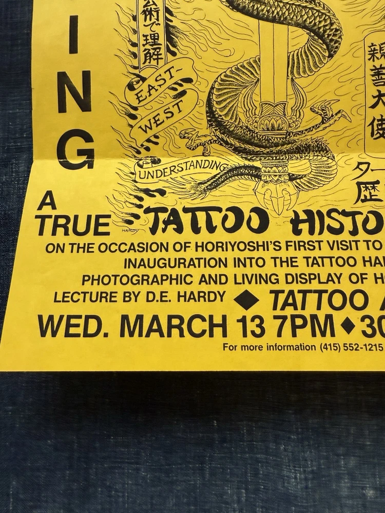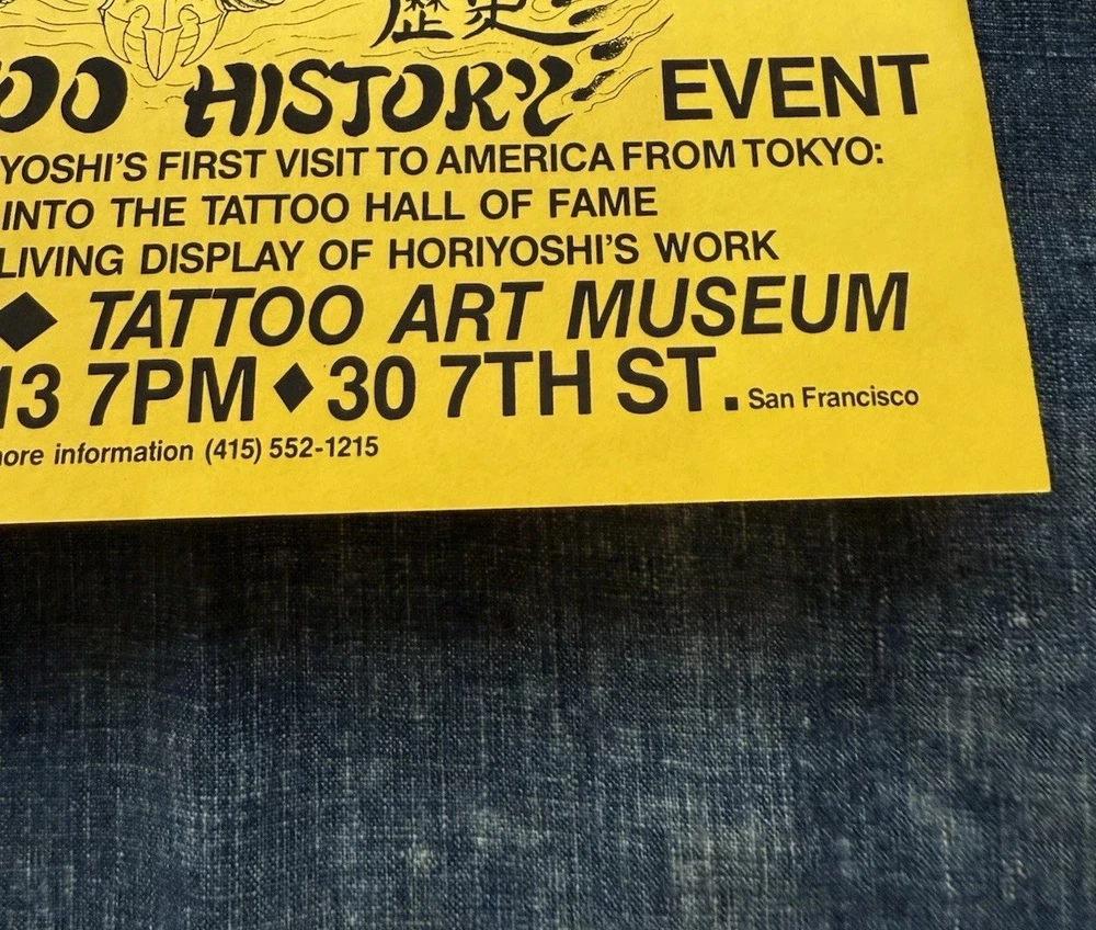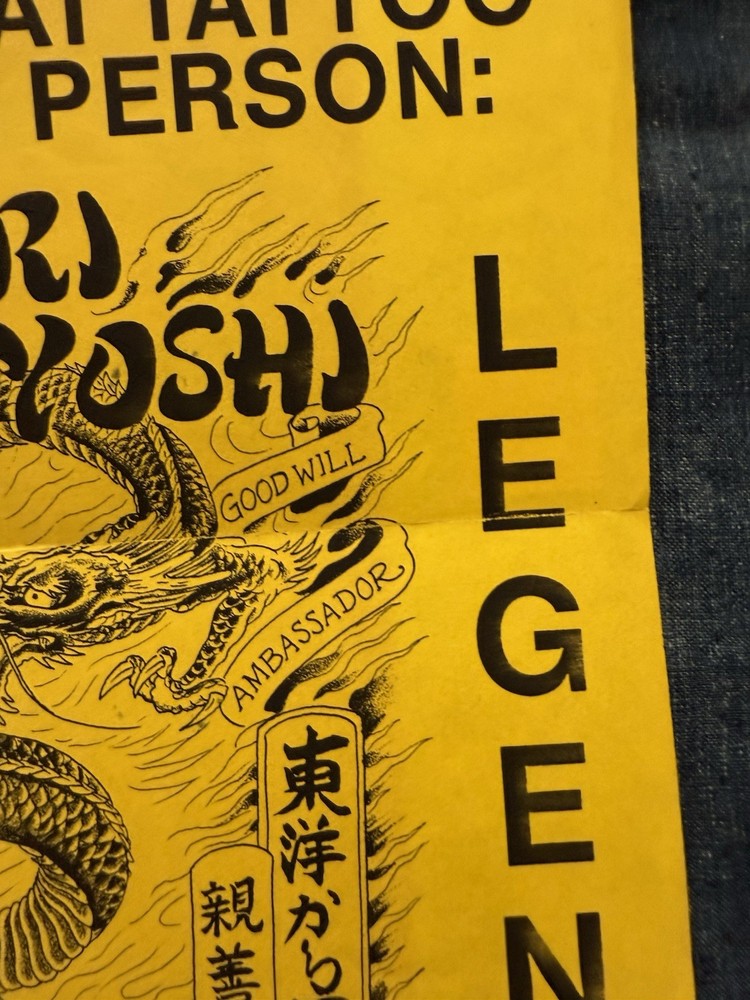 Neat and wonderful, vintage 1980s Hori Yoshi tattoo artist show event, promotional letter/flier. Dated March 13th, 1985. It was sent from Realistic Tattoo Studio, San Francisco. Cool, imagery on the front flier. This was obtained from a local, large collectors estate. Based on my research, I haven’t seen any of these out there. Offering free USPS Ground Advantage shipping! When unfolded, the flier measures 11” inches long by 8” 1/2 inches wide. When shut, it measures 8” 1/2 by 3” 7/8 inches wide. It’s in great, condition with no stains,holes or writing. The main flaw, is the paper tearing/rip on the top of the flier. This is due to being opened. Please note, there’s some creases on the back, front, right corner.Also, there’s some stamp residue on the back middle of the flier. The original tape with the ripped paper, is still attached. Offering as is/as found. A must have for unusual, tattoo history ephemera collectors and enthusiasts. Thanks for your consideration!