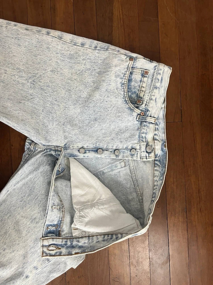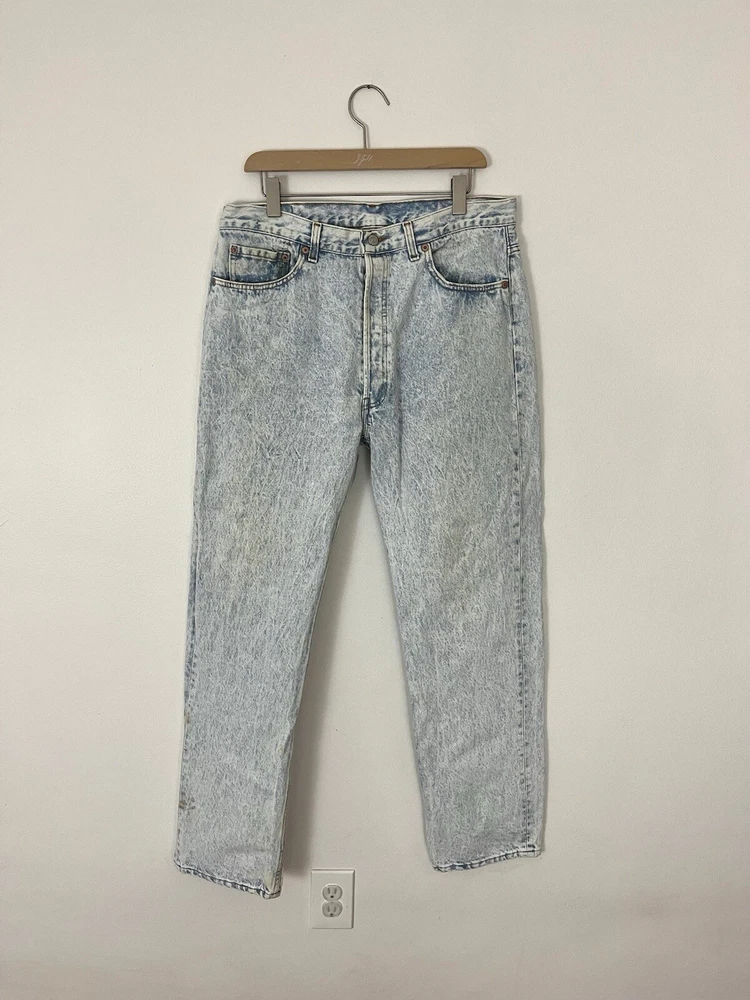 Vintage Levi’s 501 button fly jeans made in 1980! Acid wash finish and a tapered leg fit. Wash is light and there is a fair amount of staining (please refer to photos). I was able to get a significant amount of the staining out with bleach, so more could possible come out with more elbow grease than I was willing to give these. Otherwise pretty minimal distressing to the denim. I believe the original sizing was a 38 x 34 but not the waist measures between 34-35 inches and the inseam is just over 32”. More specific measurements are also in the photos. Thanks for shopping! Search words: vtg retro hippie hippy 36 Levi red tab orange tab preppy casual lighter blue as is 5 pocket relaxed silhouette