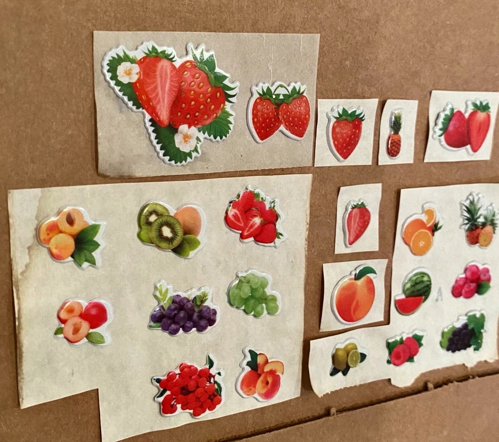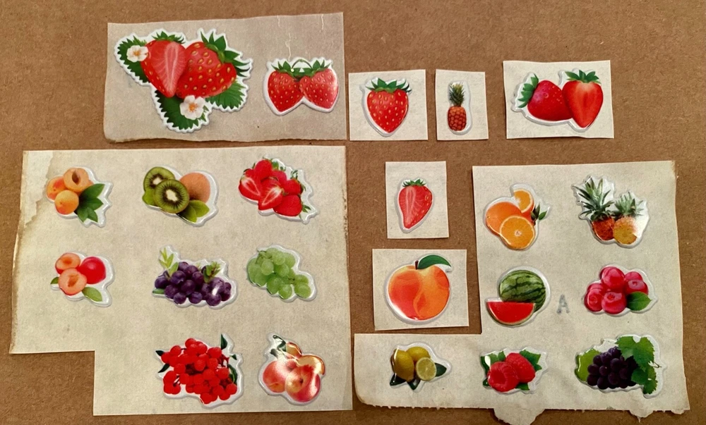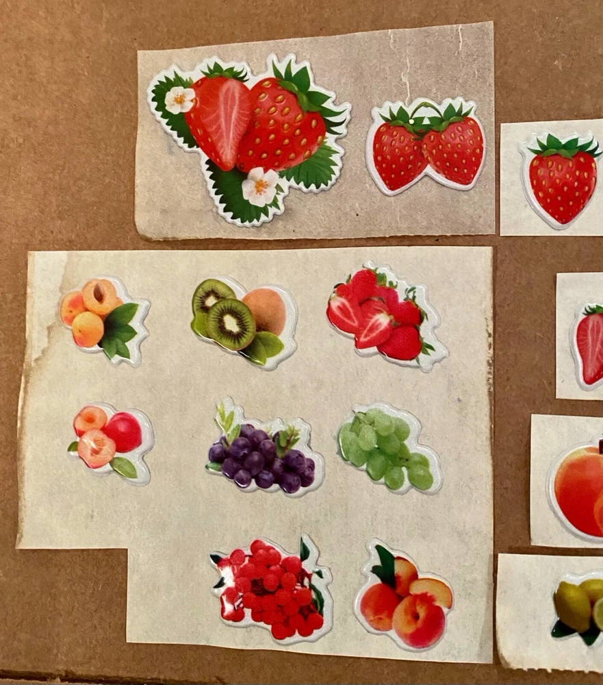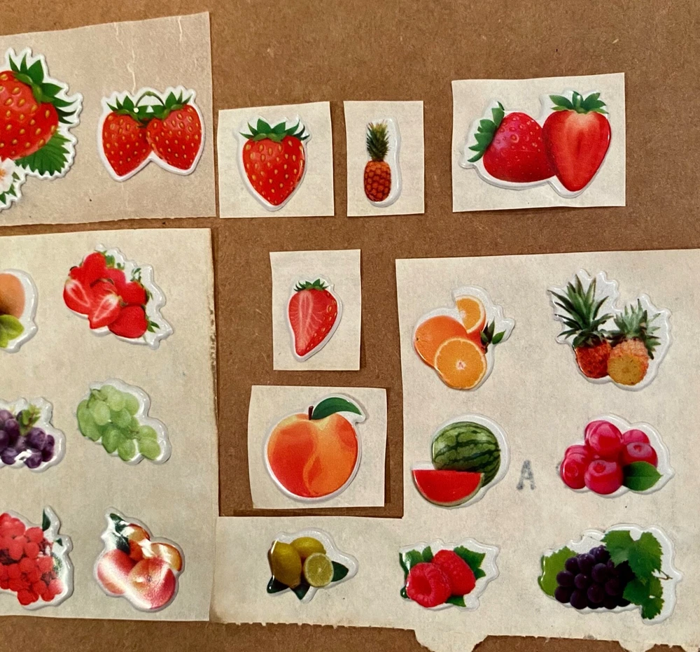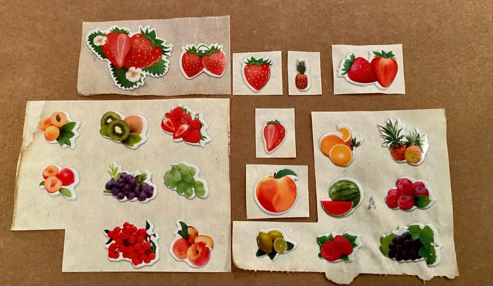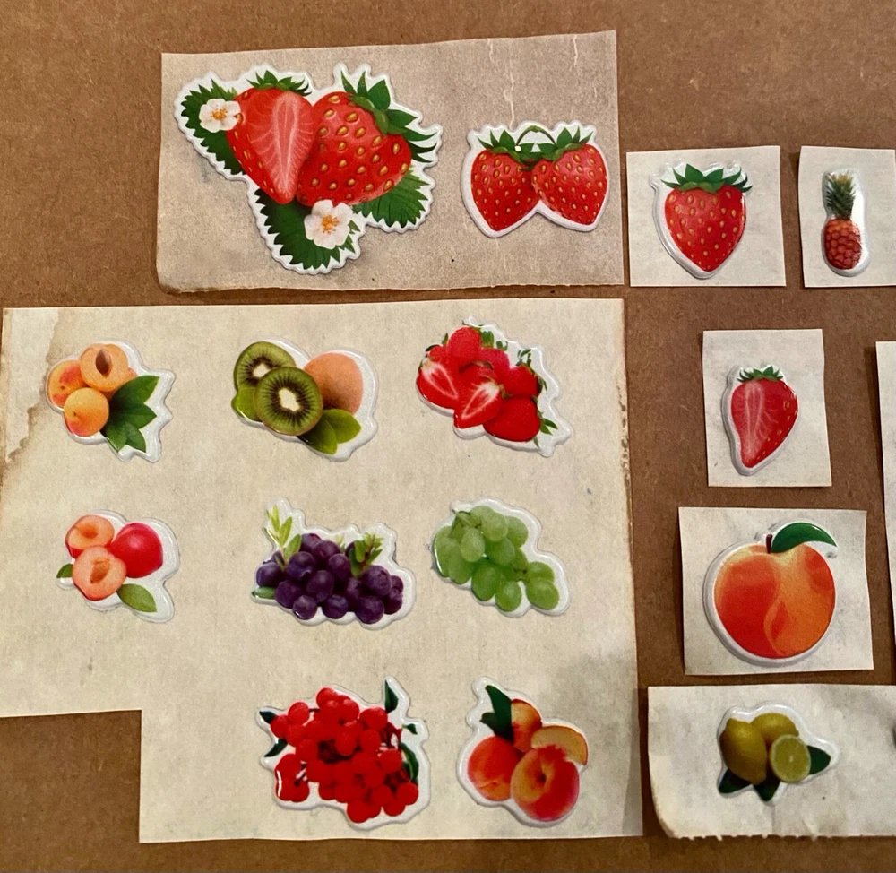 Vintage 1980s Puffy Scratch N Sniff Fruit Stickers Vinyl Stick-Ons With Smell Loose Sheets show some wear. -Scent is not guaranteed due to age, but I am still able to smell some sticker. :) COLOR MAY VARY FROM DIFFERENT SCREENS PLEASE ASK ANY QUESTIONS YOU MAY HAVE ABOUT THE COLORING OF THIS ITEM BEFORE COMMITTING TO PURCHASING IT PLEASE. Check out my other collections! Thank you.
