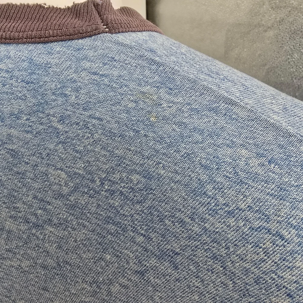 🔹 Item Details: Brand: Russell Athletic Material: 50% Polyester, 38% Cotton, 12% Rayon (tri-blend) Color: Heather Blue Decade of Manufacture: 1980s Country of Manufacture: U.S.A. Notable Features: Single Stitch Hem, Ringer Tee 🔹 Condition Notes: Good used vintage condition. Visible wear/grinding at collar and at both cuffs. Faint stain on front to right of logo. A few other spots of faint staining throughout. Light to moderate fabric wear throughout. See photos. 🔹 Size Notes: Vintage Tag Size: XL Modern Measured Size: XL 🔹 Measurements (Approximate): Chest (pit to pit): 47 inches Collar to Hem: 25.5 inches 🔹 Shipping & Returns: Ships worldwide from Lexington, KY. Ships within 3 business days of purchase. Returns accepted within 60 days for domestic orders and 30 days for international orders.