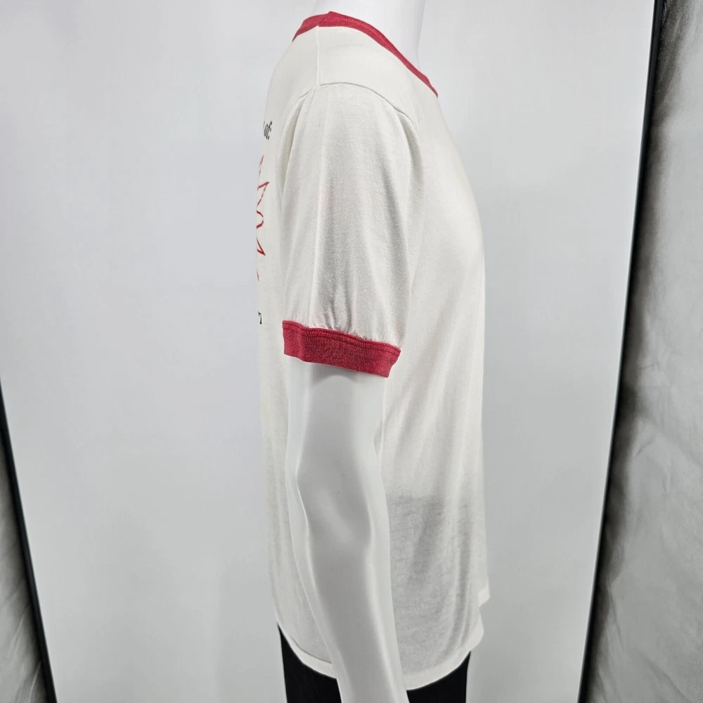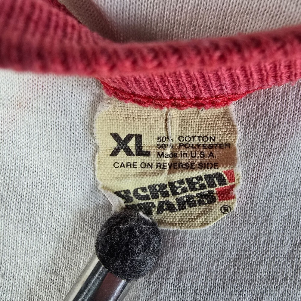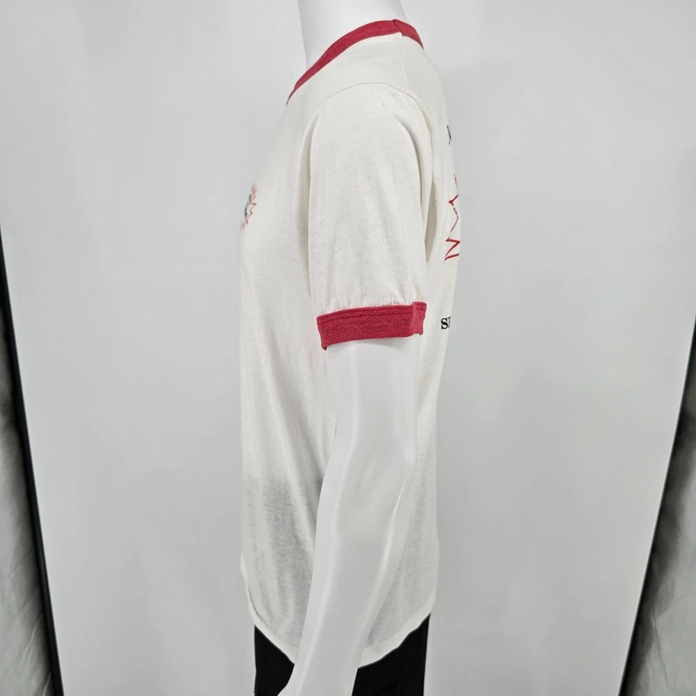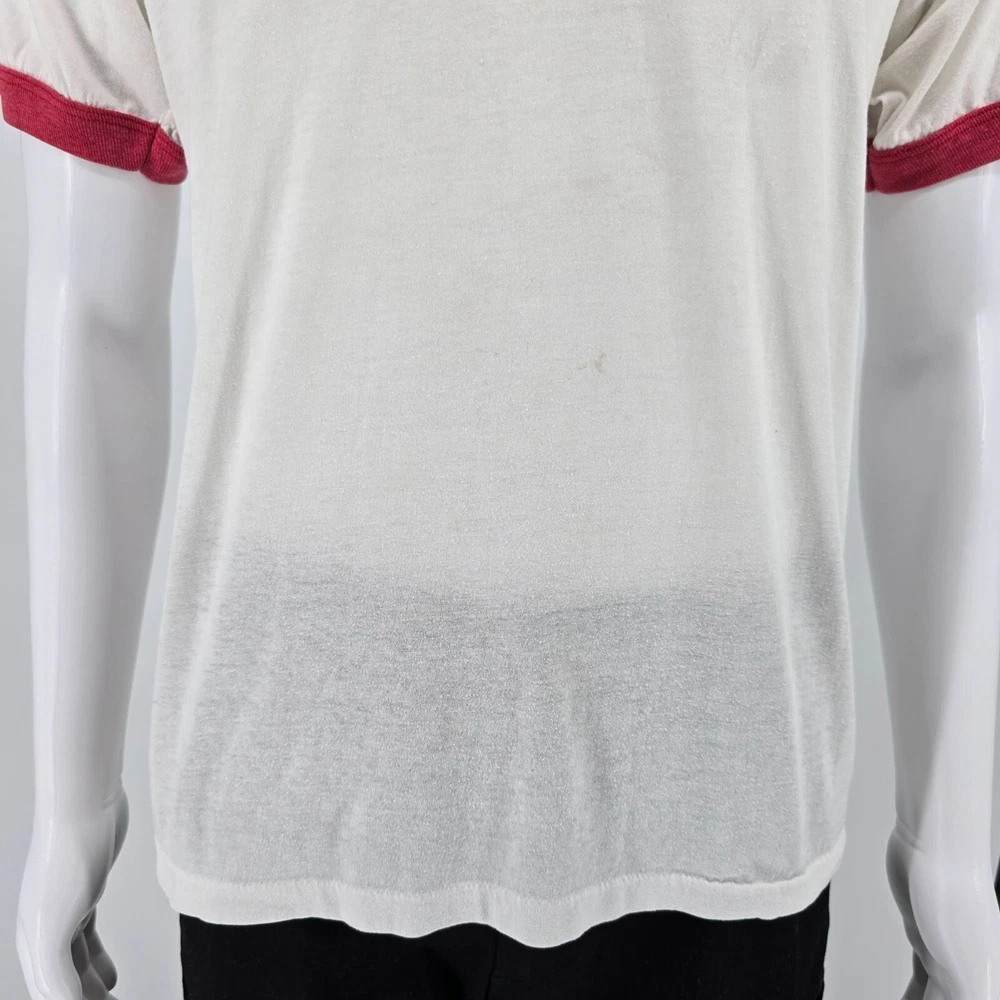 Color: White Chest Size: 41 Material: Cotton Blend Sleeve Length: Short Sleeve Gender: Unisex Decade: 1980s Brand: Screen Stars Size Type: Regular Size: M/L Original/Reproduction: Original Country of Origin: United States Personalized: No Look: Ringer Style: Ringer