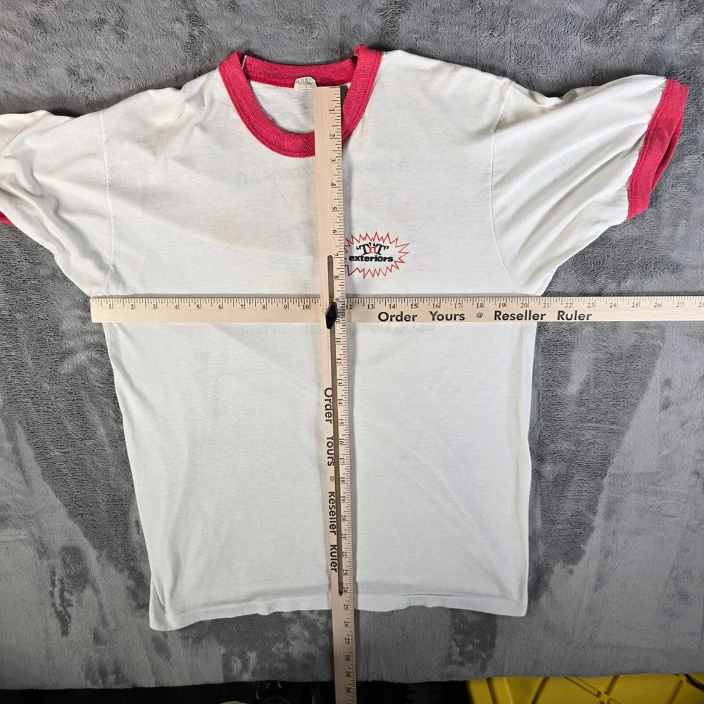 🔹 Item Details: Brand: Screen Stars Material: 50% Cotton and 50% Polyester Color: White, Red, and Black Decade of Manufacture: 1980s Country of Manufacture: USA Notable Features: Ringer Collar and Cuffs, Single Stitch Hem, small chest logo, large back logo Full Graphic Text (front and back): 'T'N'T Exteriors Manufacturers of Seamless Aluminum Gutters 🔹 Condition Notes: Fair to good used vintage condition. Multiple large but faint spots of staining and discoloration on both the front and the back of the ringer tee. A few spots residue on front of shirt. Light to moderate fabric wear throughout. See photos for details. 🔹 Size Notes: Vintage Tag Size: XL Modern Measured Size: M/L (falls between medium and large on modern size chart) 🔹 Measurements (Approximate): Chest (pit to pit): 41 inches Collar to Hem: 25 inches 🔹 Shipping & Returns: Ships worldwide from Lexington, KY. Ships within 3 business days of purchase. Returns accepted within 60 days for domestic orders and 30 days for international orders.