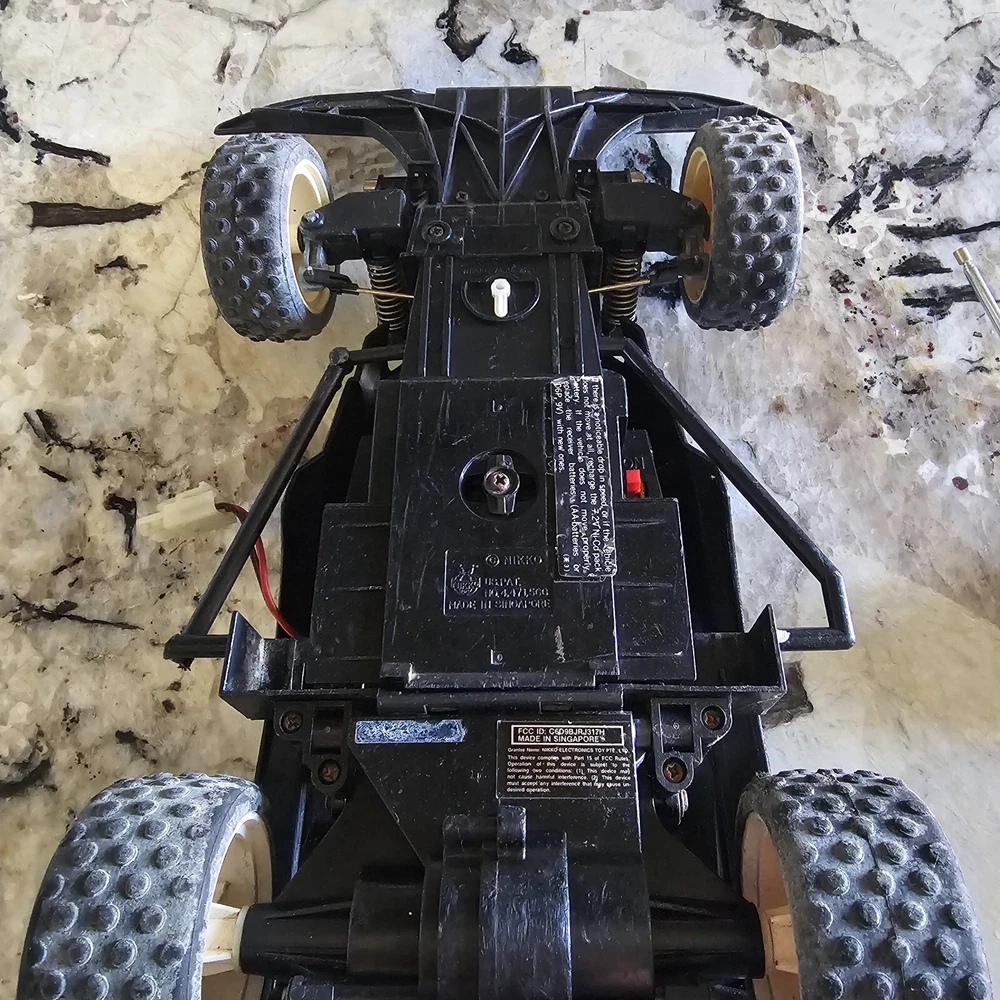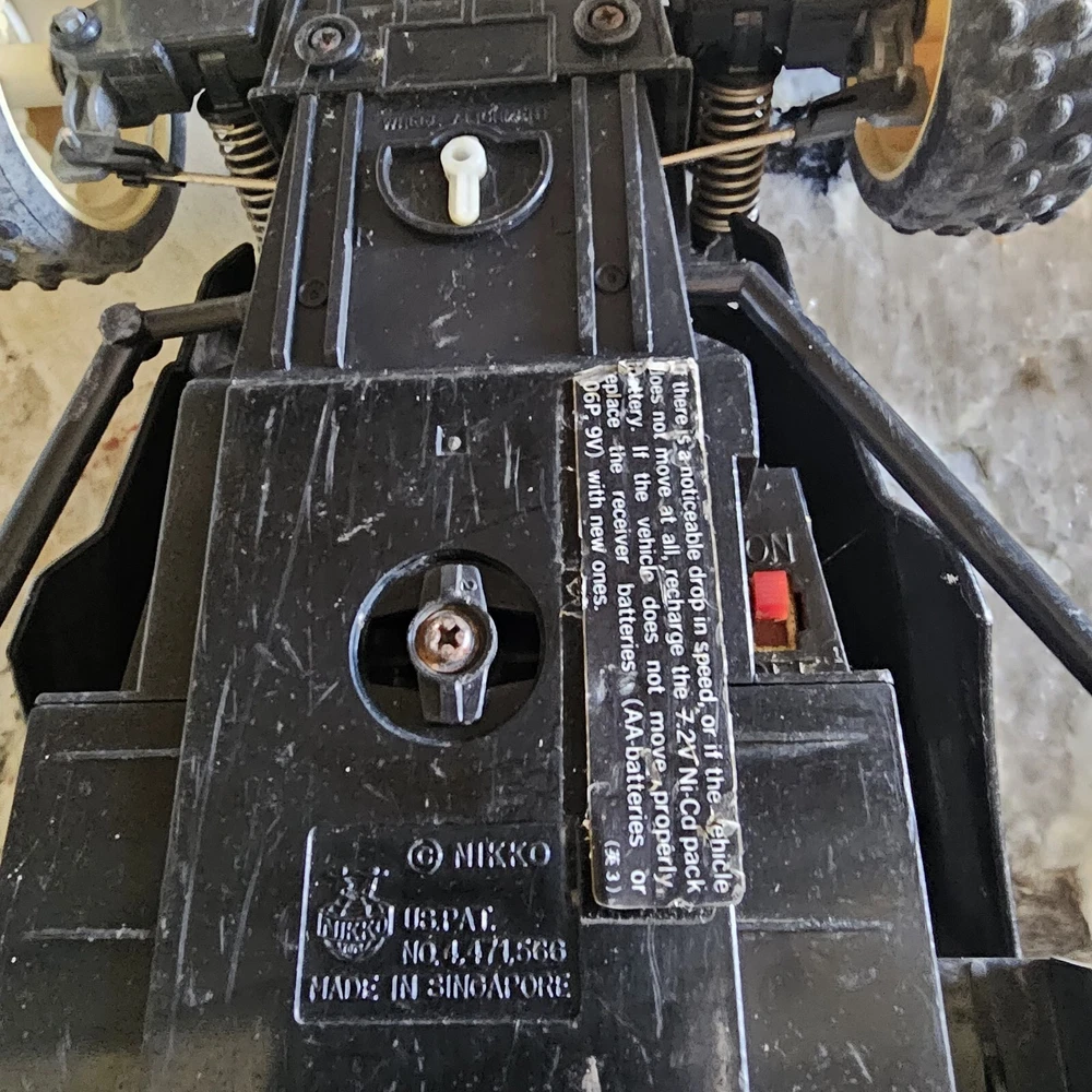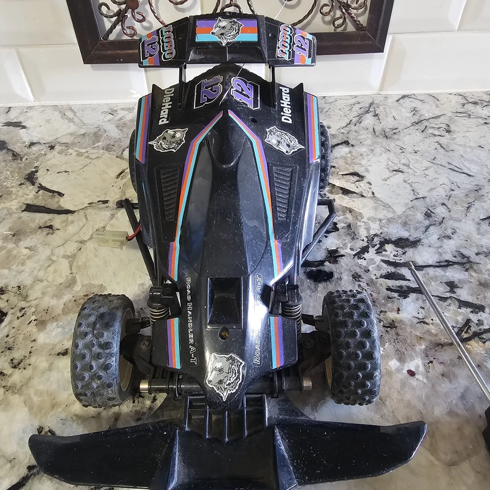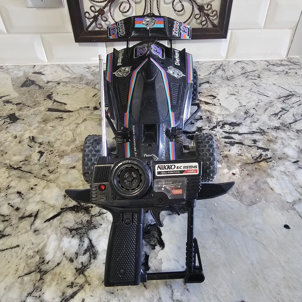 This is a vintage Nikko RC truck from 1980's, model LOBO #12 . The truck is black in color and features a brushed motor. It is a 4WD electric RC car that comes with a remote control. Please note that batteries are not included with this product. Remote turns on but not tested. Not in original box. Sold as is