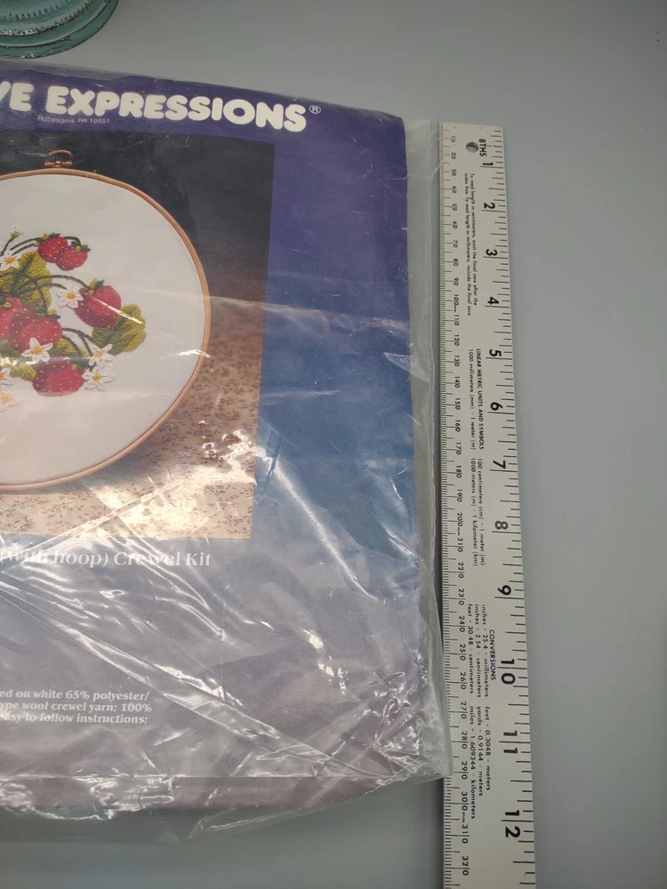 Vintage 1981 Crewel Embroidery Kit Strawberry Patch 8" Hoop by Creative Expressions. No. 1611. Made in the USA. New Old Stock. Unused, never used. NOTE: Top part of the plastic bag is opened and taped. Packed with care from a smoke-free home and ships in 1 business day. Thank you for supporting a homegrown US business and stray cat rescue/foster. Nicola @Rural Route Rarities