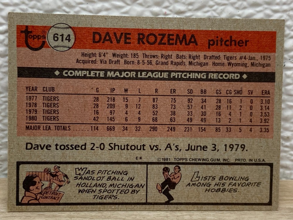 Vtg 1981 Topps MLB Dave Rozema Tigers # 614 Baseball Card.In very good condition.