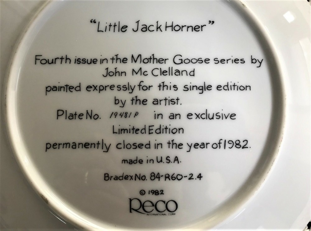 'Little Jack Horner' is the 4th issue in the Mother Goose collector plate series by artist John McClelland, 1982. Diameter is 8.5 inches. Limited Edition. Produced by RECO and distributed by Bradford Exchange. High quality porcelain.