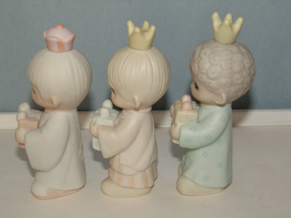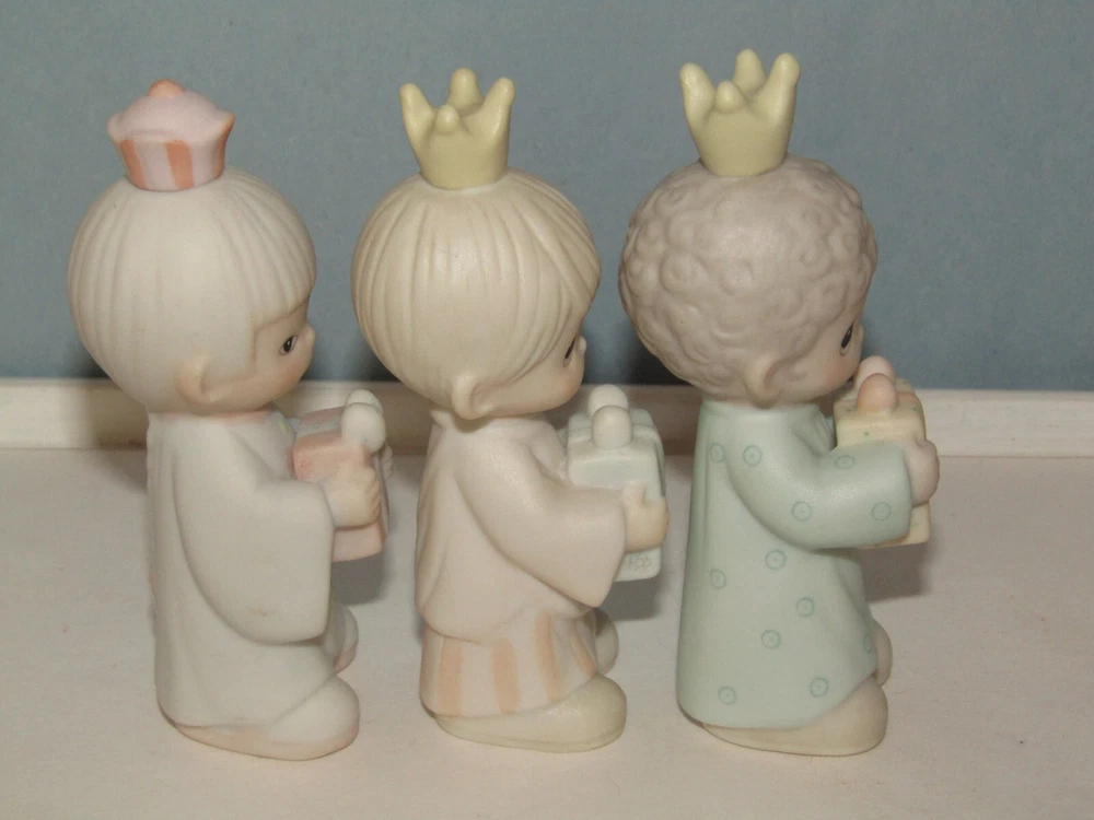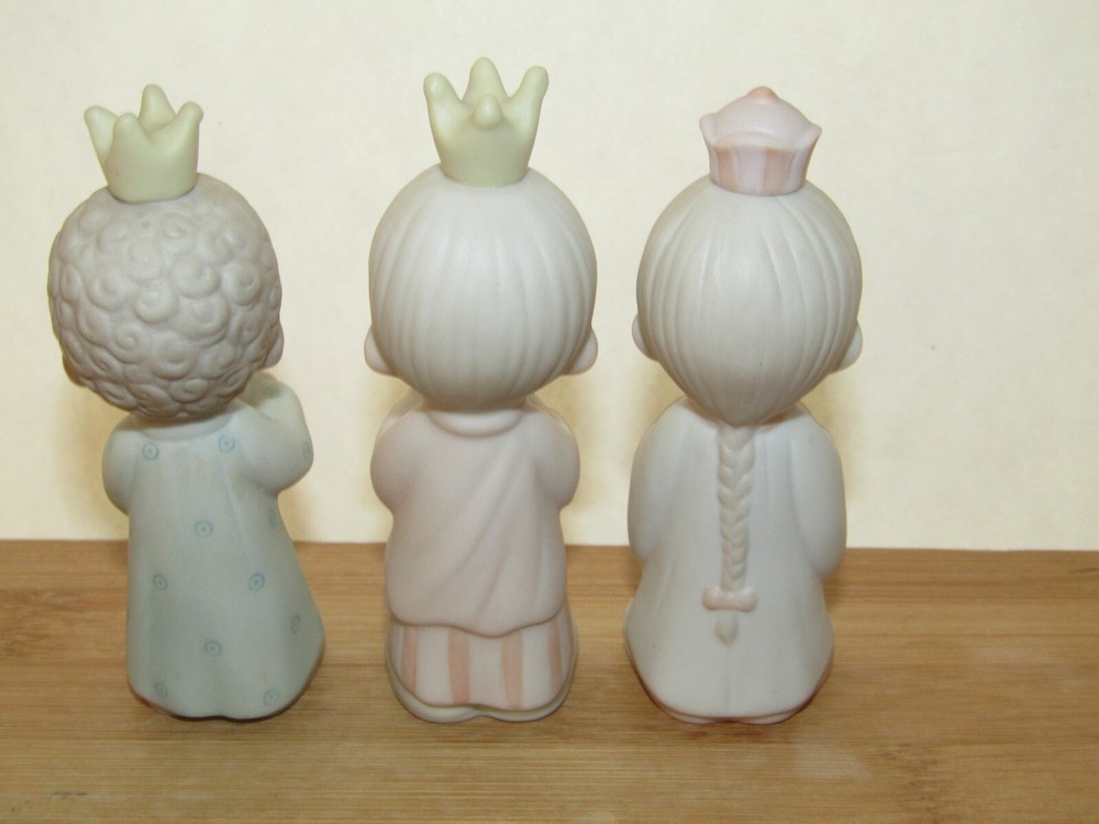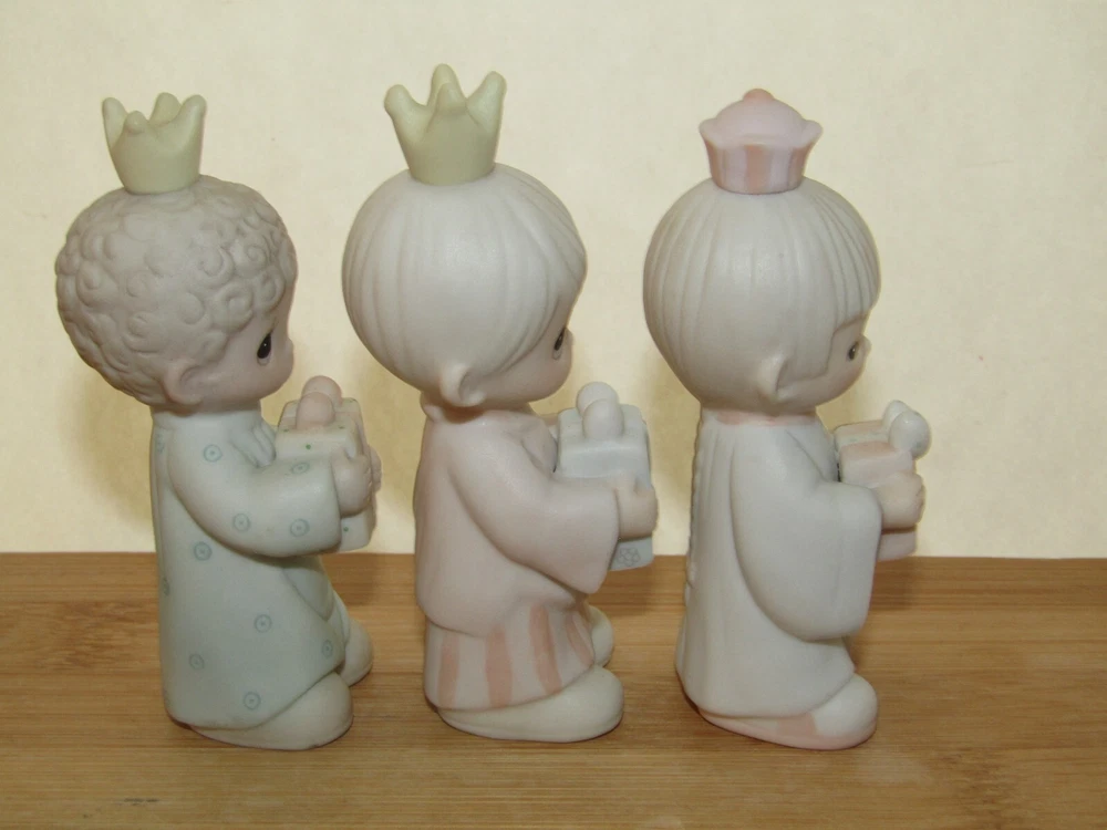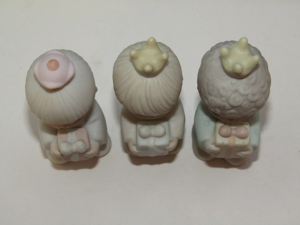 Offered in excellent, like new condition (sorry no box) is a set of three (3) Precious Moments Wisemen figurines from the 1982 Jonathan & David Enesco E2395 1982 set. Each piece is made from bisque porcelain and showcases the beloved Precious Moments characters in a multicolor design. Condition: Excellent (unboxed) condition with original labels on the underside and no damage or signs of use. They are small in size with the tallest wisemen measuring approximately 3 1/2" tall to the top of his crown. Thank you for looking and please feel free to message us if you have any questions. They will each be individually wrapped in bubble pack and fully insured against loss or damage in transit for a guaranteed safe arrival. Ships from Seattle, WA via your choice of Fed-Ex Economy with a 2-8 business day delivery estimate or USPS Ground Advantage with a 3-5 business day estimated delivery.