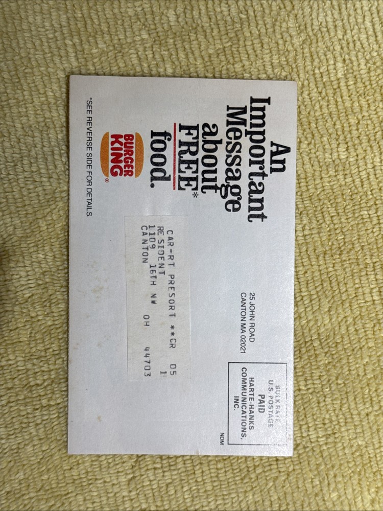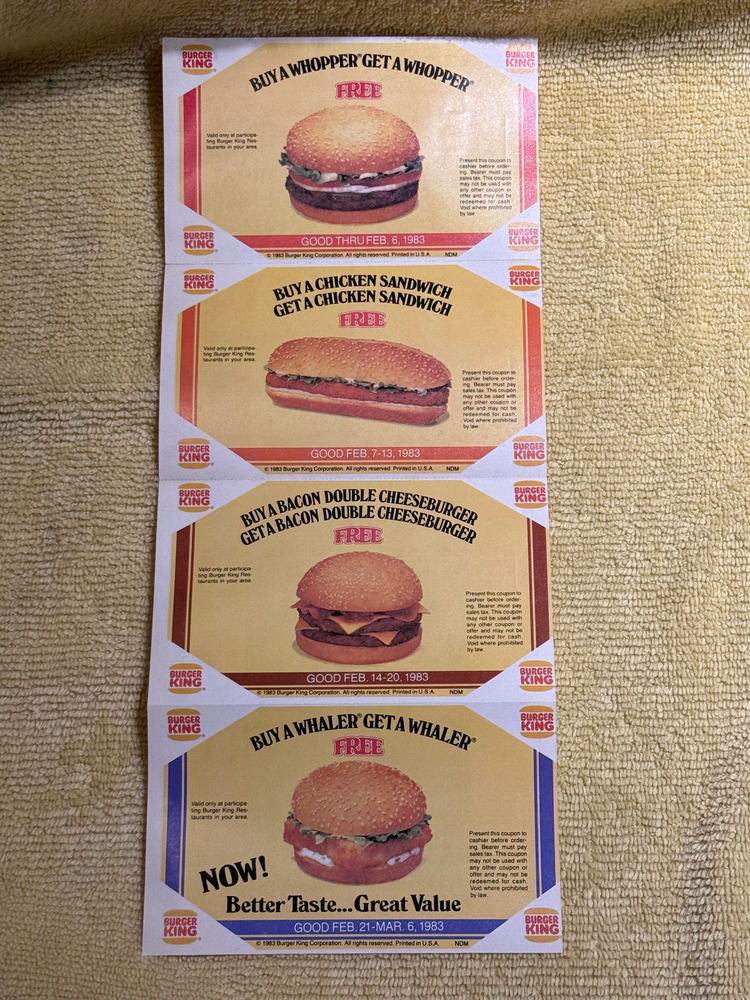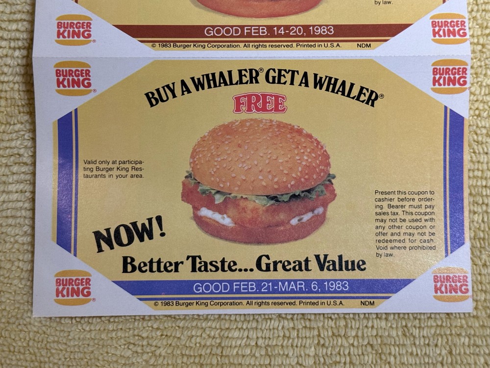 For your Consideration............ ~ Is a Vintage 1983 Burger King Coupon Booklet -Home of the Winner! Four Coupons ! Great vintage advertising Piece! Please add $3.95 shipping. Thanks for looking!
