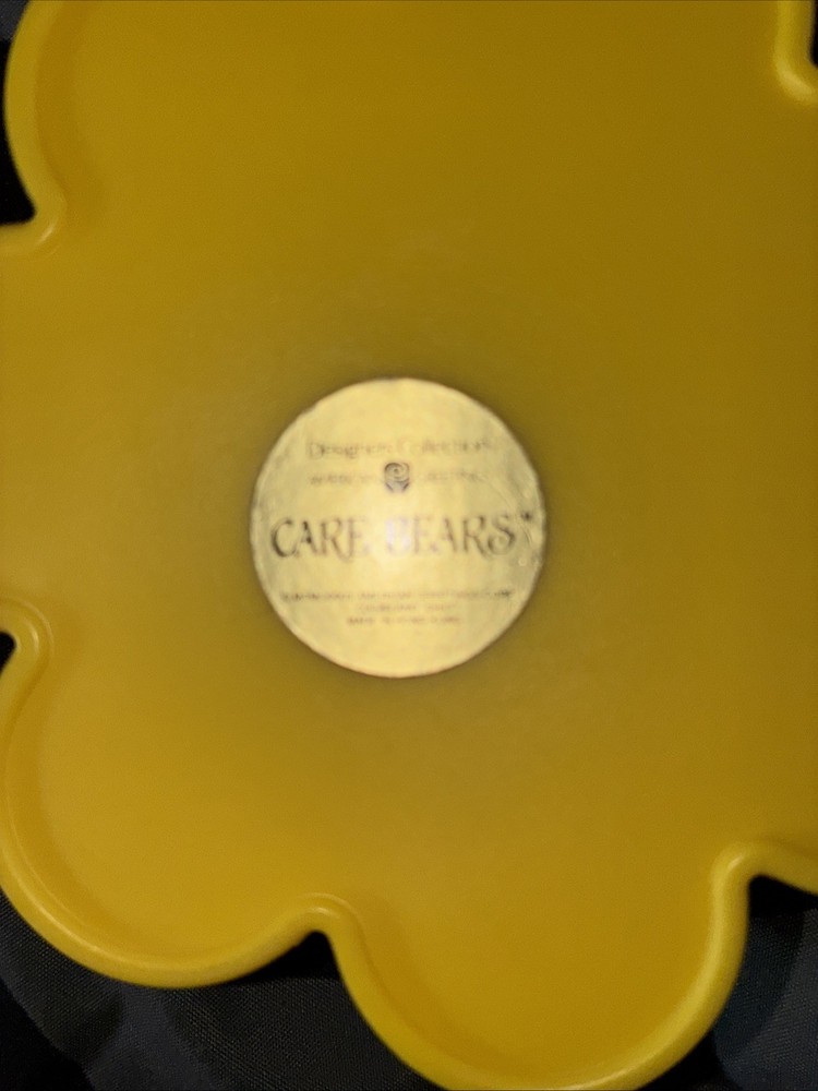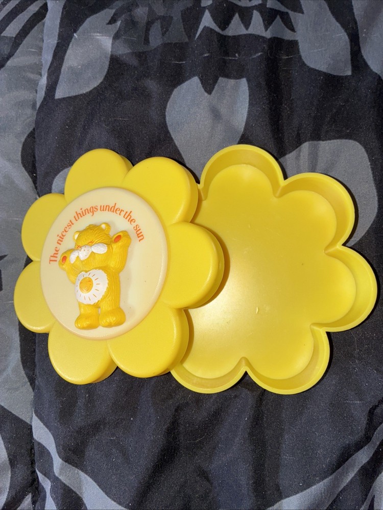 This vintage Care Bears 1983 Funshine Bear keepsake trinket jewelry box is a small, asymmetrical box suitable for storing trinkets. It features a 3D effect with a matte finish and a yellow color with a flower pattern. The box is branded by American Greetings and is part of the Care Bears collection, making it a nostalgic item for fans of 1980s cartoon characters. Its unique design and vintage appeal make it a special addition to any collection or decor. Reads “the nicest things under the sun.”
