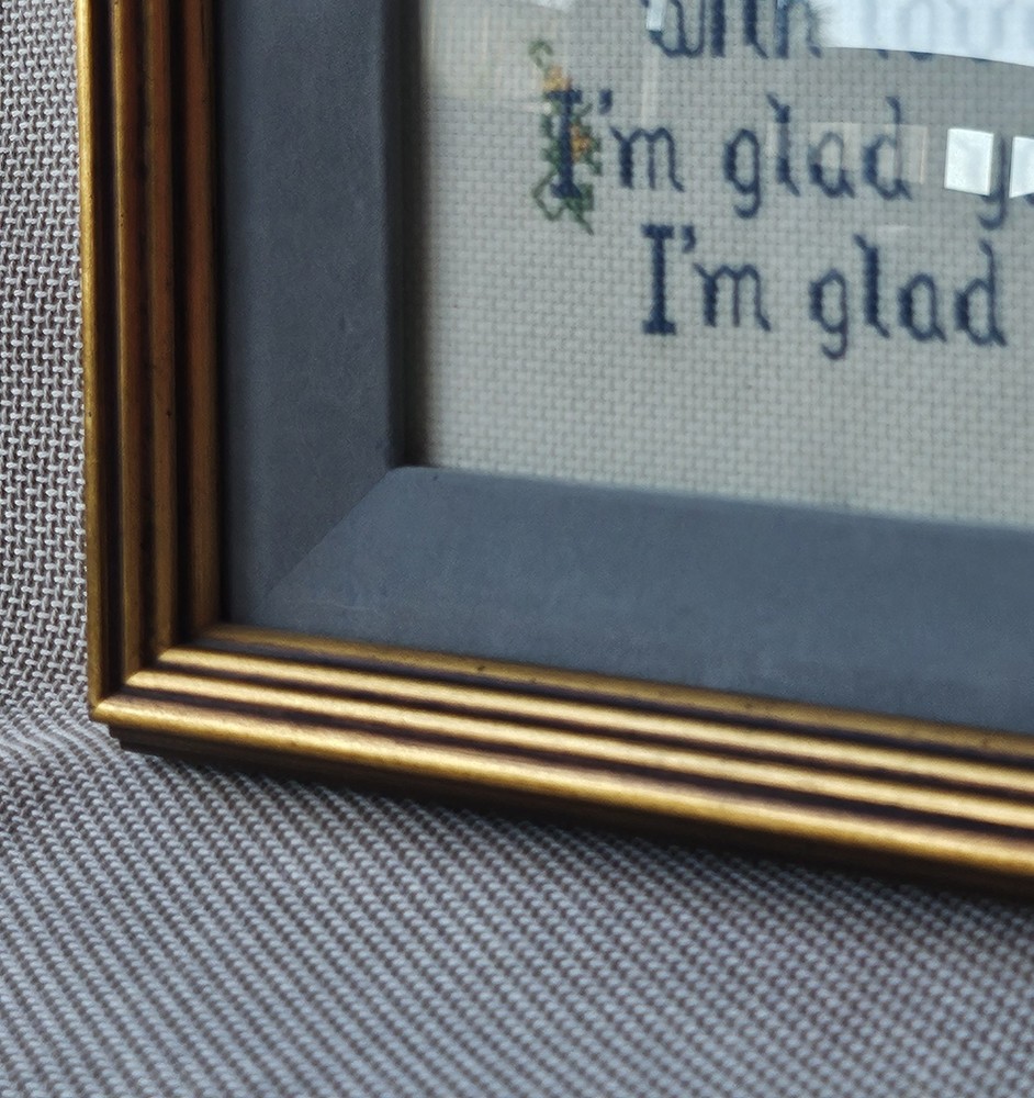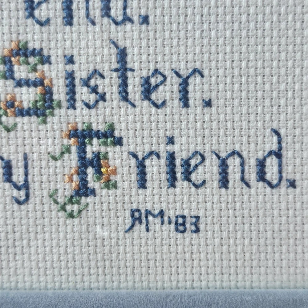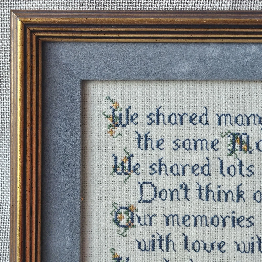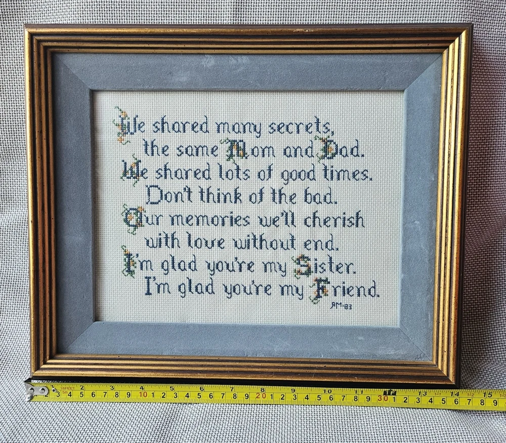 Beautifully preserved, handmade vintage cross-stitch from 1983. This charming piece of wall decor features a classic sentimental poem about the bond between sisters. It is a "completed" counted cross-stitch, professionally finished with high-quality matting and a vintage gold-toned frame. The Poem Reads: "We shared many secrets, the same Mom and Dad. We shared lots of good times. Don’t think of the bad. Our memories we’ll cherish with love without end. I’m glad you’re my Sister. I’m glad you’re my Friend."