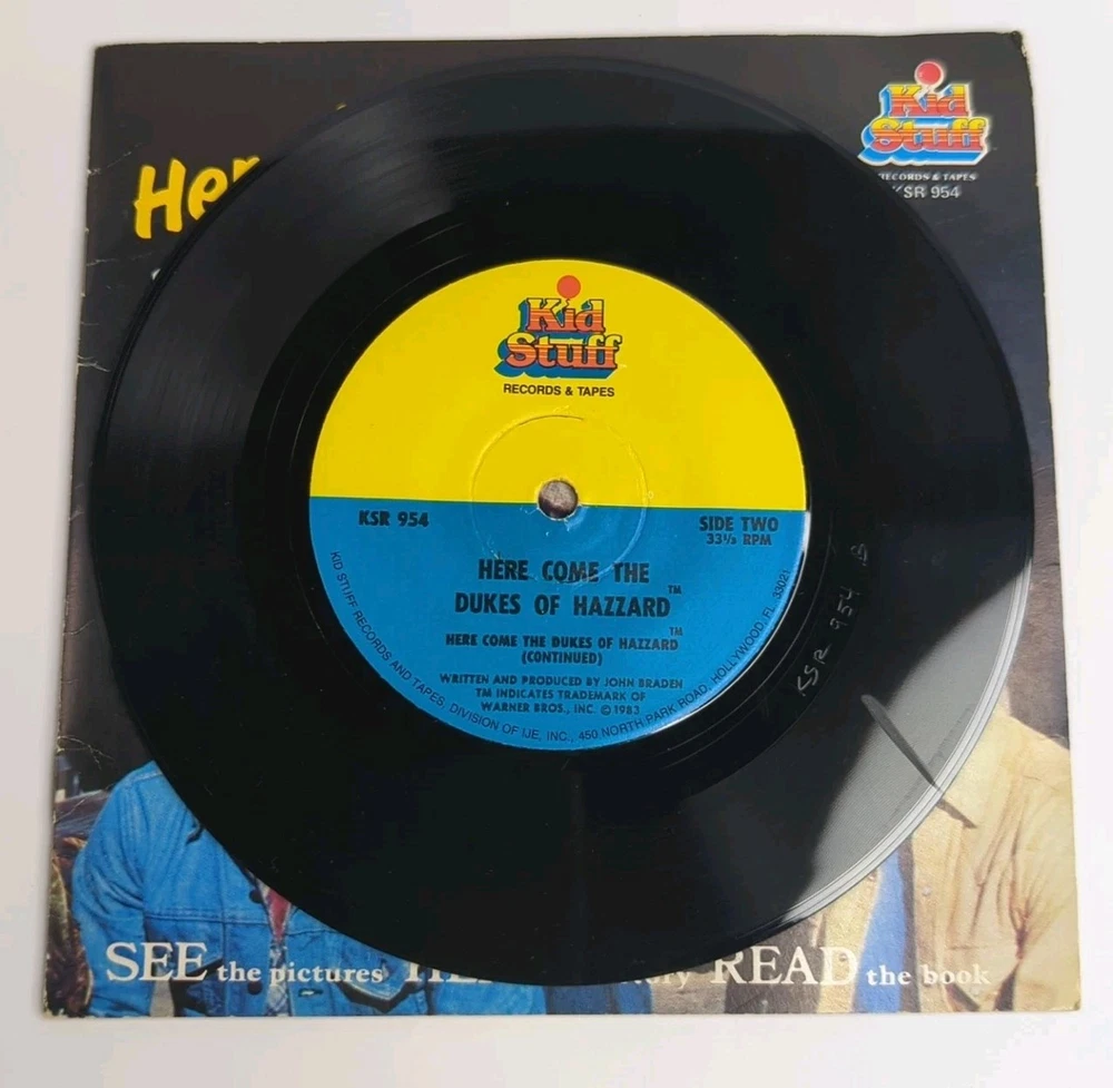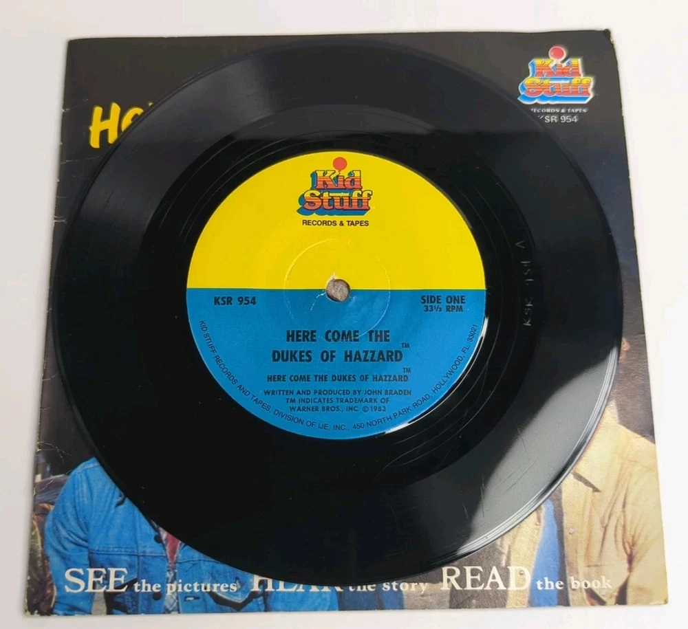 See photos for condition, overall item is in good condition. The story book has all pages without rips. The pictures are colored. Side 2 has a surface scuff (seen in last picture). The product is a vintage rare 7" vinyl record and book set titled "Here Come The Dukes of Hazzard," released in 1983 under the KSR 954 label. It is related to the television industry and was manufactured in the United States.