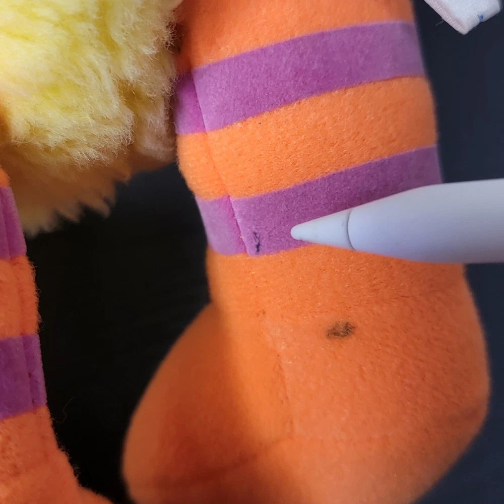 Has stains back of leg. His belly has a matted line shown in pictures and small chip on eye shown in pictures.