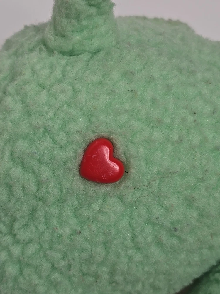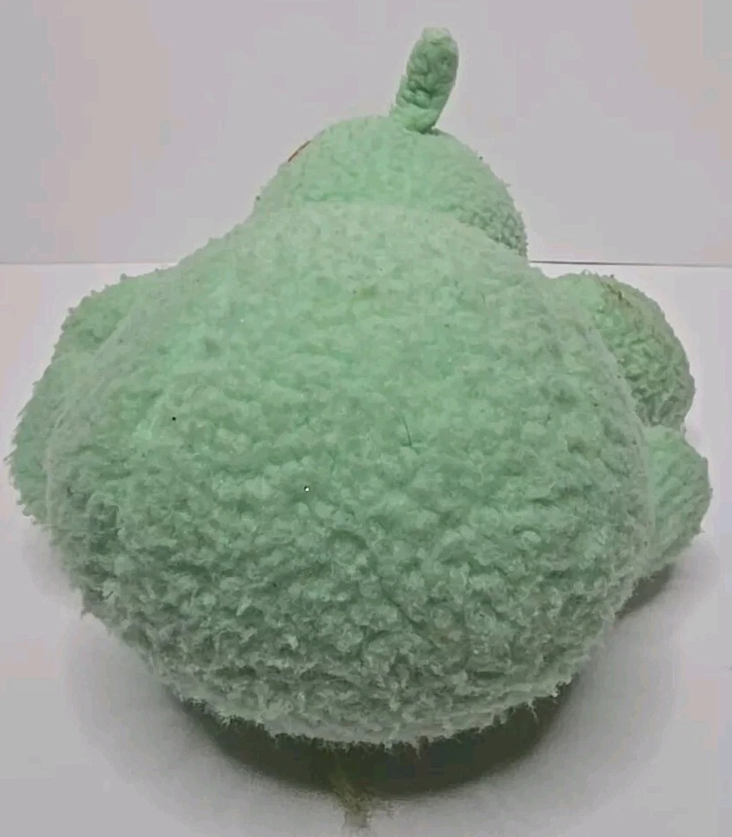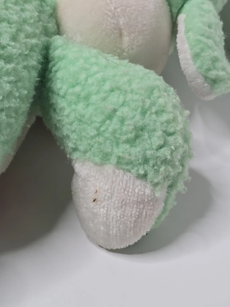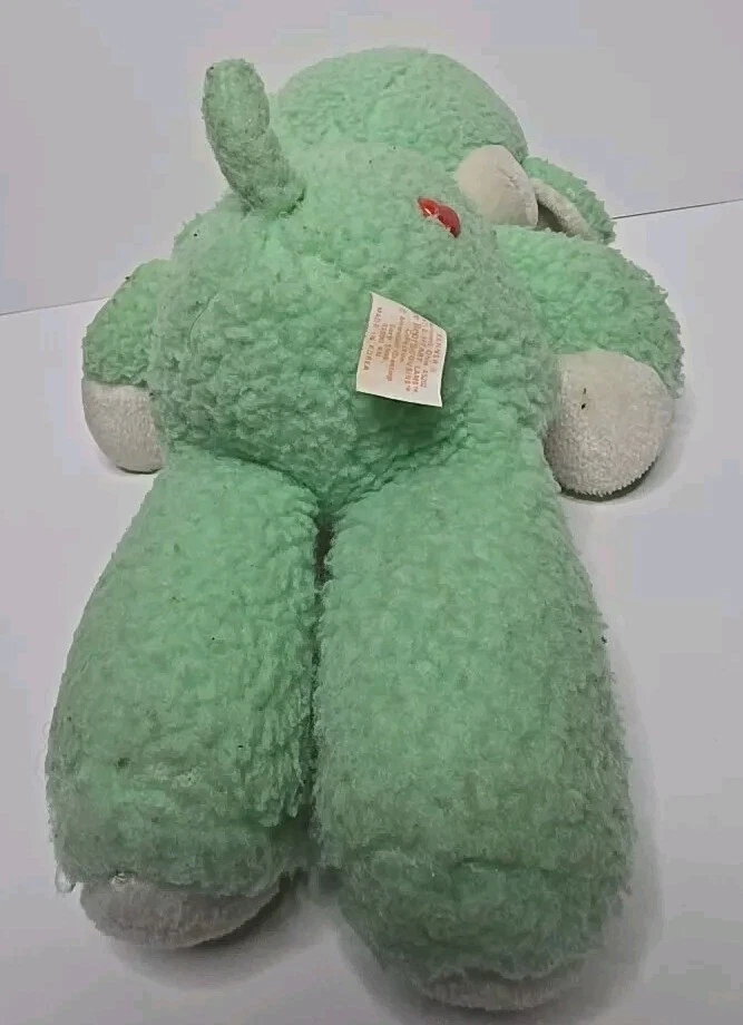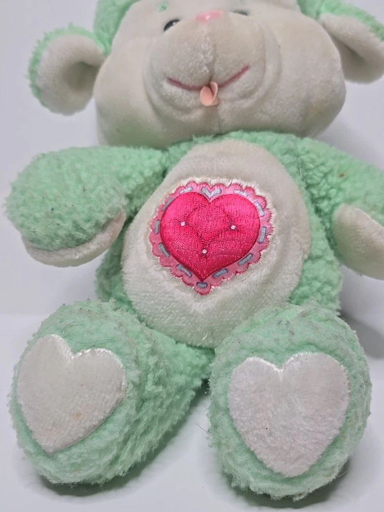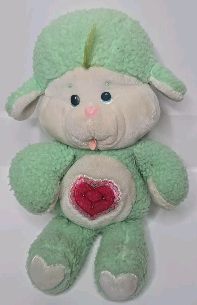 This vintage 1984 Care Bear Cousins Gentle Heart Lamb plush toy is a 13-inch green stuffed animal from the Care Bears franchise. Made of plush material, this gentle lamb with blue eyes is a nostalgic collectible from the 1980s. Manufactured by Kenner in Taiwan, this Care Bear Cousins toy is a beloved piece for fans of vintage Care Bears merchandise. Perfect for collectors or nostalgic individuals, this adorable Gentle Heart Lamb is a charming addition to any Care Bears collection. DOES HAVE STAINS , SHOWN IN PICTURES. SOLD AS IS.