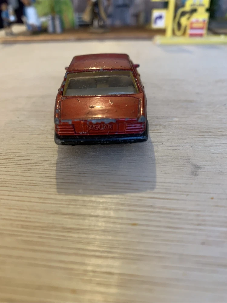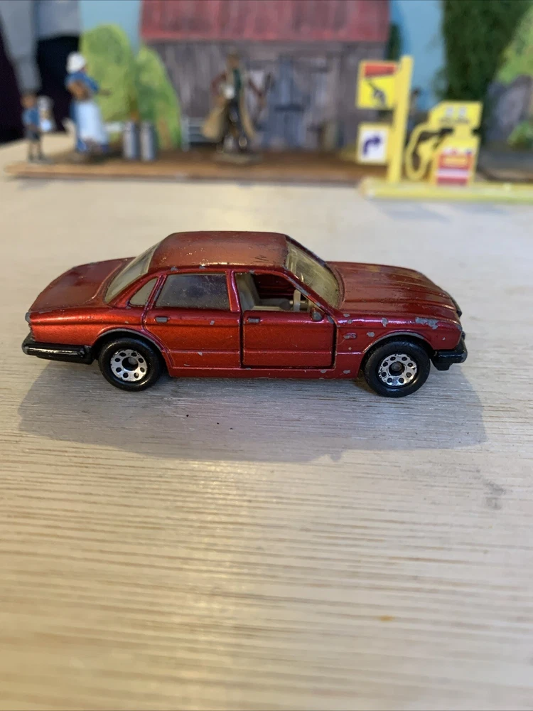 This is a vintage 1984 Matchbox Jaguar XJ6 diecast car in red. It is a rare model with opening doors, representing a classic Jaguar vehicle from the 1980s. The scale of the model is 1:64, making it a detailed and collectible piece for car enthusiasts. Made of diecast material, this Matchbox toy car captures the essence of the original Jaguar XJ6 in a smaller scale, perfect for display or play. Used condition