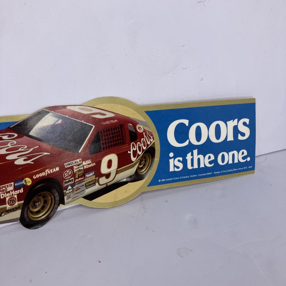 The product is an original 1985 Bill Elliot #9 Coors is the one bumper sticker decal measuring 10 inches in size. This decal is a piece of fan apparel and souvenir associated with NASCAR auto racing, specifically featuring Bill Elliot and Coors beer. It serves as a collectible item for fans of the sport and the driver. This decal is a nostalgic piece that would appeal to fans of vintage racing memorabilia.