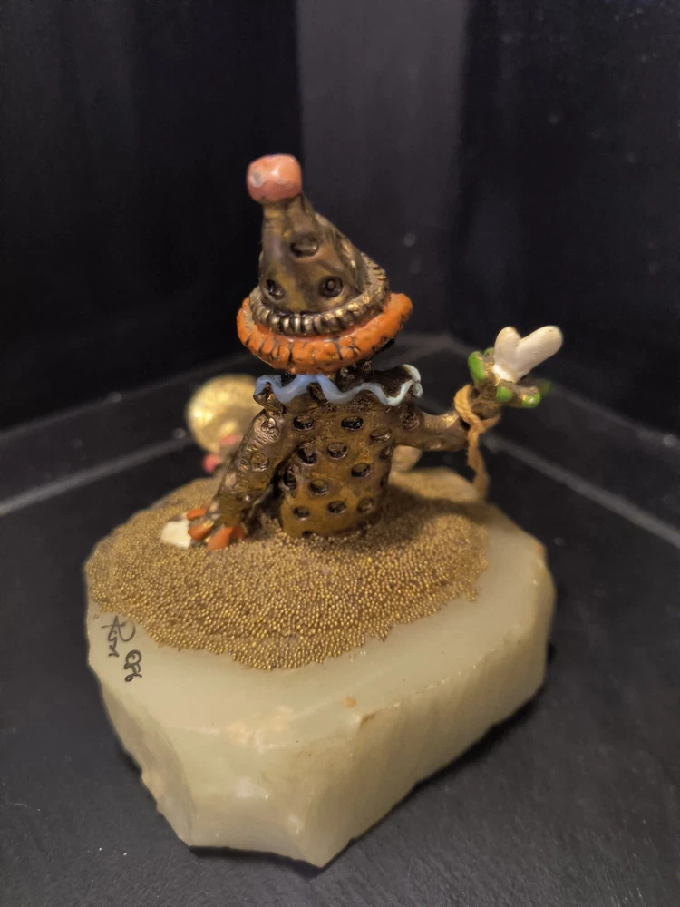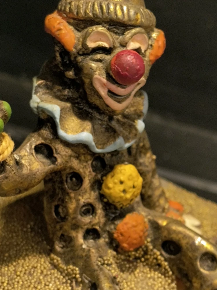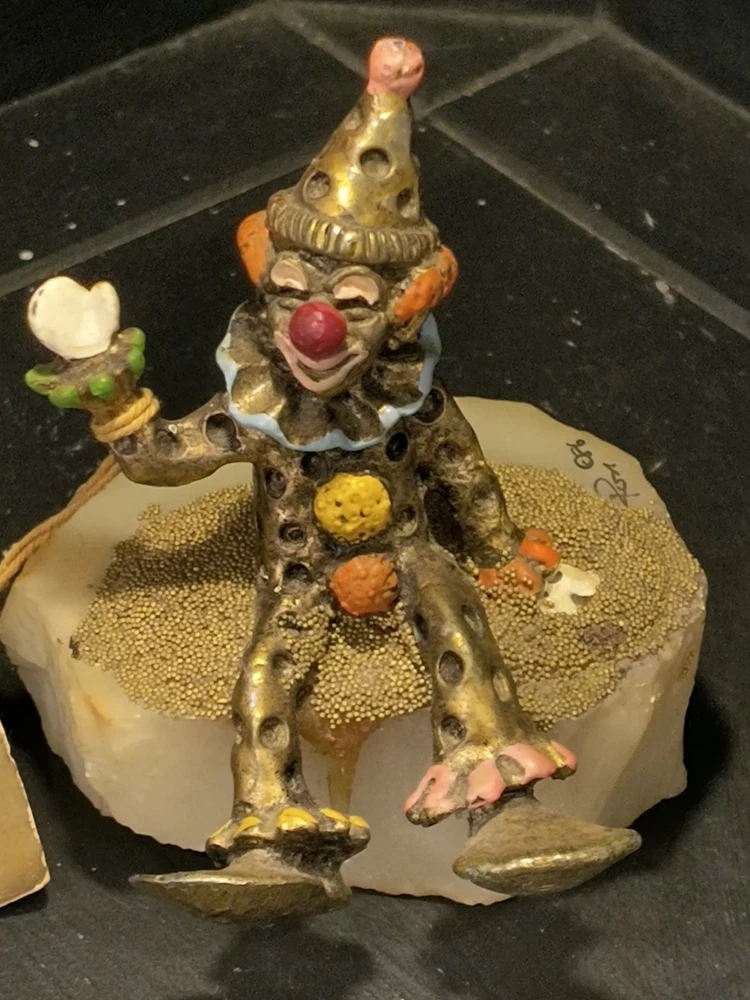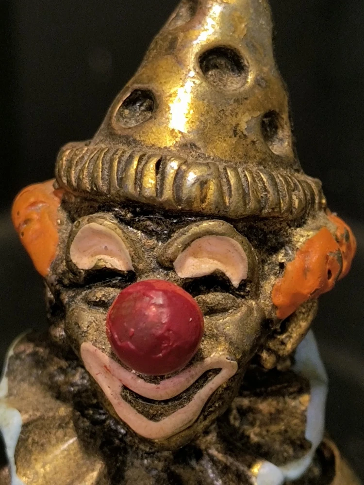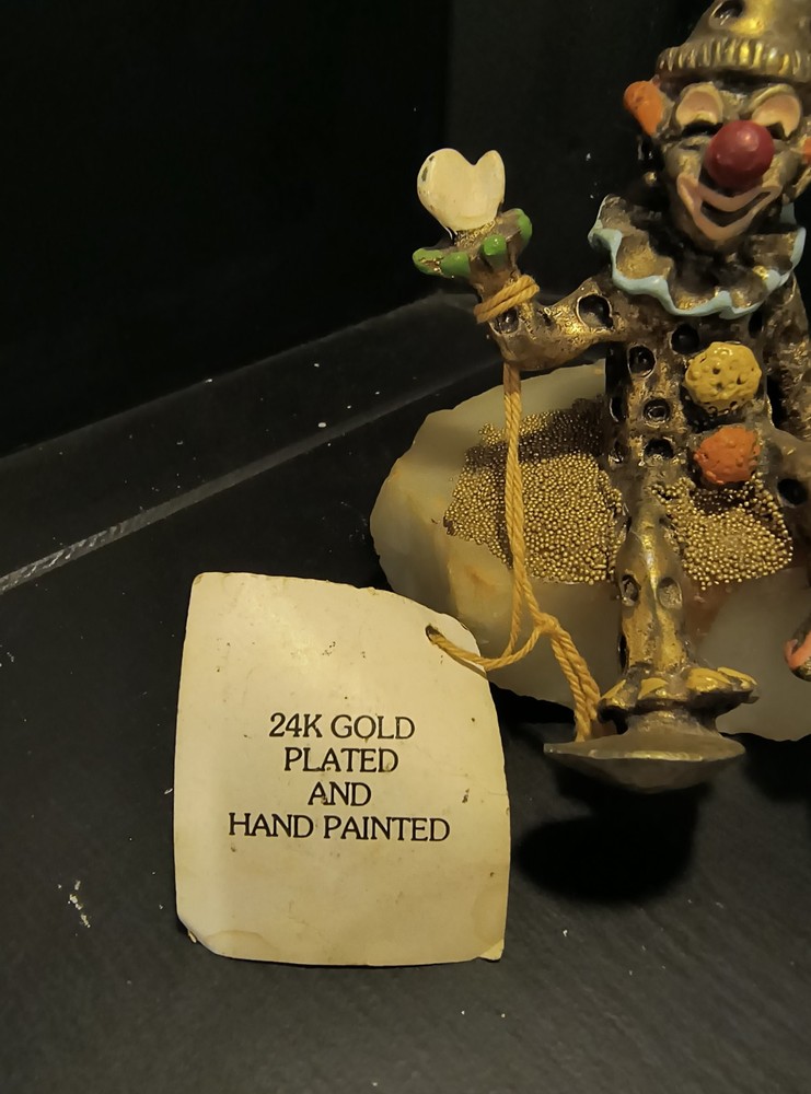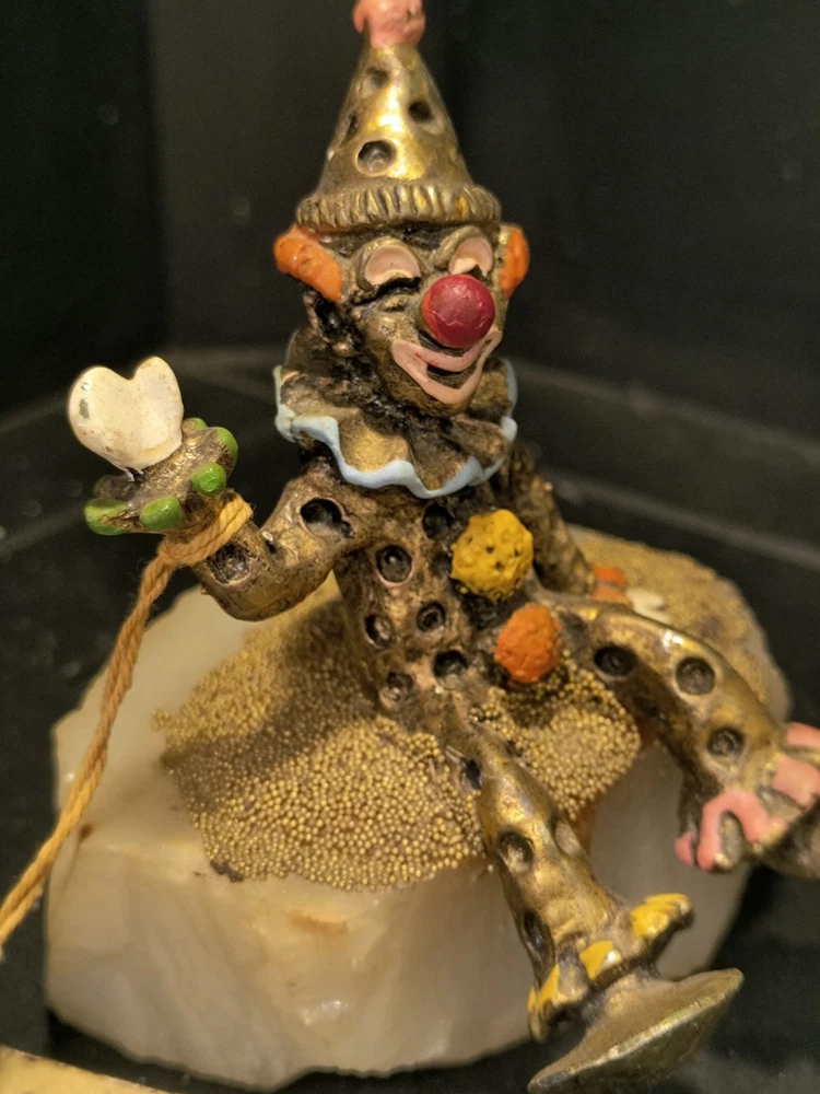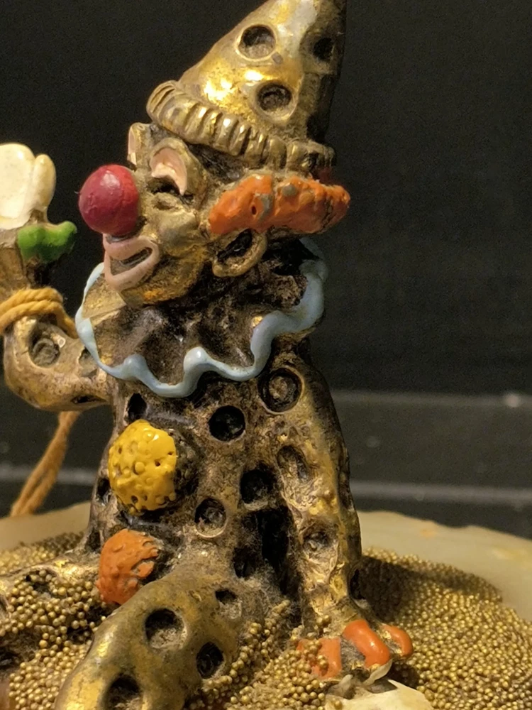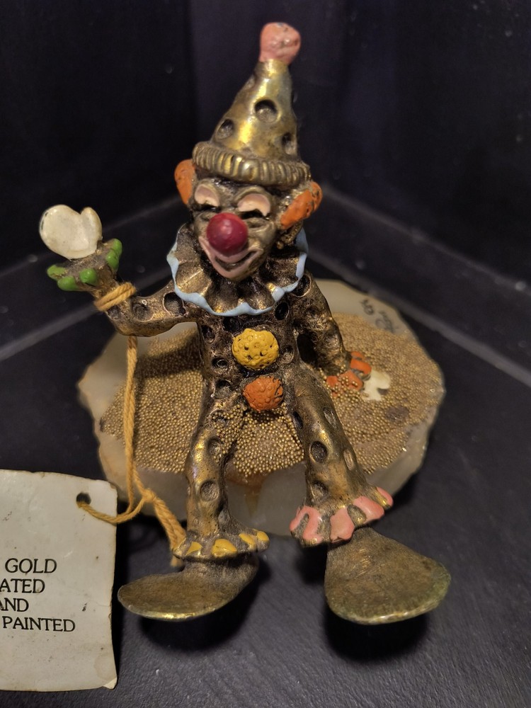 Vintage Ron Lee Waving Clown Sculpture 4.5 Inches 1986 This is a Ron Lee Clown figurine, a collectible sculpture known for its 24K gold-plated details and hand-painted features. Here's some helpful information about it: Artist: Ron Lee (1947-2001) was an American artist famous for his whimsical clown figurines. Material: The figurine is made of pewter with 24K gold plating and sits on a stone or marble base. Signature: Most Ron Lee figurines are signed and dated by the artist. The one in the image is signed "Ron c86". Year of Production: 1986 Design: The clown is sitting and waving, with a polka-dot outfit and a ruffled collar. Collectibility : Ron Lee's clown figurines are popular among collectors, and their value can vary depending on the rarity, condition, and age. Care: These figurines should be handled with care to avoid damage to the delicate gold plating and paint.