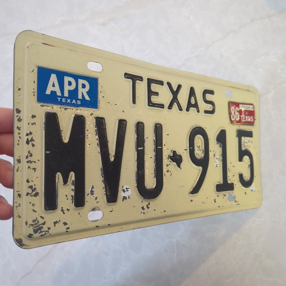 Authentic 1986 Texas license plate with original registration sticker still attached. Heavy paint wear from age and use, giving it great patina and character. Highly collectible state and perfect for rustic or industrial décor. Details: State: Texas Year: 1986 Original registration sticker Condition: Fair vintage condition with visible wear Single plate