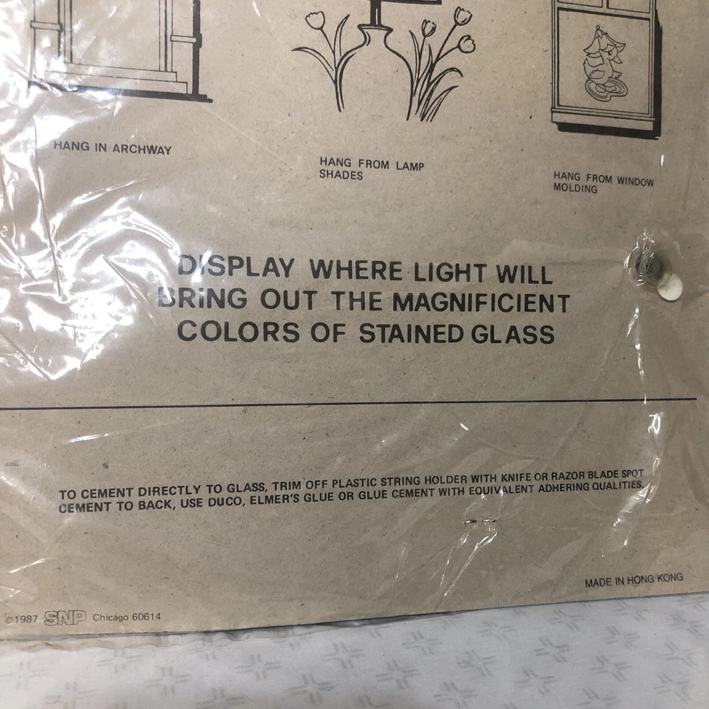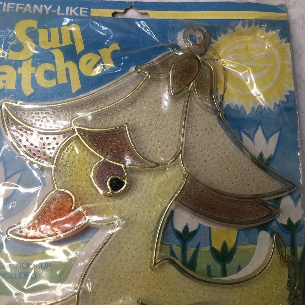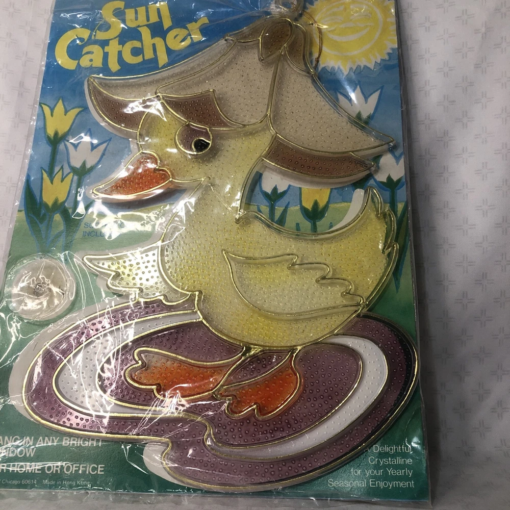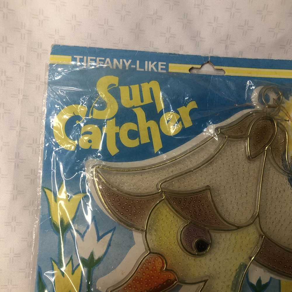 Add a touch of vintage charm to your home decor with this Tiffany-Like Duck Sun Catcher from 1986. This decorative suncatcher features a beautiful design that is sure to catch the eye of anyone who sees it. It is perfect for adding a cozy and welcoming atmosphere to any room in your home. Crafted with care, this suncatcher is a great addition to your collection of decorative accessories. It is a perfect gift for your loved ones or a nice treat for yourself. The duck design is whimsical and playful, making it a great addition to any space. This suncatcher is a great way to bring a touch of nature into your home. ** as seen in photos ,, yellow is faded in the duck design.