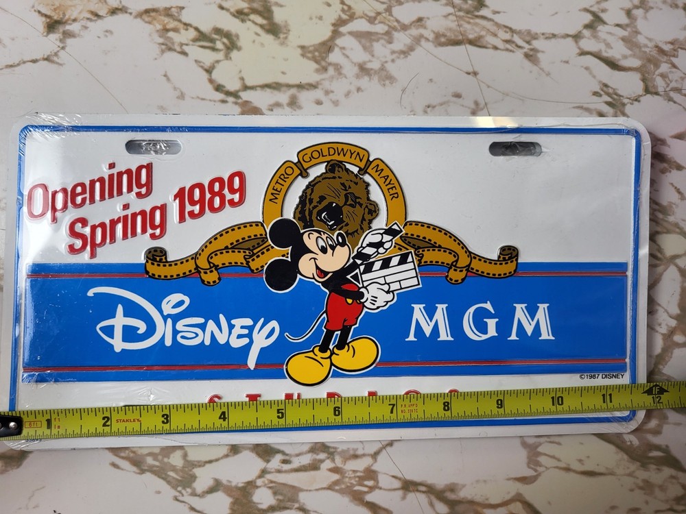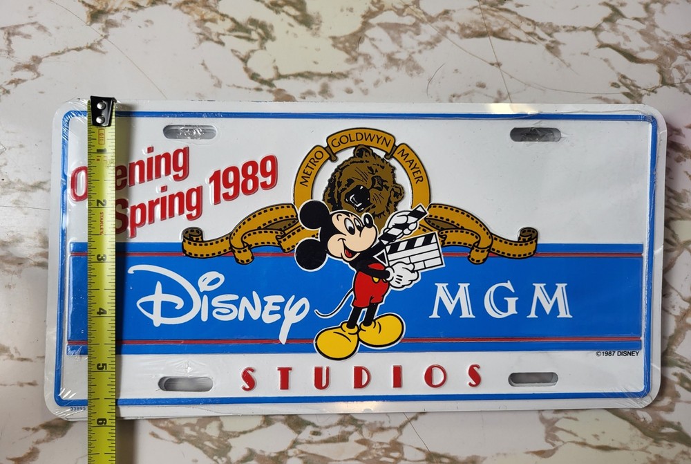 The product is a vintage 1987 Disney MGM Studios license plate featuring Mickey Mouse, sealed and in new old stock (NOS) condition. This collectible item is from the Disney franchise and was issued in 1987 to commemorate the opening of MGM Studios in 1989. It serves as a unique piece of Disney memorabilia, reflecting the history and iconic characters of the Disney brand. Perfect for Disney collectors and fans of Mickey Mouse, this license plate is a nostalgic and exclusive souvenir from the early days of Disney theme park attractions. #0335