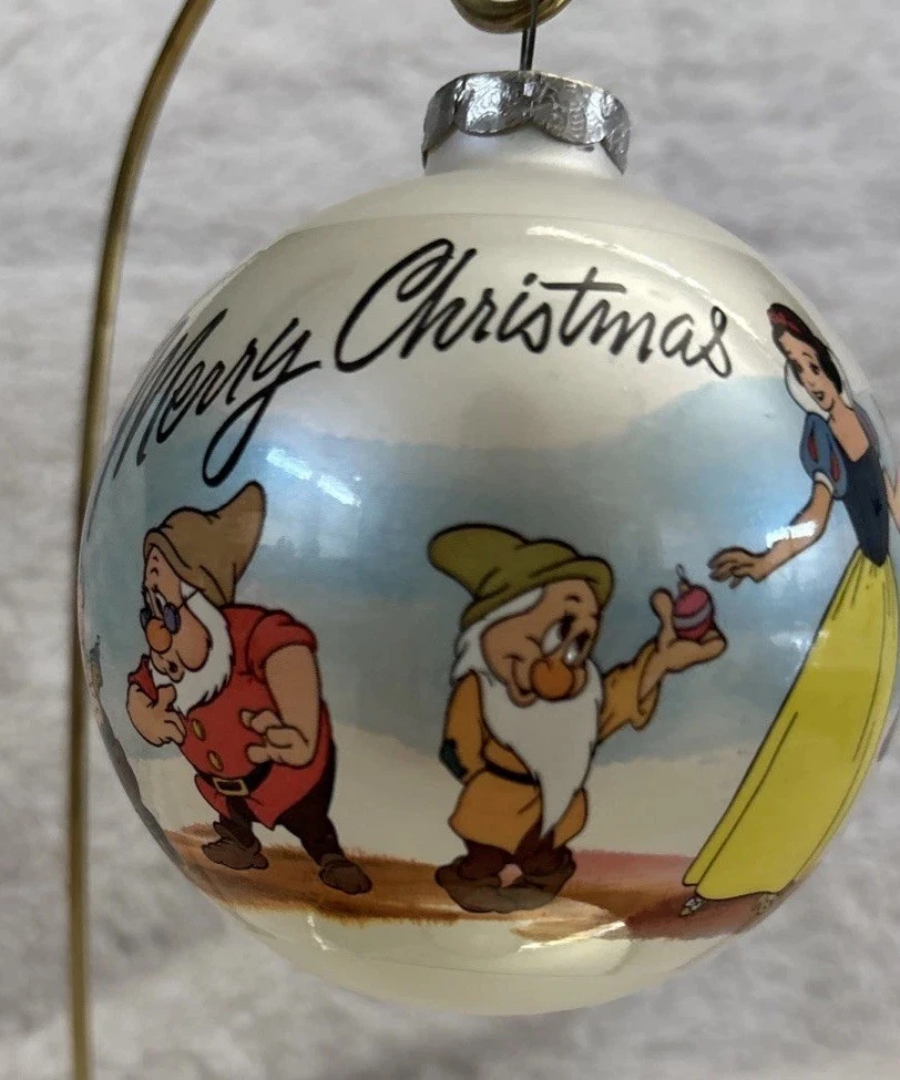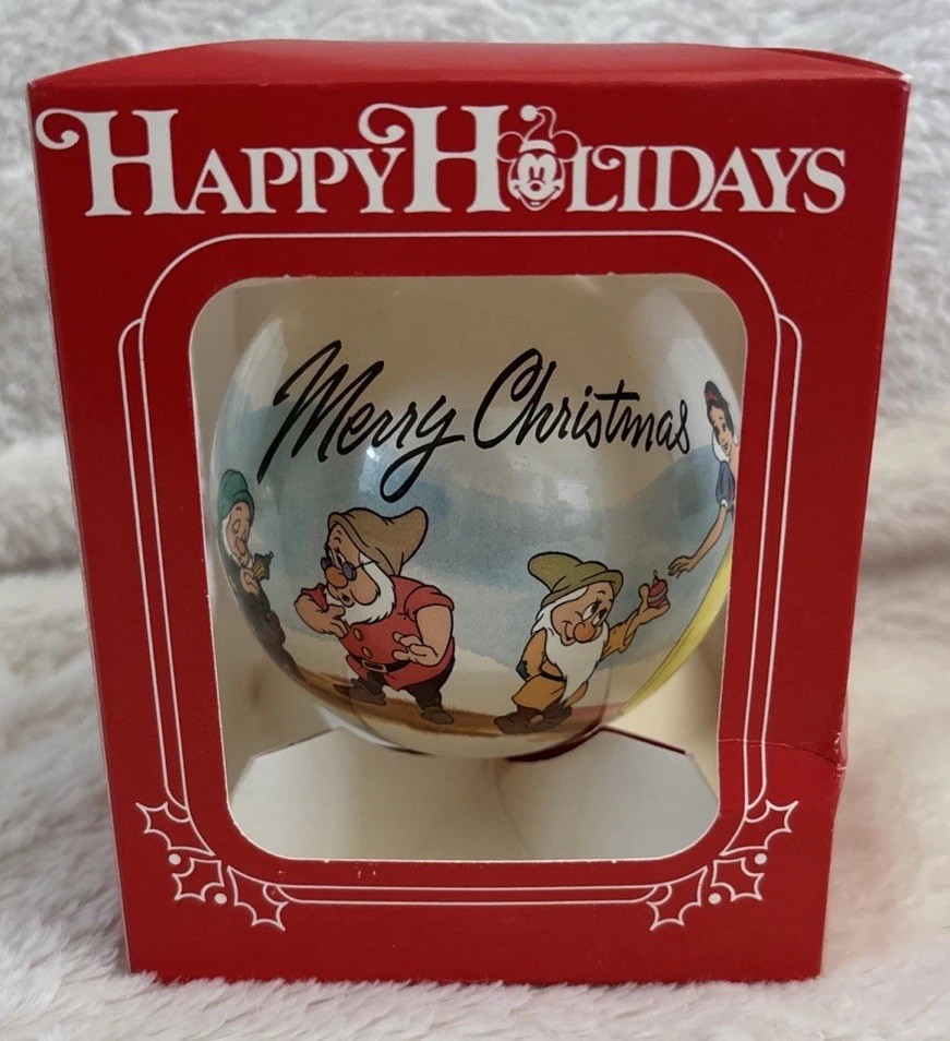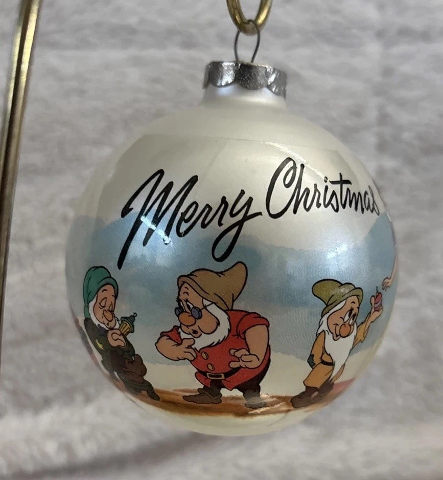 The Vintage 1987 Snow White and the 7 Dwarfs Disney Store Christmas Ornament is a collectible item featuring the beloved characters from Disney's Snow White franchise. Made of glass and produced by Disney in 1987, this ornament showcases the iconic scenes from the classic animated film. It serves as a nostalgic piece for fans of Disney and collectors of vintage memorabilia, adding charm to any holiday decor with its timeless appeal. In original box