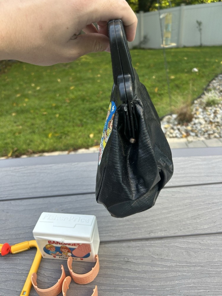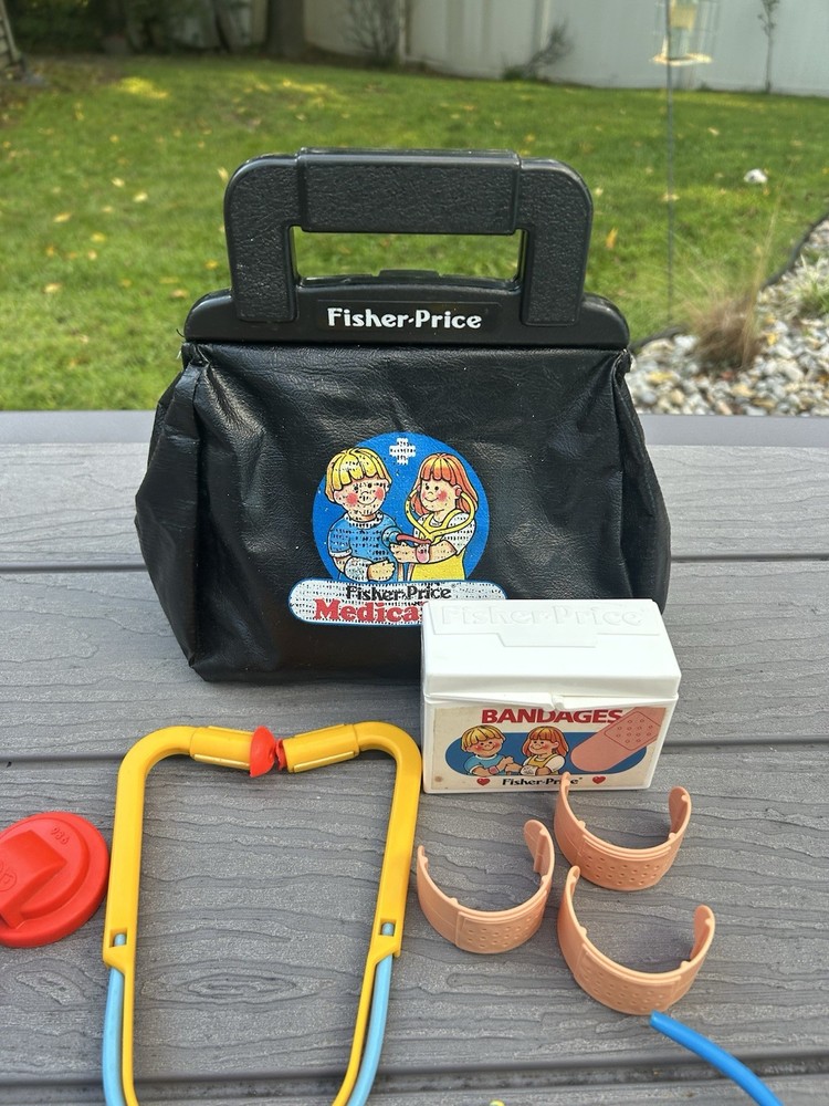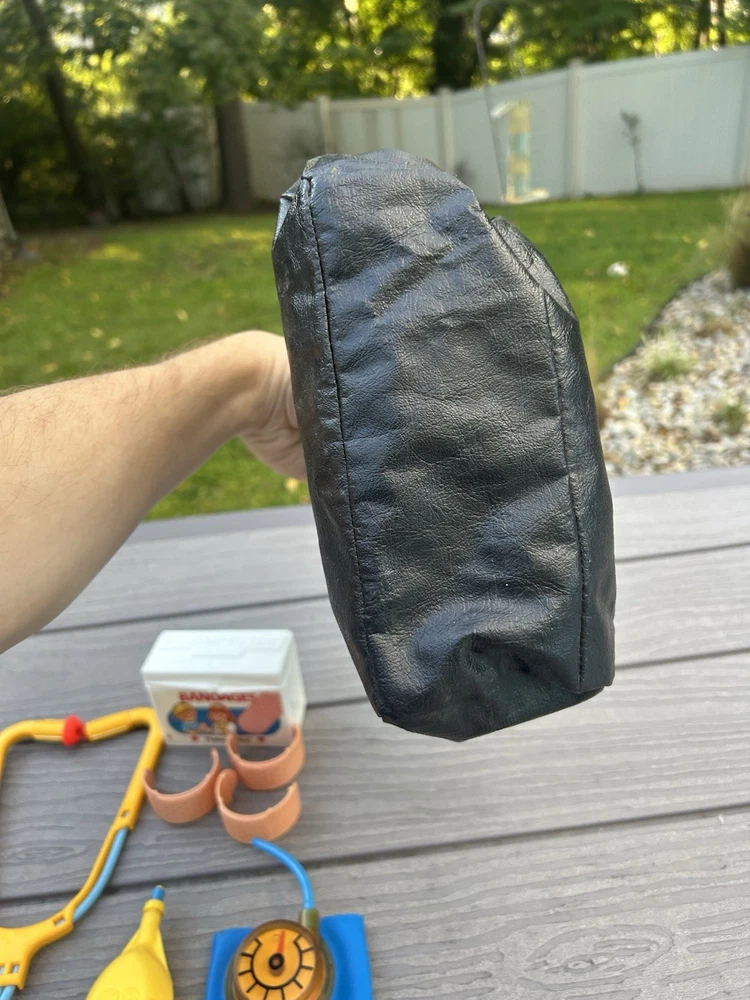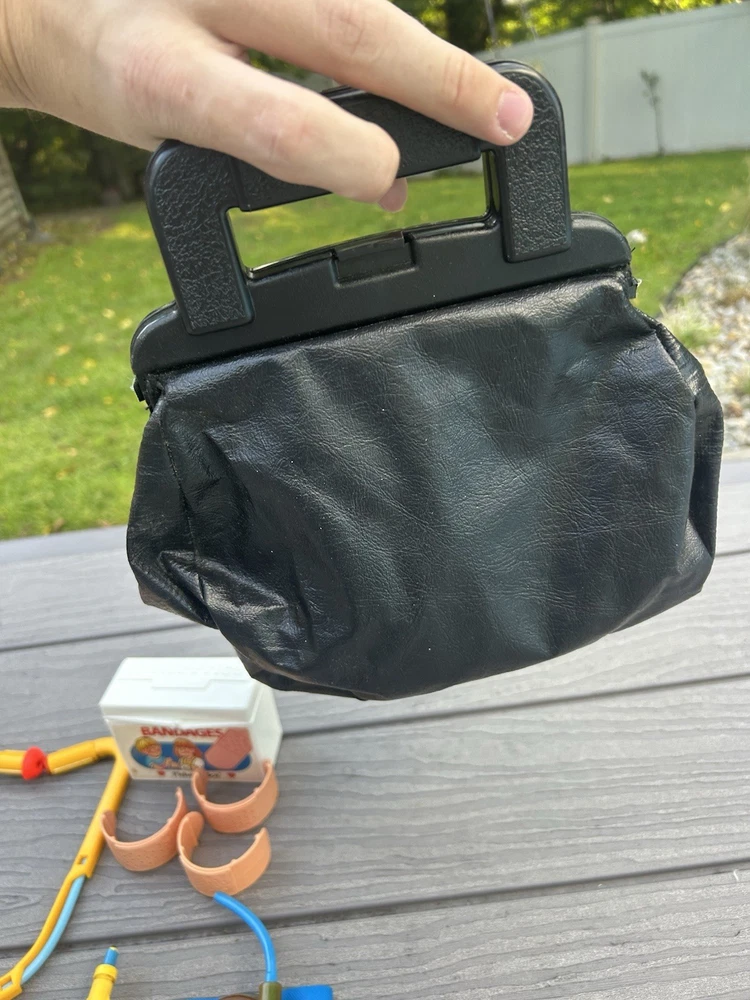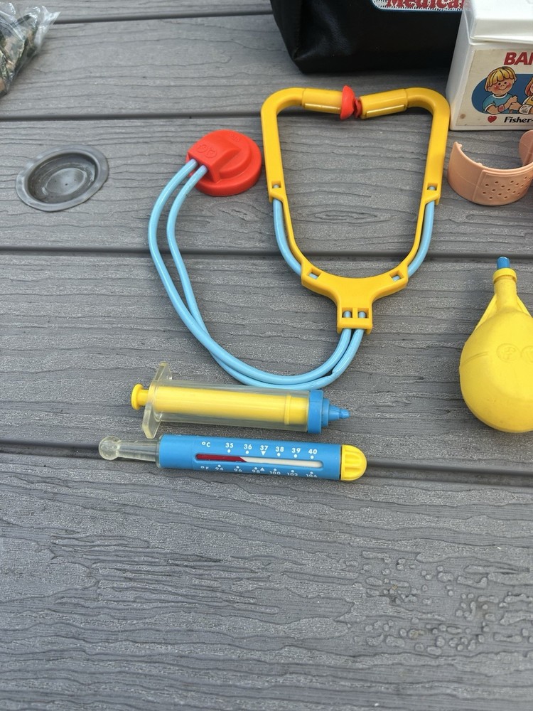 Nice shape has some play wear. Thermometer has some teeth marks on it. Blood pressure checker is broken. Stethoscope has some damage