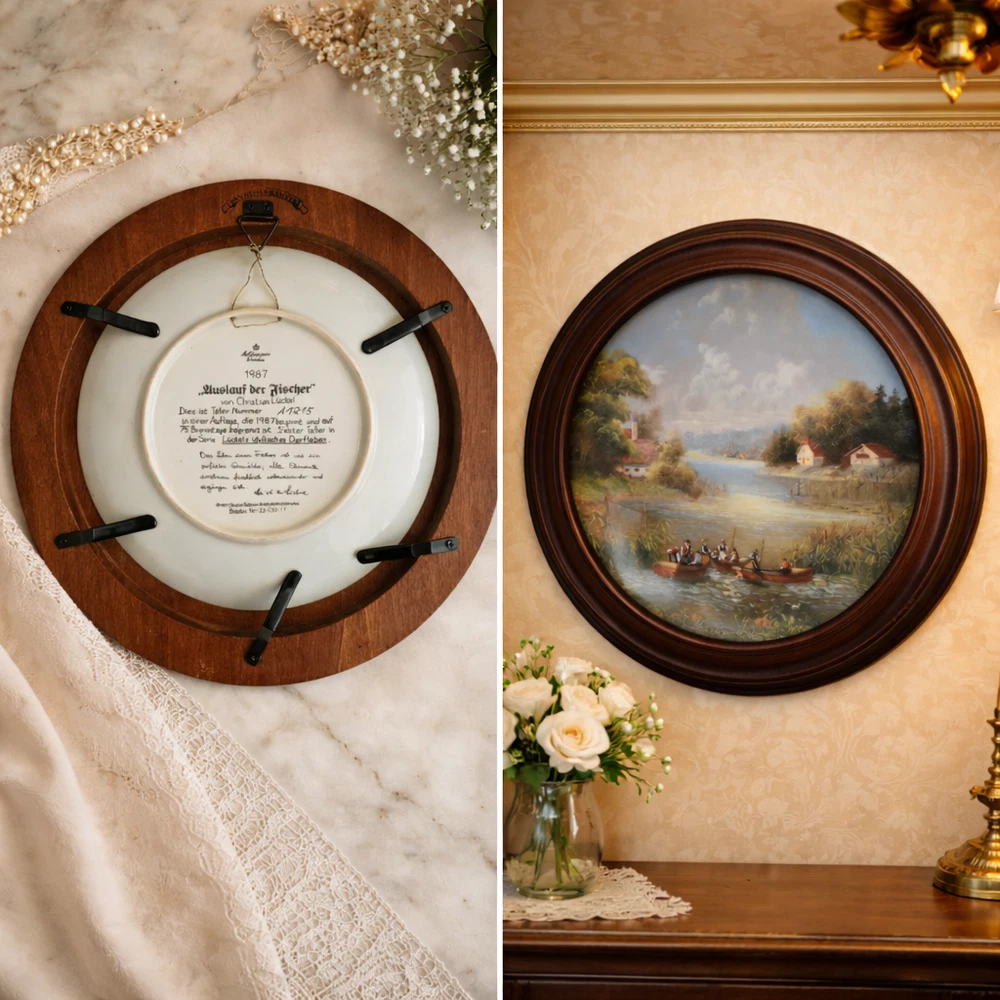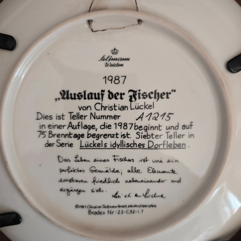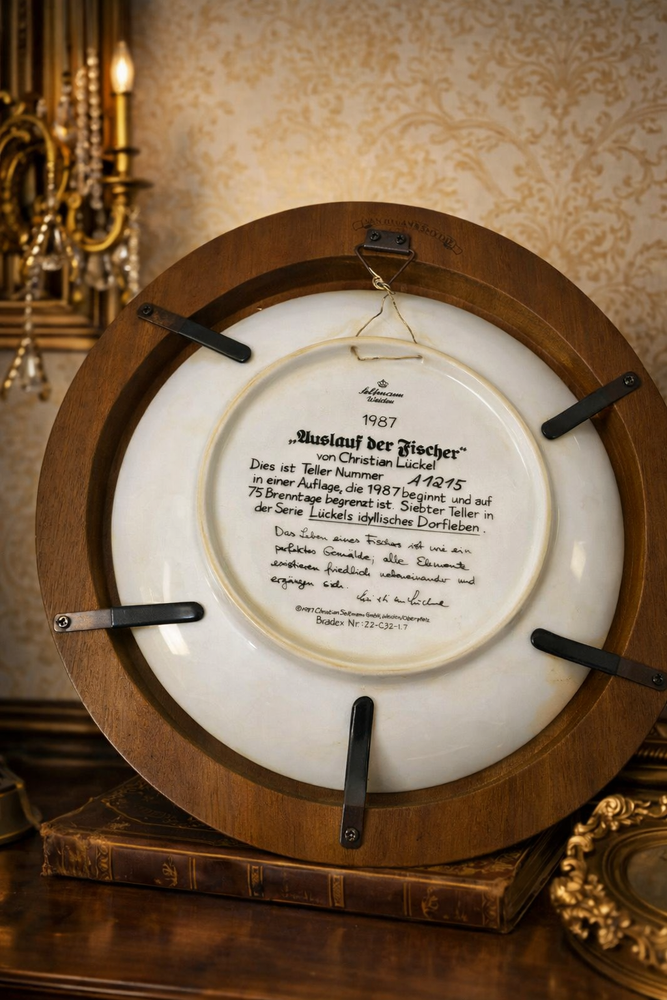 Step into a peaceful European riverside scene with this beautiful 1987 Seltmann Weiden collector plate titled “Auslauf der Fischer” by artist Christian Lückel. The artwork captures fishermen quietly rowing across the river while the countryside relaxes around them. It’s the kind of calm scene that makes you feel like you should be drinking coffee ☕ , enjoying the view, and pretending you totally understand fishing culture. This plate is part of the charming series “Lückels idyllisches Dorfleben” and comes mounted in a wooden frame, ready to hang and instantly add vintage character to any wall. Perfect for collectors, lovers of European countryside art, or anyone who believes their wall deserves a little more peaceful river energy 🌿 . ✨ Details • Brand: Seltmann Weiden (Germany) 🇩🇪 • Year: 1987 • Artist: Christian Lückel • Title: Auslauf der Fischer • Series: Lückels idyllisches Dorfleben • Limited edition collector plate • Plate Number: A1215 Diameter: 26 cm(10.23 inch) • Mounted in wooden frame and ready to hang 🖼️