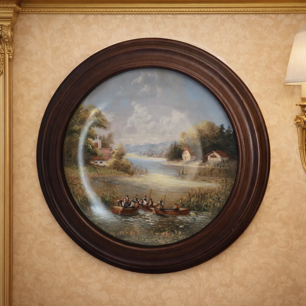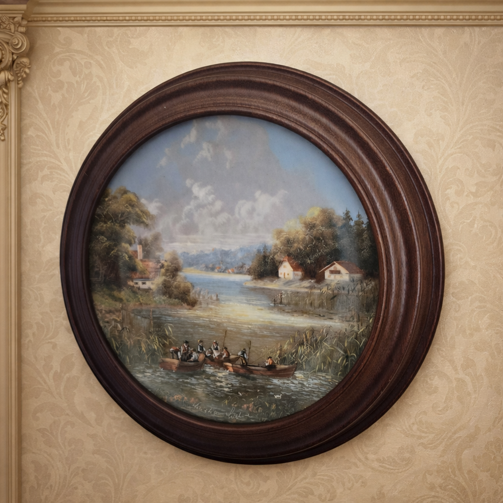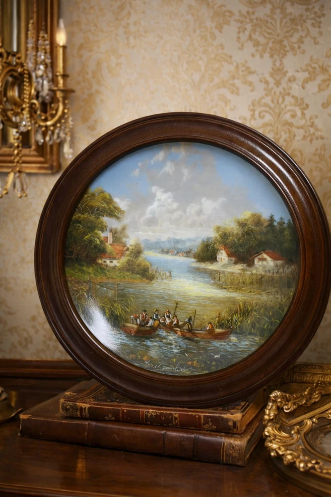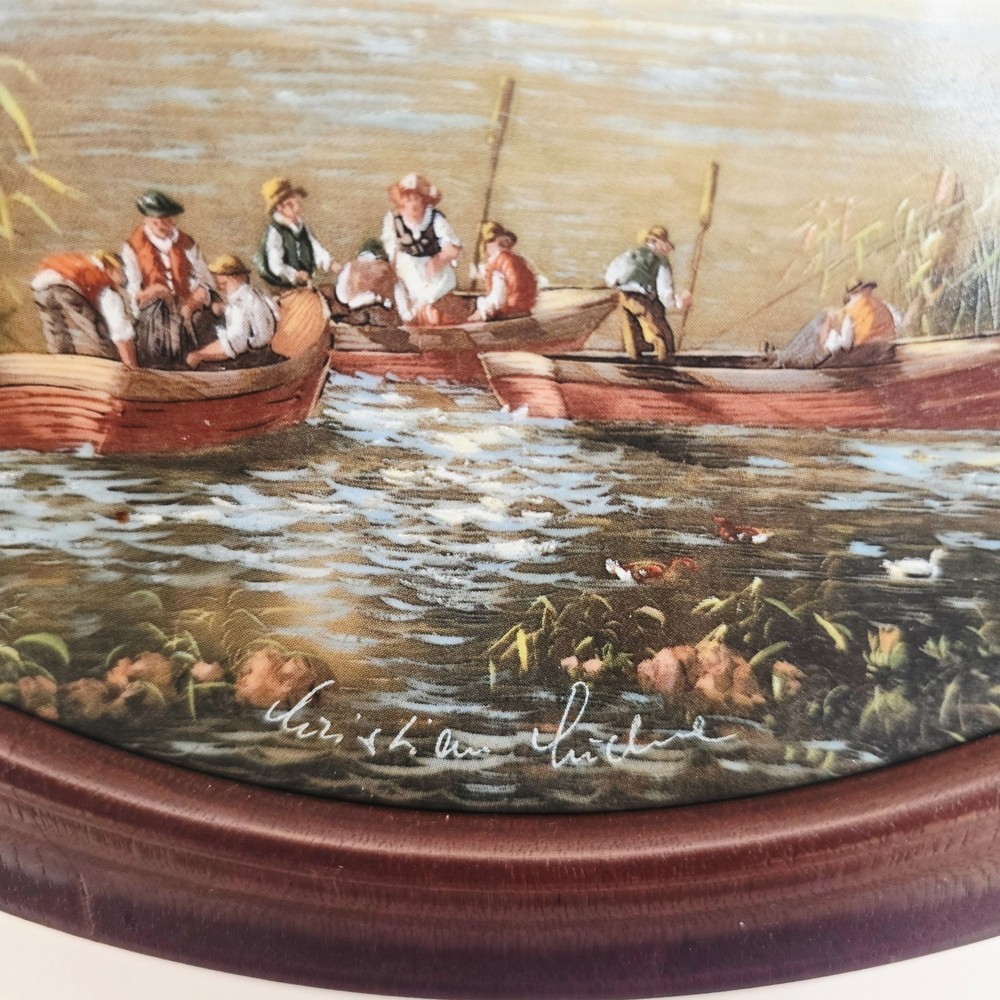Step into a peaceful European riverside scene with this beautiful 1987 Seltmann Weiden collector plate titled “Auslauf der Fischer” by artist Christian Lückel. The artwork captures fishermen quietly rowing across the river while the countryside relaxes around them. It’s the kind of calm scene that makes you feel like you should be drinking coffee ☕ , enjoying the view, and pretending you totally understand fishing culture. This plate is part of the charming series “Lückels idyllisches Dorfleben” and comes mounted in a wooden frame, ready to hang and instantly add vintage character to any wall. Perfect for collectors, lovers of European countryside art, or anyone who believes their wall deserves a little more peaceful river energy 🌿 . ✨ Details • Brand: Seltmann Weiden (Germany) 🇩🇪 • Year: 1987 • Artist: Christian Lückel • Title: Auslauf der Fischer • Series: Lückels idyllisches Dorfleben • Limited edition collector plate • Plate Number: A1215 Diameter: 26 cm(10.23 inch) • Mounted in wooden frame and ready to hang 🖼️