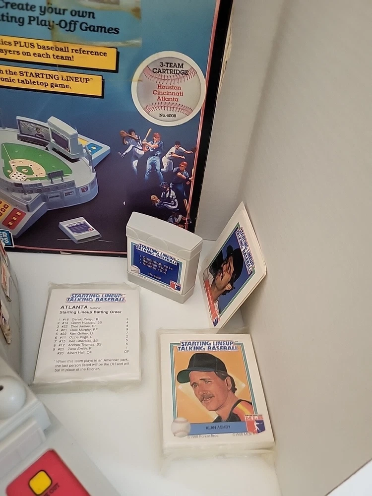 This vintage 1988 Parker Brothers Starting Lineup Talking Baseball Game is a must-have for any game collector. It comes with cartridges and is perfect for those who love board and traditional games. The game is made by a well-known brand, Parker Brothers, and is sure to provide hours of entertainment. The game is perfect for those who love baseball and want to experience it in a unique way. It is great for family game nights or for groups of friends who want to spend time together. This item falls under the Toys & Hobbies, Games, Board & Traditional Games, and Vintage Manufacture categories. *As is! Some stickers are curled up Battery compartment needs cleaning. New cartridge and 2 unopened packages of cards.