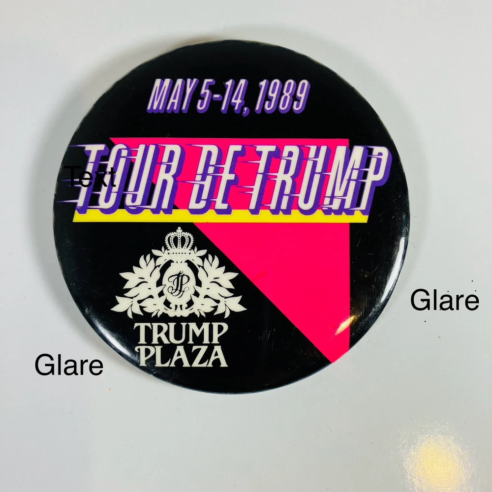 RARE and HARDER TO FIND...Take a piece of history with this vintage 1989 Trump Plaza Atlantic City "Tour De Trump" button. This collectible item features President Trump and is perfect for any fan of casinos or collectibles. The button is a great addition to any collection and is sure to impress. Don't miss out on the opportunity to own this unique piece of memorabilia. Size is approximately 3"x3". NOTE : Shows moderate use/wear. Please view photos for condition and additional details prior to purchasing. Ships via USPS Mail. ABOUT THE SELLER: Seller does NOT use stock photos. The item photographed in the listing is the EXACT item you will be receiving. Seller does NOT profit from shipping and uses Calculated Shipping to insure that each customer is charged only the amount that the carrier charges.