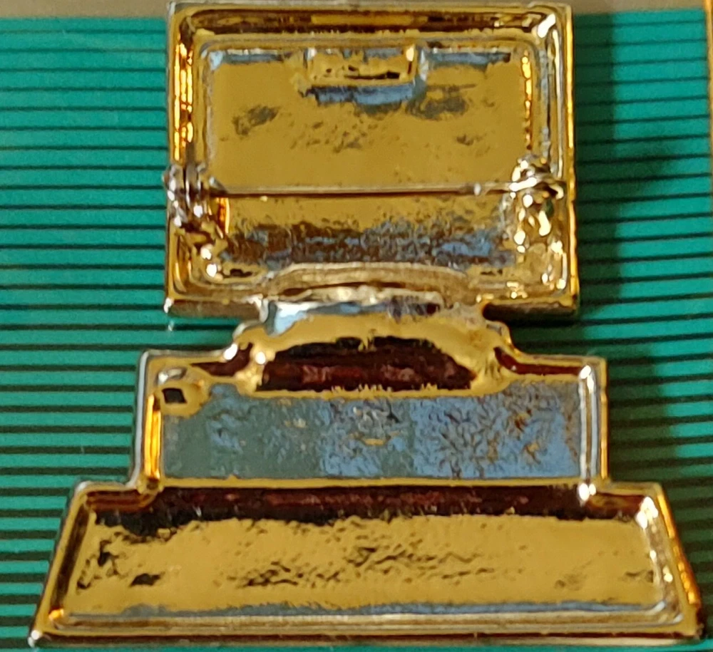 This Vintage Desktop PC Lapel Pin is a playful reminder of how far modern technology has come. This pin is gold color plated, and polished to a smooth and shiny finish. It's the perfect pin for any computer loving friend or vintage PC enthusiast. This pin includes a standard clutch back that keeps this pin securely in place on your garment, backpack, hat, lanyard and ID badge. Please review each picture carefully for any color variation or imperfections. This is a vintage piece that is new and unused without tags or packaging. Shows very little imperfections from storage.