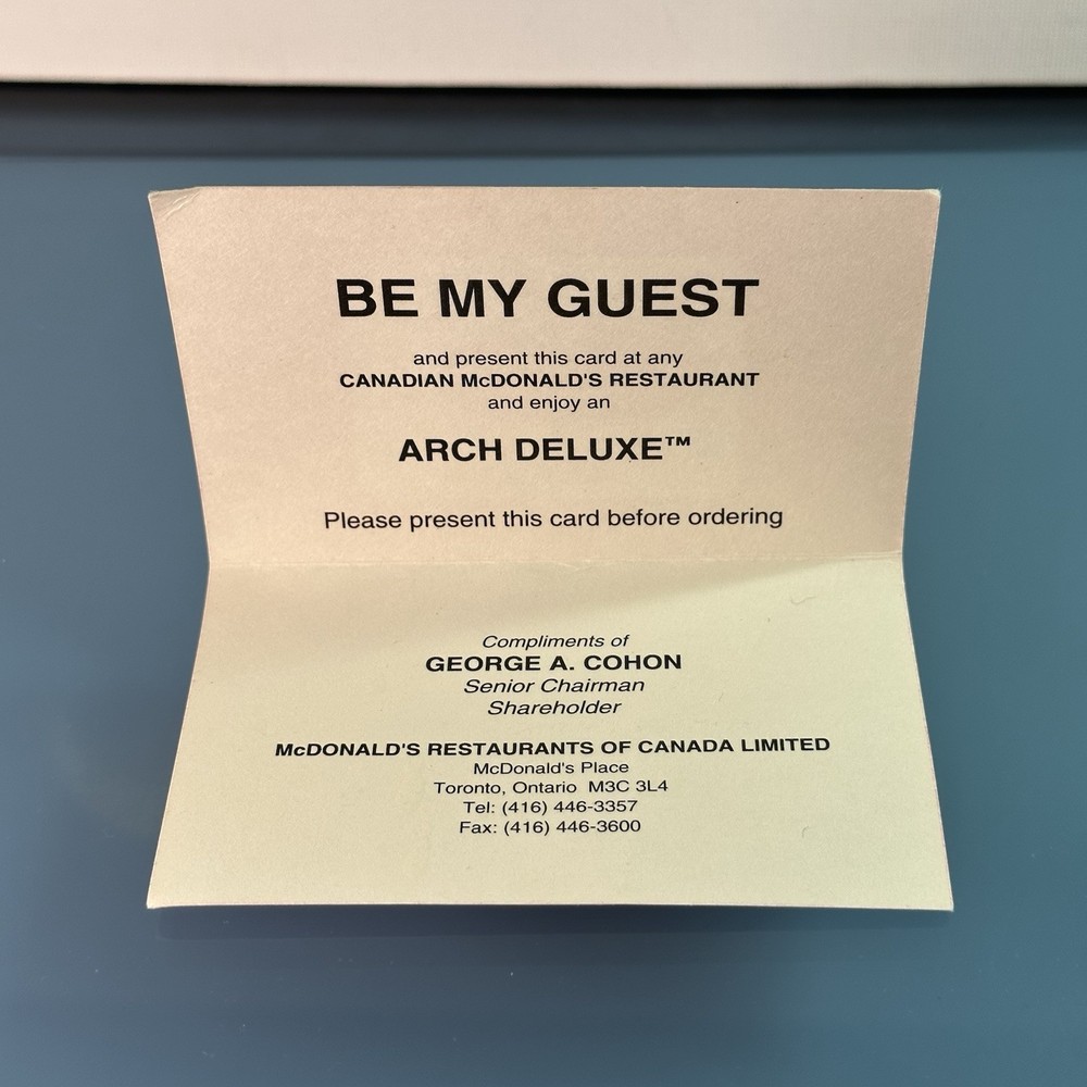 Vintage McDonald’s Canada Arch Deluxe Voucher Promotional free meal voucher from McDonald’s Canada, issued under George A. Cohon (founder of McDonald’s Canada). Text offers one free entrée “courtesy of George Cohon” and features the Arch Deluxe branding — McDonald’s premium burger introduced in the mid-1990s. Era: Likely mid-to-late 1990s (the Arch Deluxe was launched in 1996 and discontinued by 2000). Condition: as shown/ great Sold as collectible advertising ephemera only; not valid for redemption. Condition is as shown, item is one of a kind, proper steps will be taken to ensure shipping. CHECK OUT MY OTHER LISTINGS FOR MORE GEORGE COHON PROMOTIONAL ITEMS!