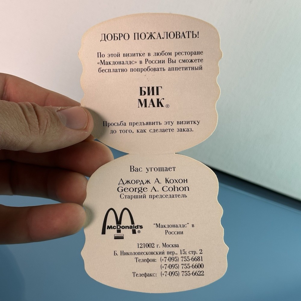 Vintage McDonald’s Russia Big Mac-Shaped Voucher Promotional VIP-style card from McDonald’s Russia, issued under George A. Cohon (founder of McDonald’s Canada and key figure in bringing McDonald’s to Russia). Text in Russian offers a free Big Mac when presented at any McDonald’s in Russia. Features Cohon’s printed name and title, along with the McDonald’s Russia logo and Moscow contact details. Era: Likely early-to-mid 1990s (after McDonald’s arrival in Russia in 1990, before area code changes in the 2000s). Condition: as shown / good Sold as collectible advertising ephemera only; not valid for redemption. item is one of a kind, proper steps will be taken to ensure shipping. CHECK OUT MY OTHER LISTINGS FOR MORE GEORGE COHON PROMOTIONAL ITEMS!