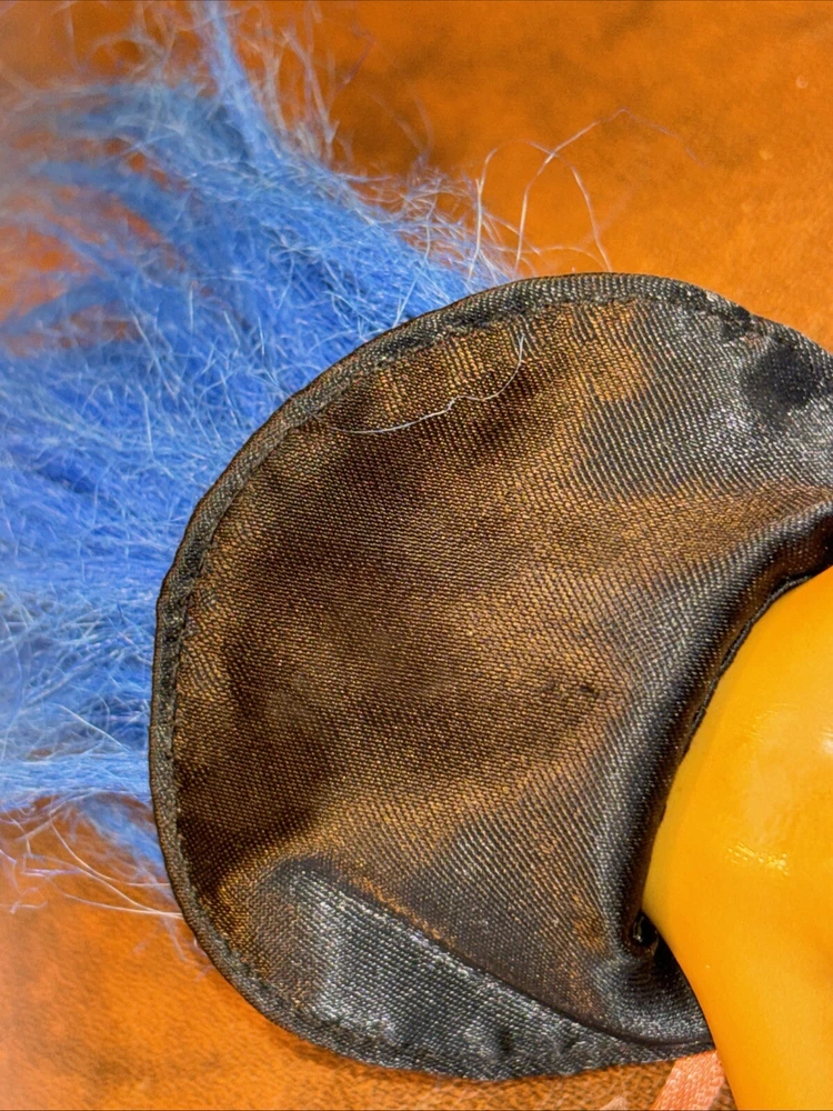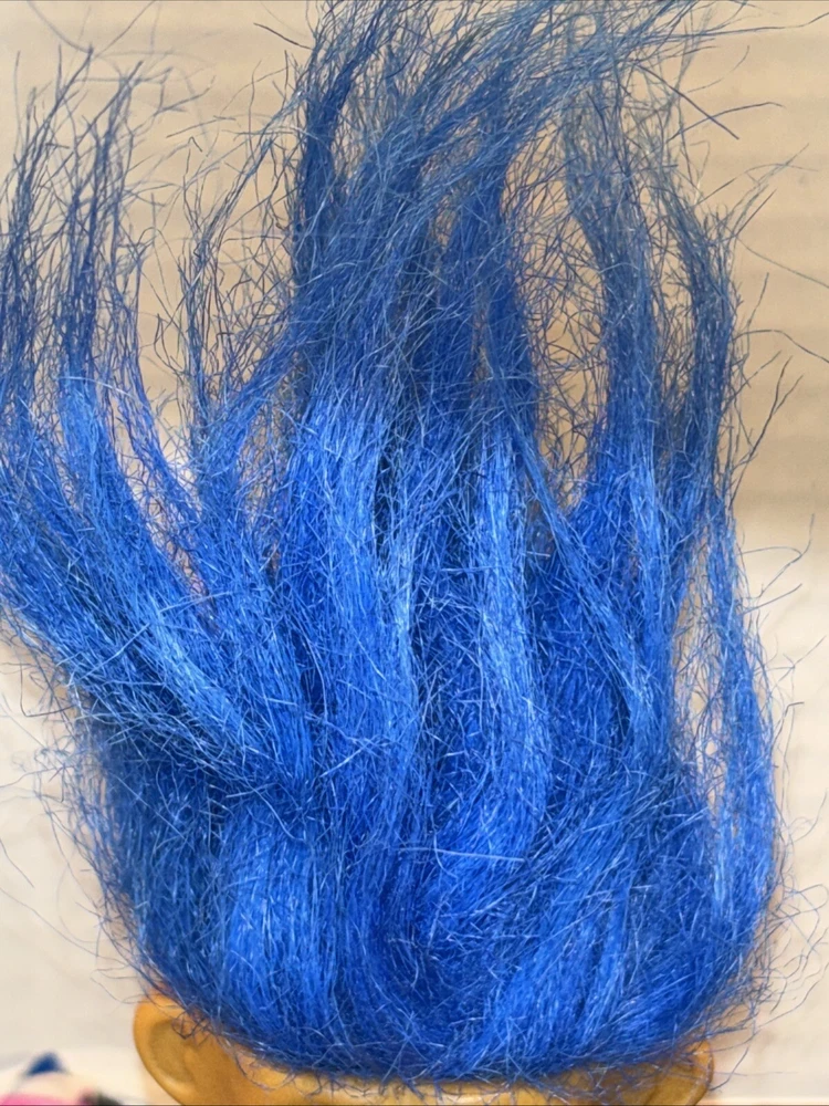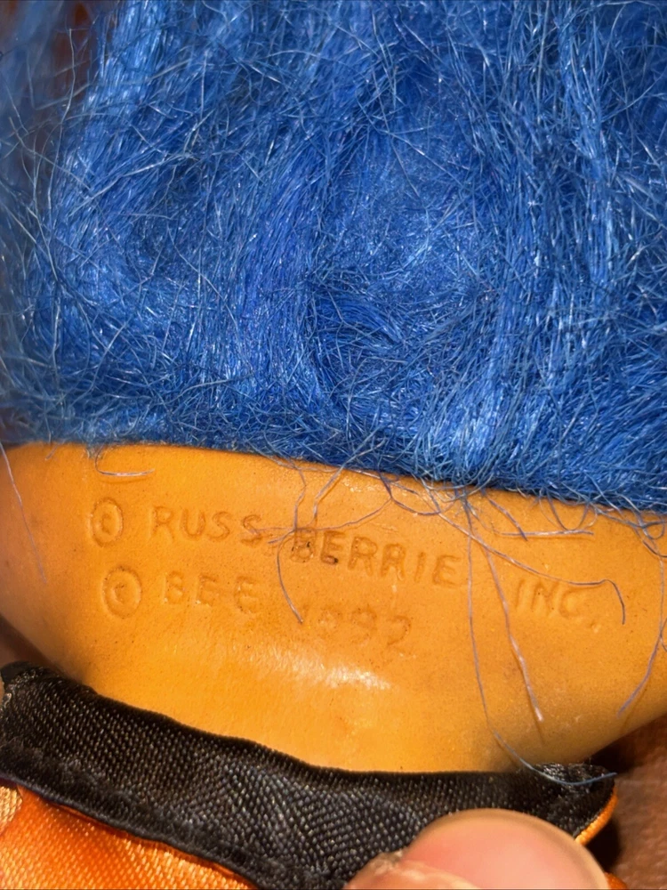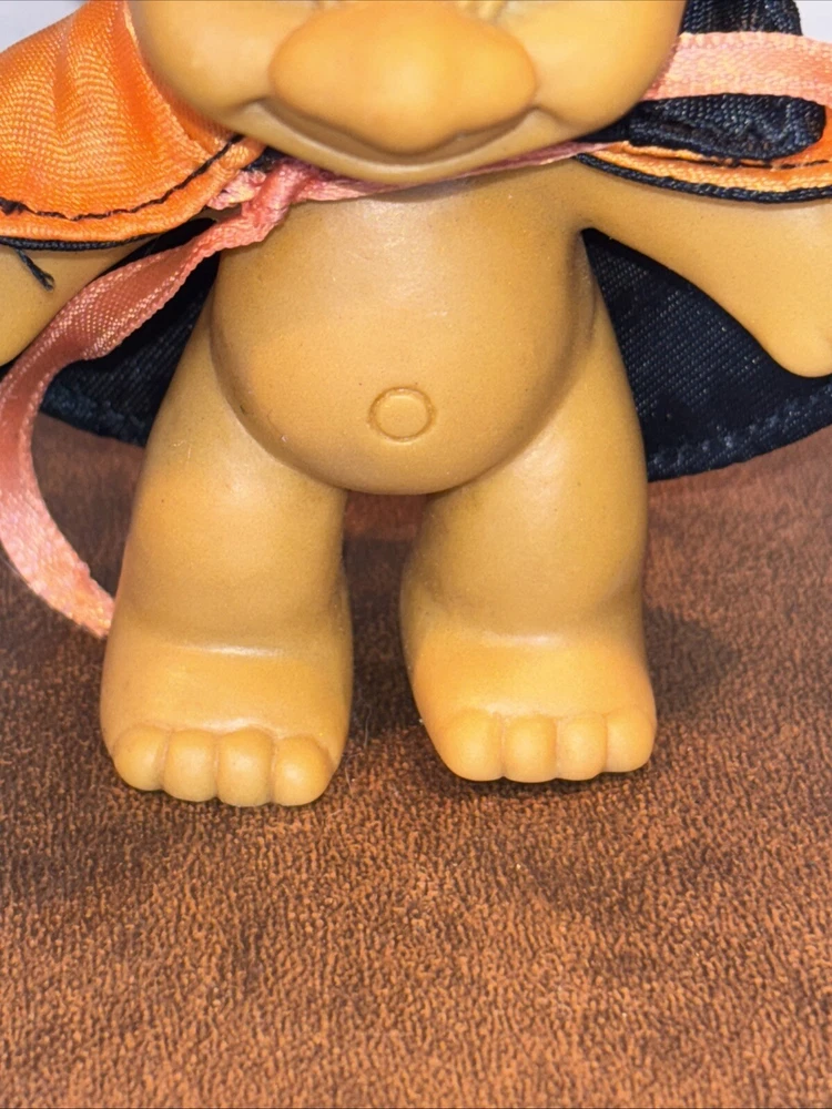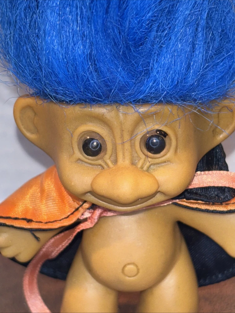 In pre owned excellent condition with very light signs of display ware to the body of the figure with light aging. The Hair is in excellent condition with no signs flaws or ware. Cape is in very good to excellent condition. With very light very faint marks to the back bottom of the orange side. No signs of damage or ware to the black side of the cape. The capes ties show light to light moderate signs of ware with light end edge fraying. (Pictured) Sold as pictured. This vintage 1990s Russ Berrie Troll Doll Figurine is a must-have for any collector or fan of the beloved Troll character. With its blue hair and pink doll hair color, this 3-inch doll is sure to stand out in any collection. The doll's brown eyes add a touch of realism to the overall design. This Troll doll comes with an outfit and is perfect for Halloween or any other occasion. The reversible cape adds an extra level of playability to the doll. Manufactured in the 1990s, this doll is a true gem for collectors looking for a piece of nostalgia.