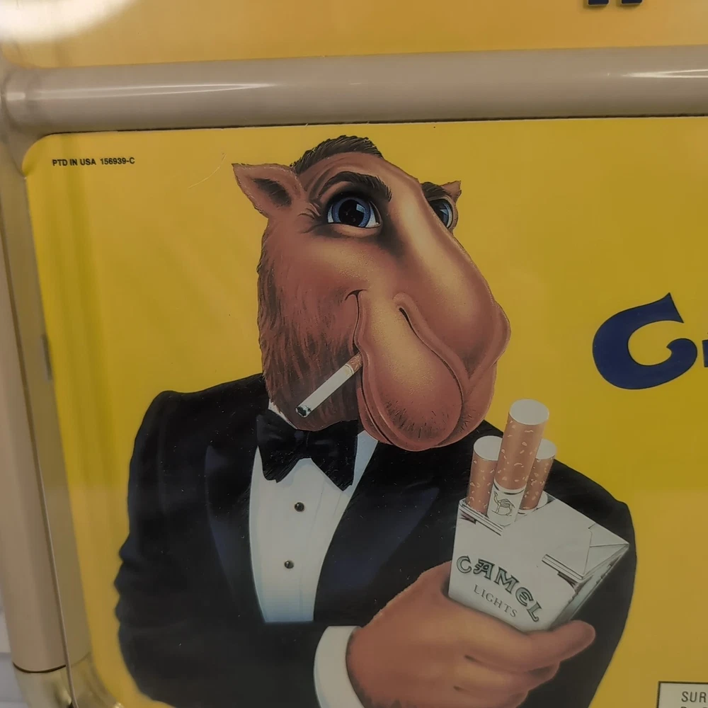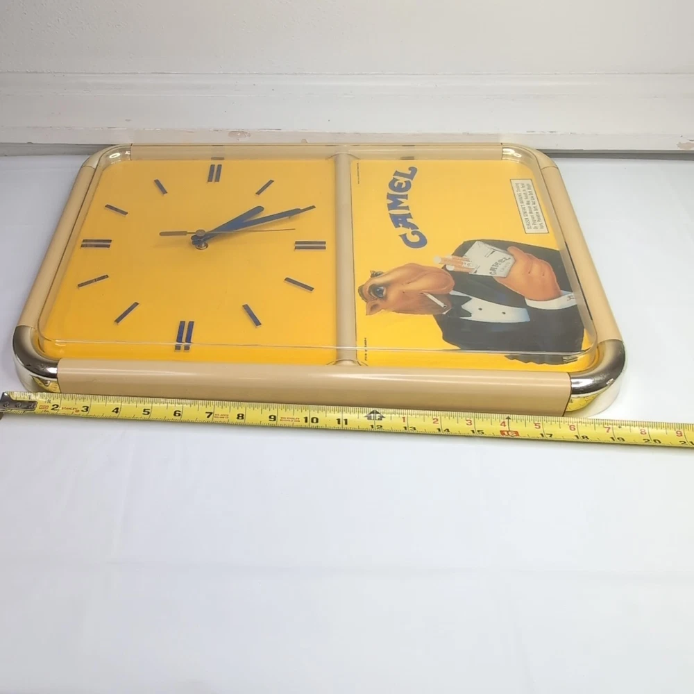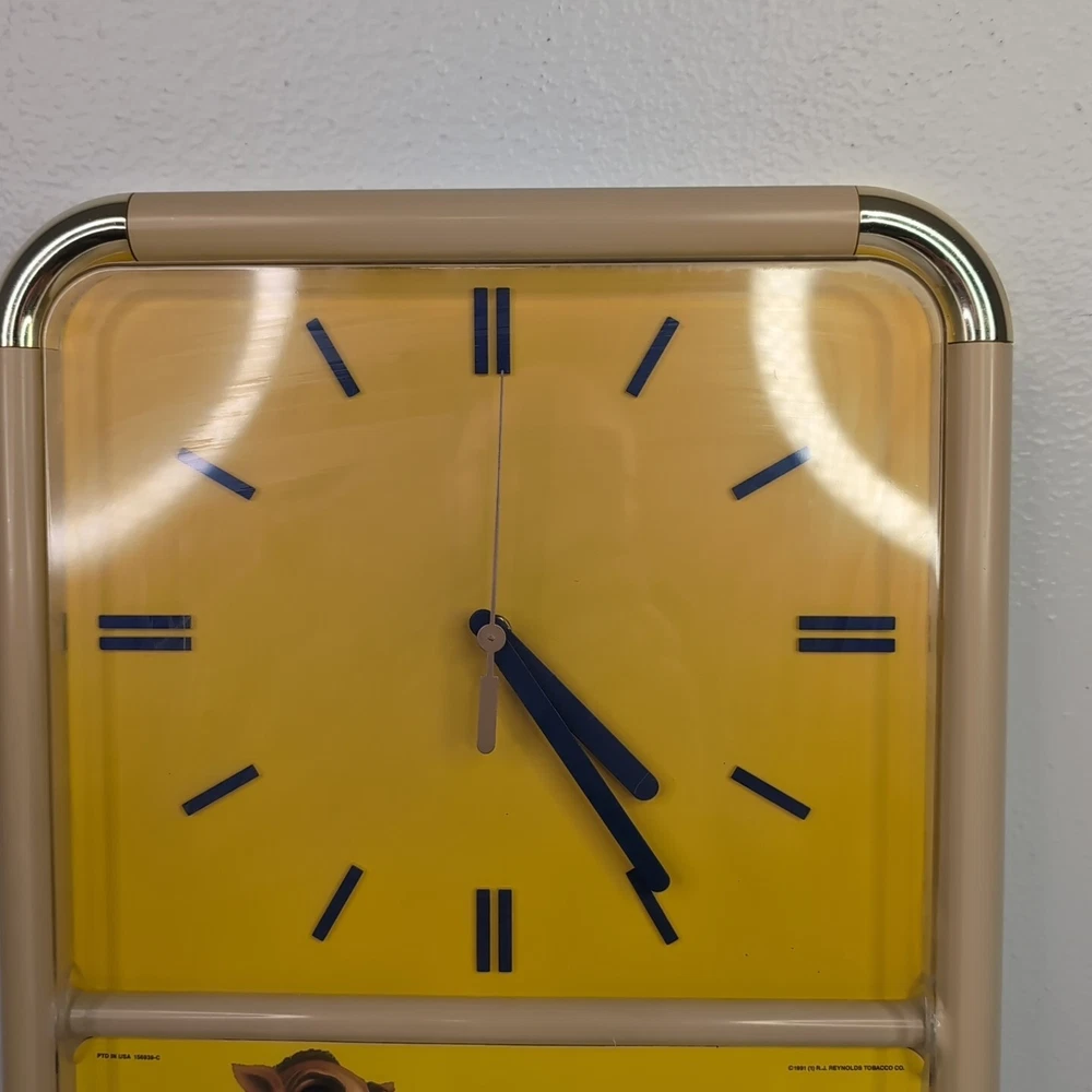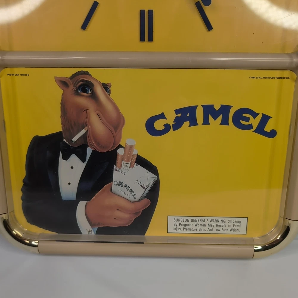 Vintage 1991 camel lights cigarettes advertising wall clock. Used condition with some scratches and dark marks. Works well, keeps time pretty good.