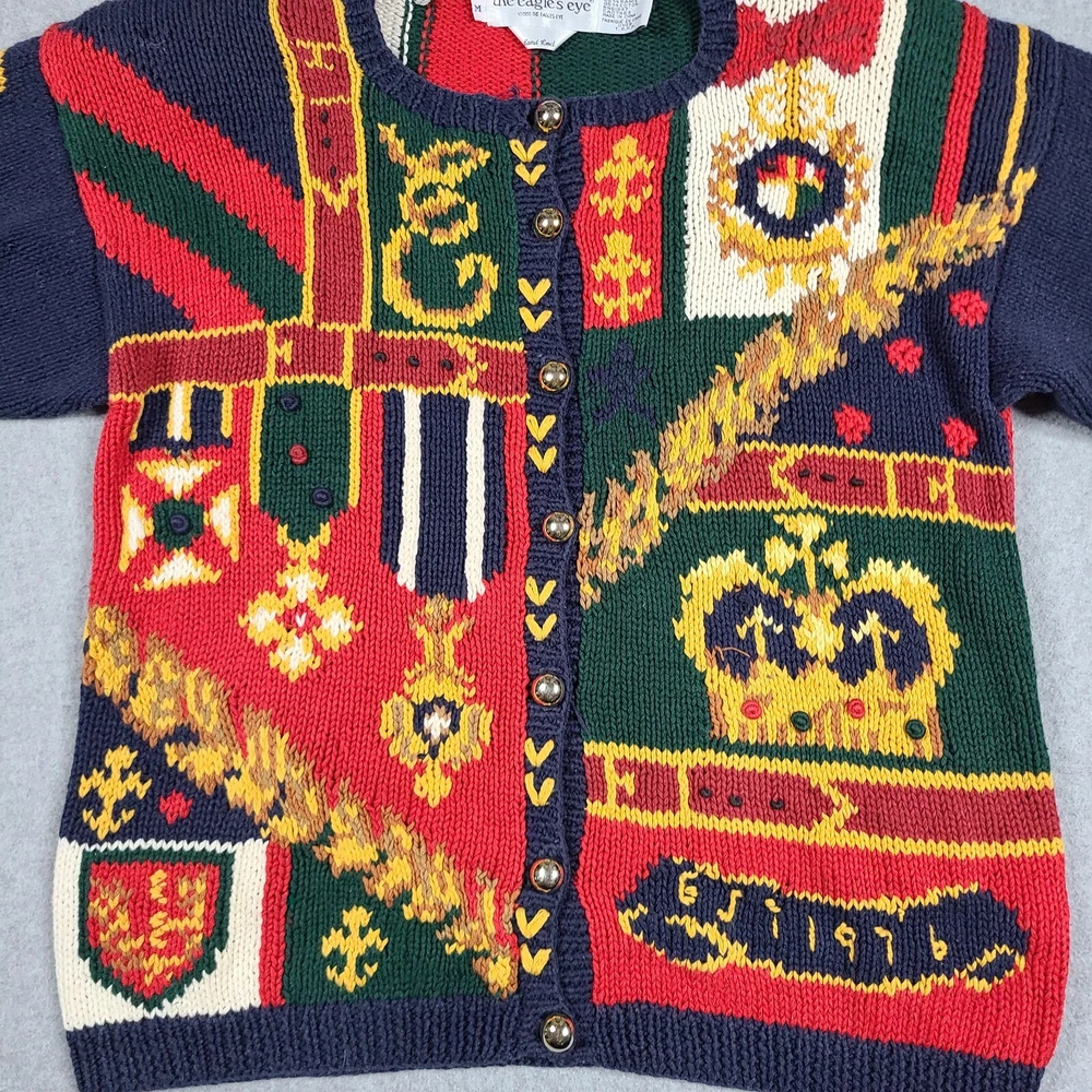 Small hole in front. Please see ALL pictures before purchasing. This vintage 1991 Eagles Eye Crown Royalty hand knit sweater cardigan is a must-have for any fashion-savvy woman. With its colorful, 90s-inspired design and heavyweight, shoulder-padded construction, this sweater is perfect for any occasion. The round neckline and collarless style add a touch of sophistication, while the button accents and knit fabric type give it a unique, vintage feel. Made from a blend of ramie and cotton materials, this sweater is easy to care for and should be hand washed only. It comes in a size M, with a regular fit and long sleeves. This sweater is perfect for anyone looking for a comfortable, stylish, and unique piece of clothing.
