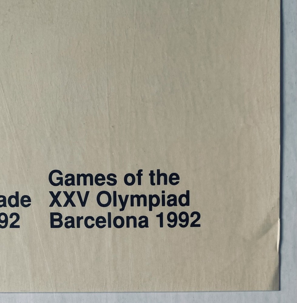 This original poster belongs to a set created by artists for the Barcelona 92 Olympic Games. Jean-Michel Folon (1 March 1934 – 20 October 2005) was a Belgian artist, illustrator, painter, and sculptor The first exhibition of his watercolors was in New York in 1969 in the Lefebre Gallery. One year later he exhibited in Tokyo and in the Il Milione gallery in Milan. He also participated in the XXVth Venice Biennale. In 1973 he joined the selection of Belgian artists in the XXVth São Paulo Biennale, where he was granted the Grand Prize in Painting. Over the years his work concentrated on different techniques, including watercolor, etching, silkscreen, illustrations, mosaics, and stained glass, which showed the diversity of his art. His work Ein Baum stirbt - Un albero muore, 1974, is by Museo Cantonale d’Arte [de] of Lugano. He also designed numerous posters, often for humanitarian causes. Around 1988 he created his first sculptures made out of wood. He then moved on to creating sculptures in clay, plaster, bronze and marble, while continuing to paint. Several museums dedicated exhibitions to him, among them the Musée des Arts Décoratifs in Paris in 1971, the Museum Boijmans Van Beuningen in Rotterdam in 1976, the Institute of Contemporary Arts in London in 1977, the Musée Picasso in Antibes in 1984, the Museo Correr in Venice in 1986, the Museo de Bellas Artes in Buenos Aires in 1987, the Metropolitan Museum of Art in New York in 1990, La Pedrera in Barcelona in 1993, the Bunkamura in Tokyo in 1995, the Olympic Museum in Lausanne in 1996 and the Museo Morandi [it] in Bologna in 1996–97. In 1999 an exhibition of large sculptures was presented in the Galerie Guy Pieters, in Saint-Paul de Vence. In 2000 he opened the Fondation Folon, which presents the essentials of his work in the region he grew up in. In 2001 the city of Lisbon held a large retrospective of his sculptures in the Castelo de São Jorge, which dominates the city. In 2003 he created the designs for Puccini's La Bohème for the Puccini Festival in Italy. The president of the French Republic, Jacques Chirac, awarded him the Legion of Honour in the Palais d'Elysée. In 2004 he became a UNICEF ambassador. In 2005 the city of Florence held a grand retrospective of his work at the Palazzo Vecchio and the Forte di Belvedere. Folon published his drawings in newspapers, mostly in the US, where he was recognized earlier than in Europe and illustrated books by Franz Kafka, Ray Bradbury, Jorge Luis Borges, Guillaume Apollinaire, Jacques Prévert, Boris Vian, Guy de Maupassant, Albert Camus, Herbert George Wells and Jean de La Fontaine. He never really changed his style, whose most famous emblem is the "bird-man" but used all kinds of supports; Folon made murals (Magic City for the Brussels subway, 1974; Waterloo Station for the London tube, 1975), posters for theater and opera (Spoleto Festival, 1978; Teatro Olimpicio, 1987) and cinema (The Purple Rose of Cairo, by Woody Allen, 1985), theater and opera scenery (Geneva and Brussels, 1981; Venice and Roma, 1989), short films for TV (opening and closing sections for the French channel Antenne 2, 1975–1984), wooden sculptures, logotypes (Bicentenary of the French Revolution, 1989; Philexfrance, 1989), tapestries (Congress Hall of Monaco, 1989), ships (1990), church windows (1992), sculptures (La mer, ce grand sculpteur, Knokke, 1997), and even a Palio flag (Siena, 1999). His artistic value was recognized by several exhibitions organized in the most famous galleries and museums in the world (Musée des Arts Décoratifs, Paris, 1971; Arts Club of Chicago, 1972; Museum Boijmans Van Beuningen, Rotterdam, 1976; Transworld Art, Washington, D.C., 1977; Musée d'Art Moderne de Liège, 1978; Musée Picasso, Antibes, 1984; Correr Museum, Venice, 1985; Metropolitan Museum of Art, New York, 1990; La Pedrera, Barcelona, 1993; Bunkamura Museum, Tokyo, 1995; Olympic Museum, Lausanne, 1996). He credits Giorgio Soavi for publishing his first posters, which were designed for Olivetti in Milan: "As he has done for many artists, Soavi suggested to me, too, that I invent things that were out of the ordinary for me. This attitude has created such a fertile spirit of invention around him that one wonders if he is not the true author of the works that he has thus encouraged. Soavi also was largely responsible for the 1975 book Lettres a Giorgio, which reproduces 40 envelopes, each an original watercolor addressed to Soavi—most to his Milan home—and delivered by the mail from various international addresses. Folon writes in a brief Afterword: "We build in our dreams a monument to the unknown postmen to thank them all for having allowed these images to reach their destination. He created a famous piece of television that was screened in France for almost 30 years. It was first made for the Italiques TV show, by Marc Gilbert (in French), which aired from 1971 to 1974. The music, originally the soundtrack of Gott mit uns, was composed by Ennio Morricone. In the 1990s, Folon decided to create a foundation in the Solvay Castle, La Hulpe. In 2005, under the direction of Marilena Pasquali, Fabio Mochi organised the exhibition of Jean-Michel Folon in Florence which six years later gave rise to the creation of the permanent Folon exhibition in the Giardino delle Rose (Rose Garden) in Florence. Another piece of television quite famous and remembered is a commercial about methane for SNAM. The 1992 Summer Olympics, officially known as the Games of the XXV Olympiad and commonly known as Barcelona '92, were an international multi-sport event held from 25 July to 9 August 1992 in Barcelona, Catalonia, Spain. Beginning in 1994, the International Olympic Committee decided to hold the Summer and Winter Olympics in alternating even-numbered years. 1992 was the last year in which both the Summer and Winter Olympics were staged.The 1992 Summer Games were the first since the end of the Cold War, and the first unaffected by 